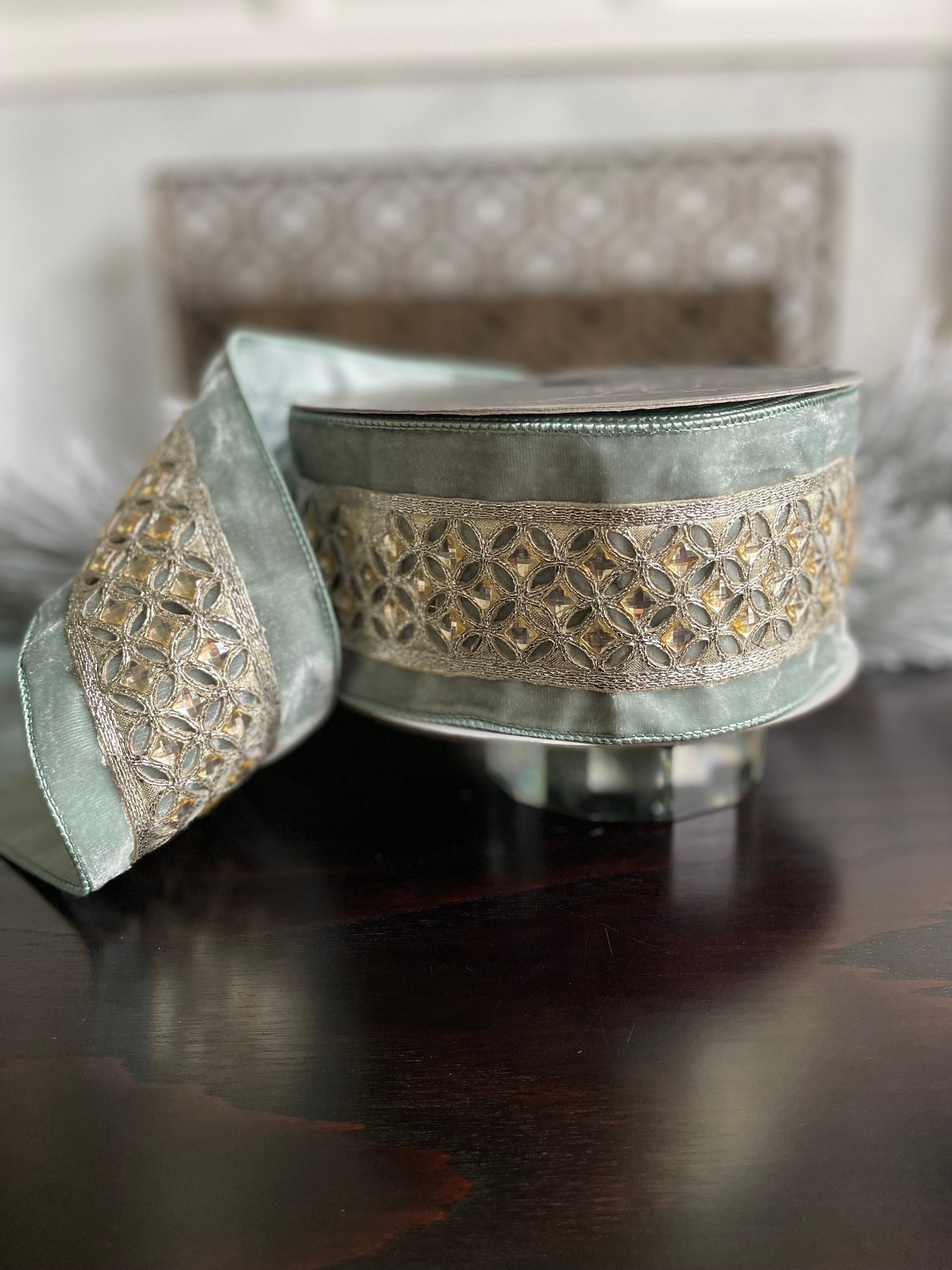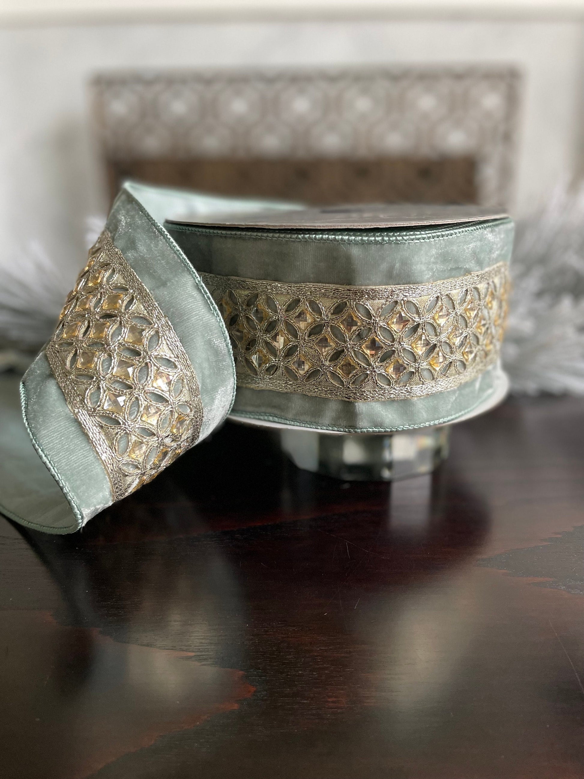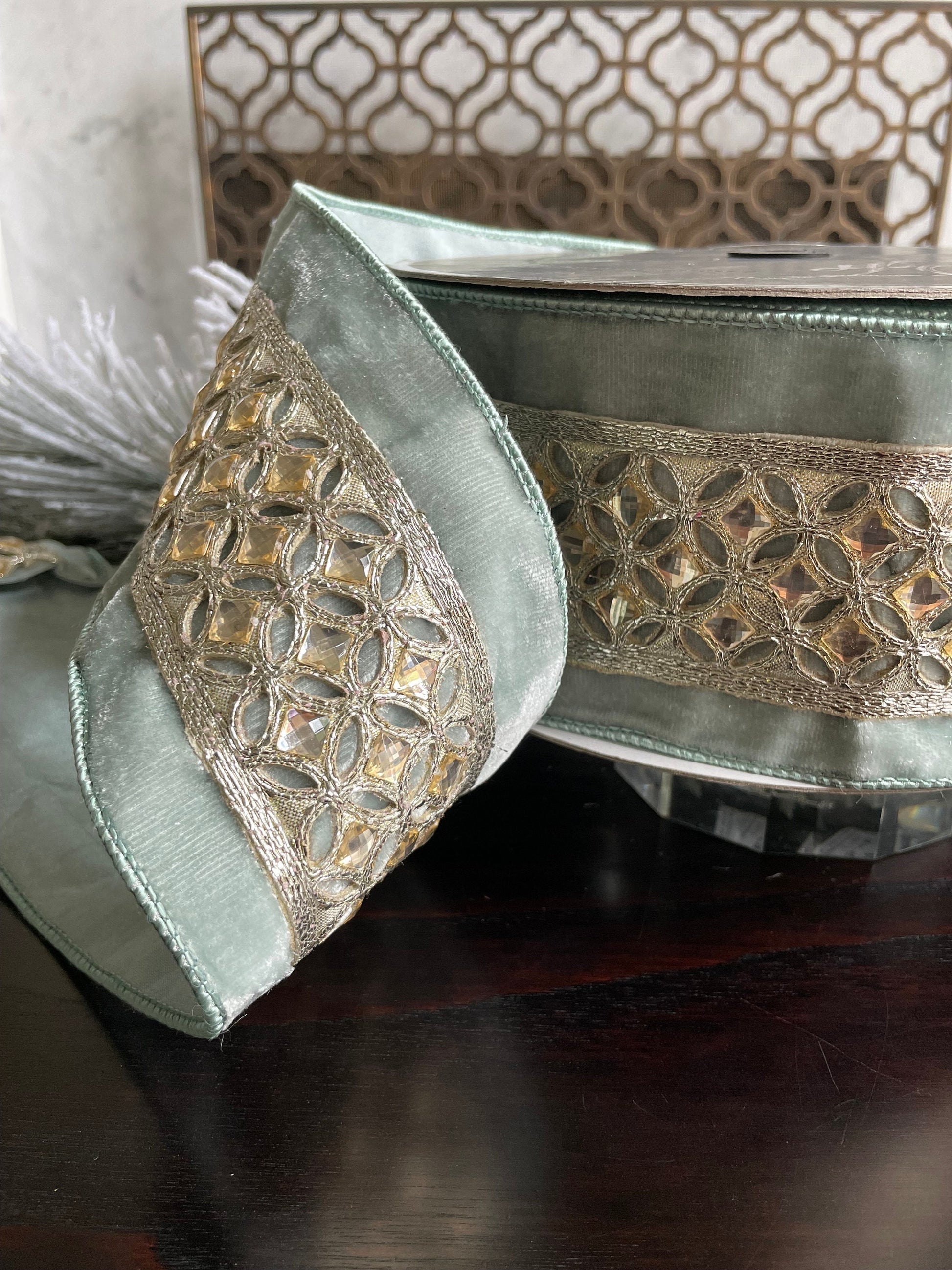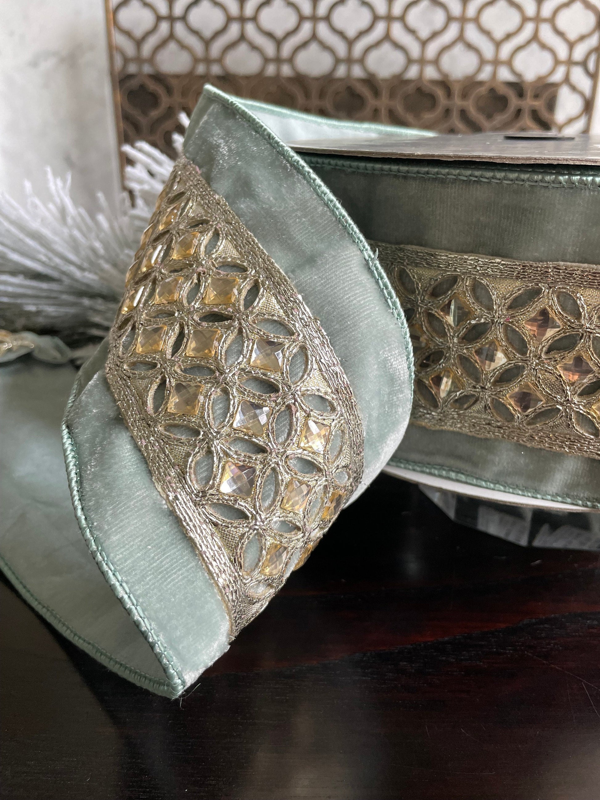 4” x 10 yds Designer light blue with platinum velvet diamond lace ribbon with jewels. Wired. Farrisilk.