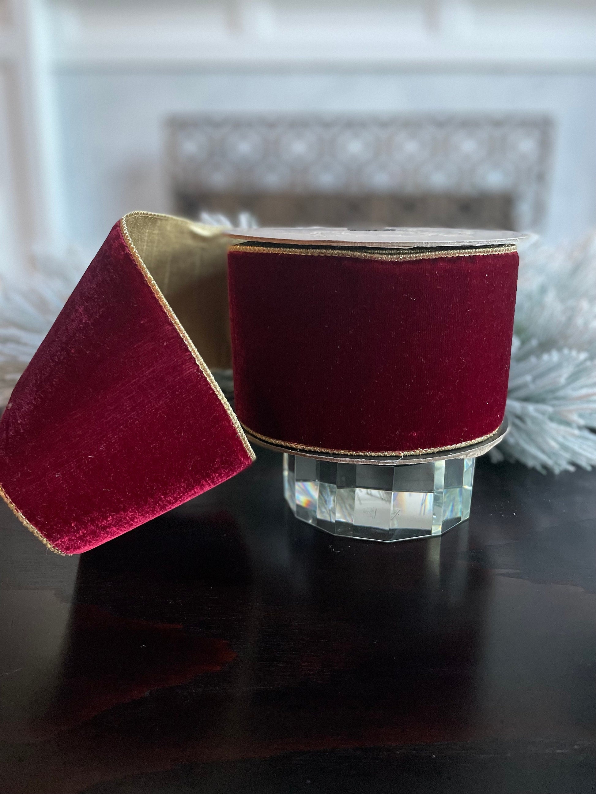 4” x 10 yds. Designer lush velvet ruby gold ribbon with light gold back.