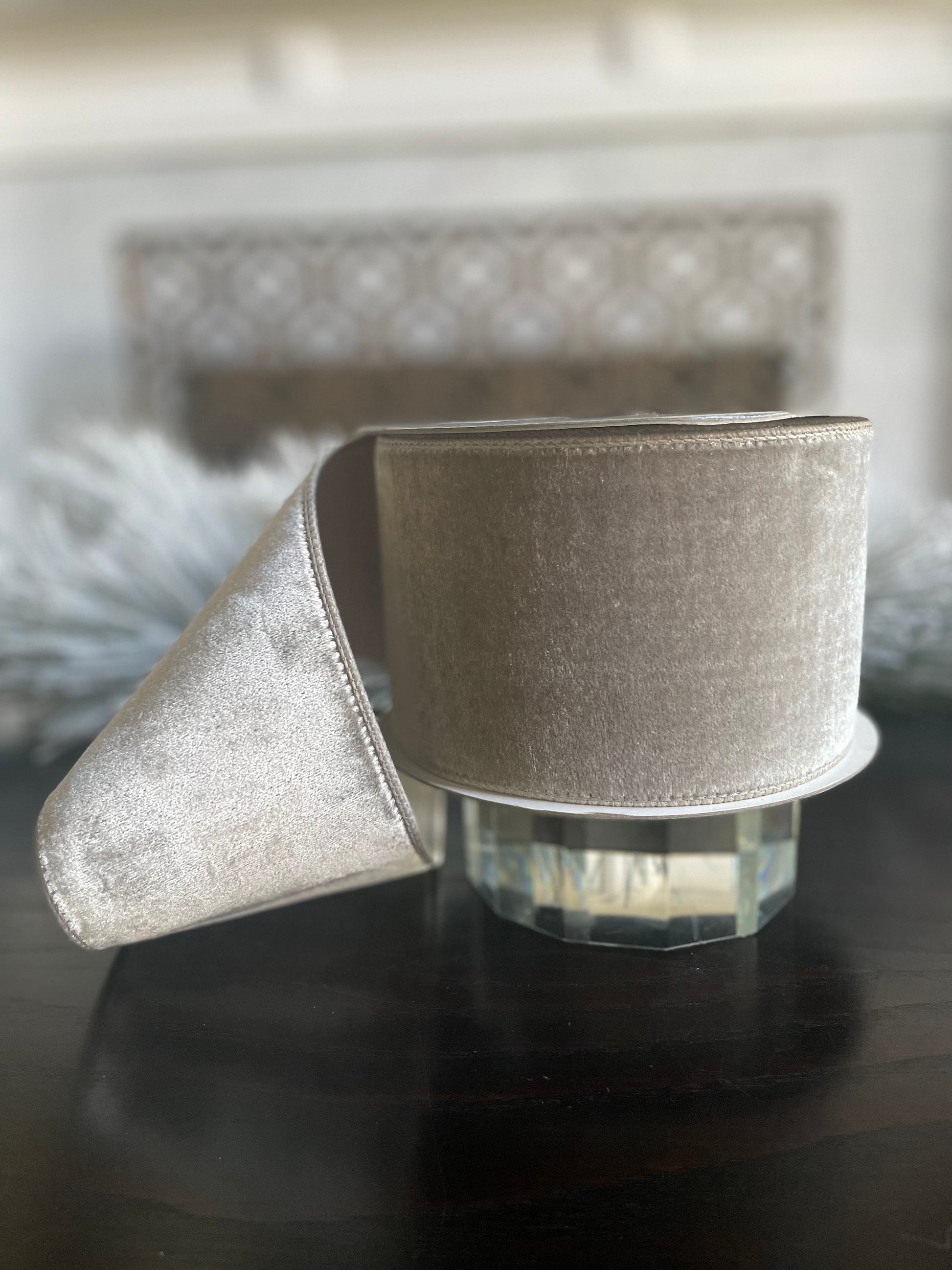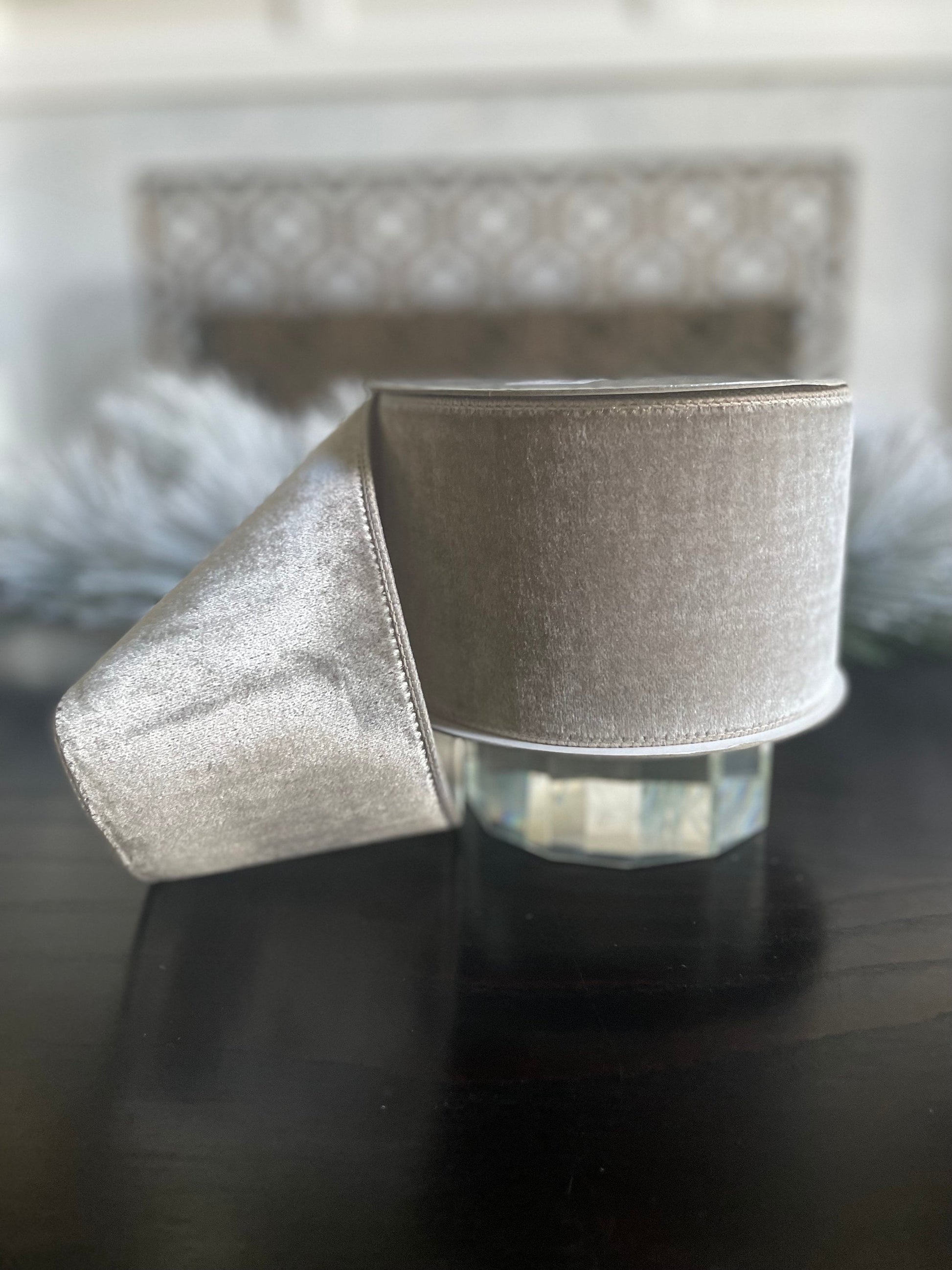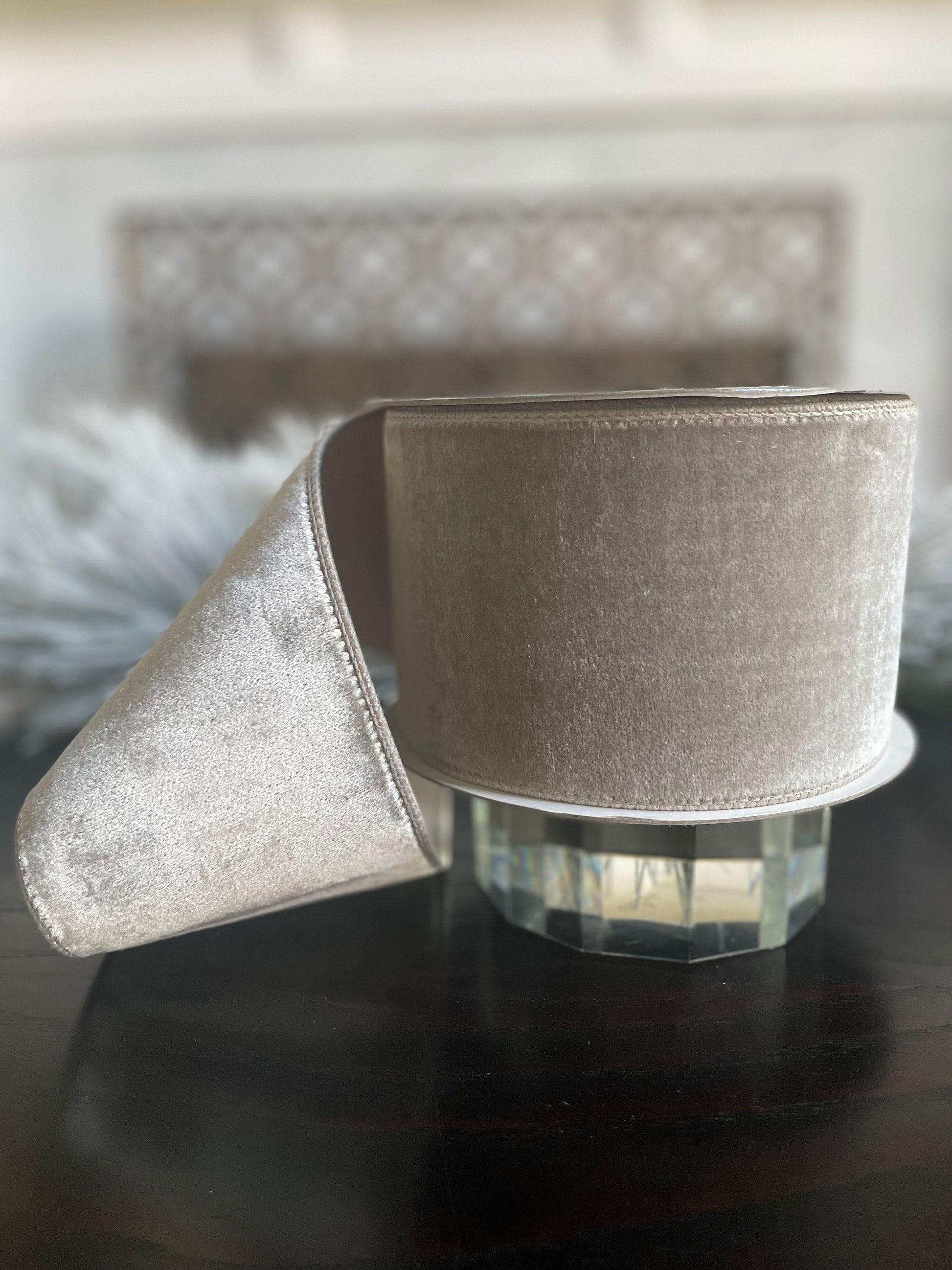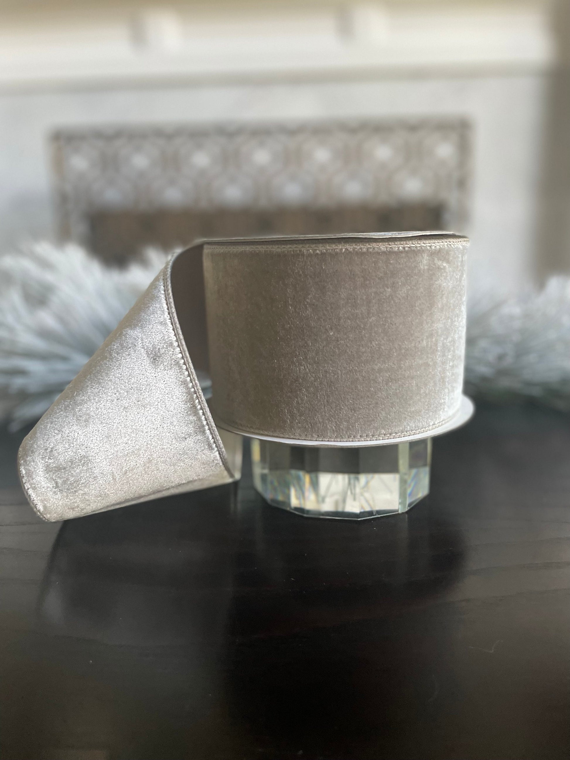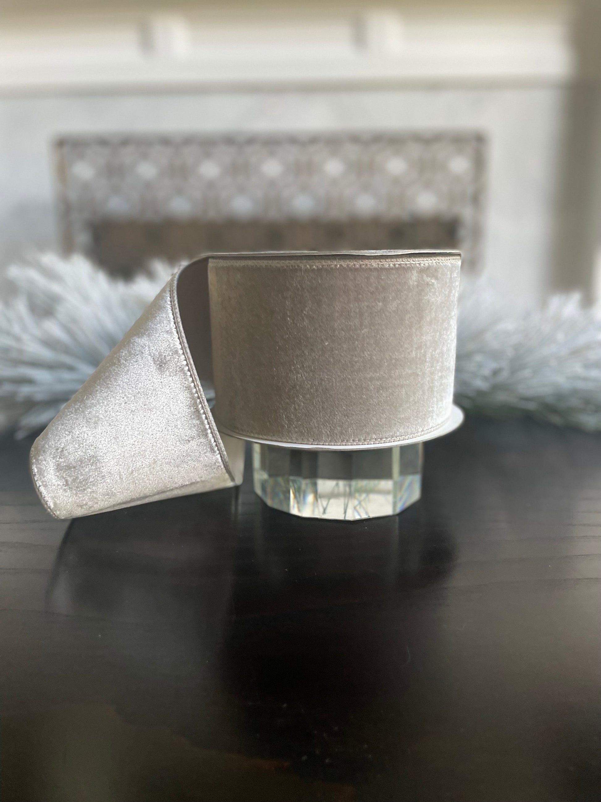 4” x 10 yds. Designer platinum velvet ribbon. Platinum back. Wired. Farrisilk.
