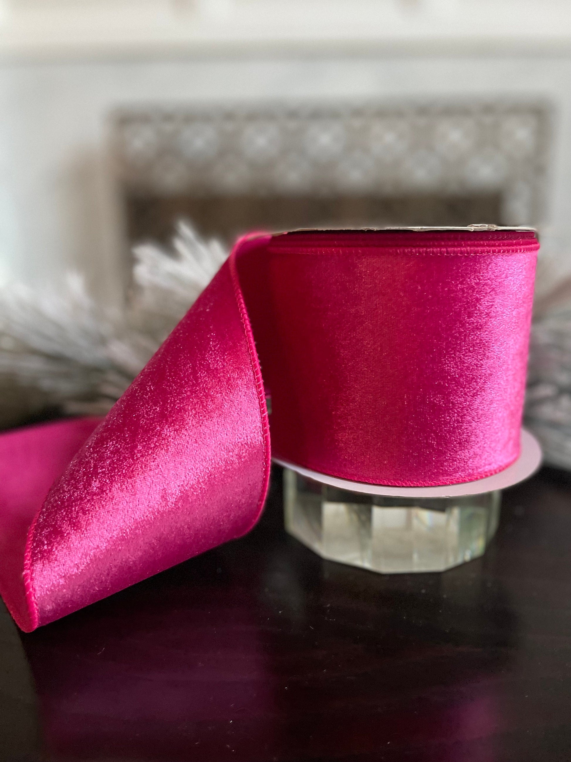 4” x 10 yds. Fuschia velvet with dupion back ribbon. Wired. Regency.