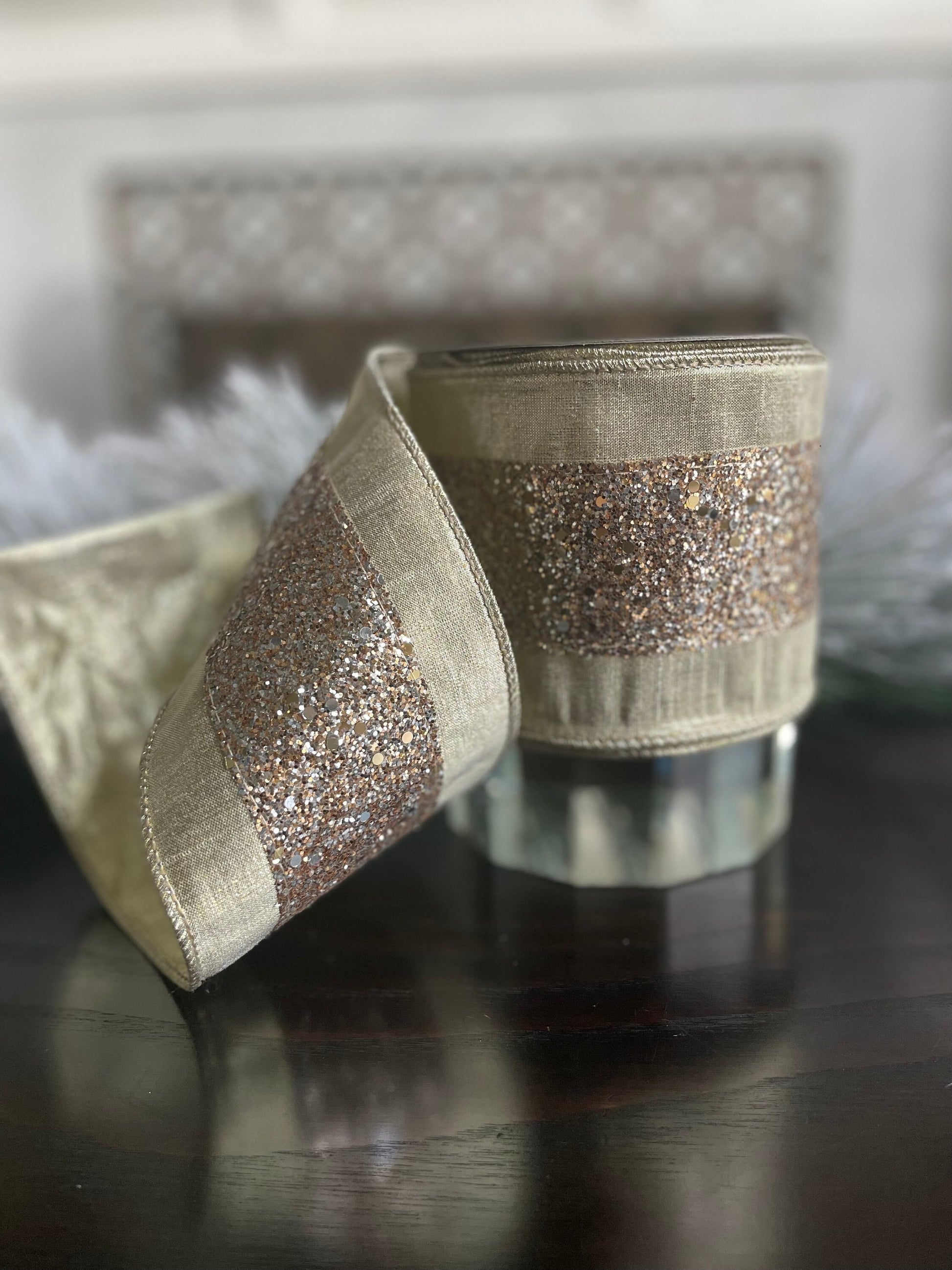 4” x 10 yds. Glitter trim platinum wired ribbon. Farrisilk.