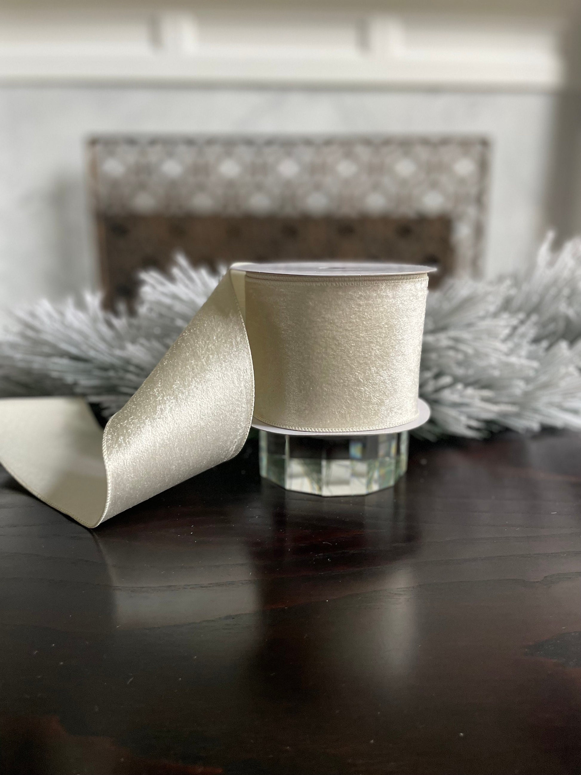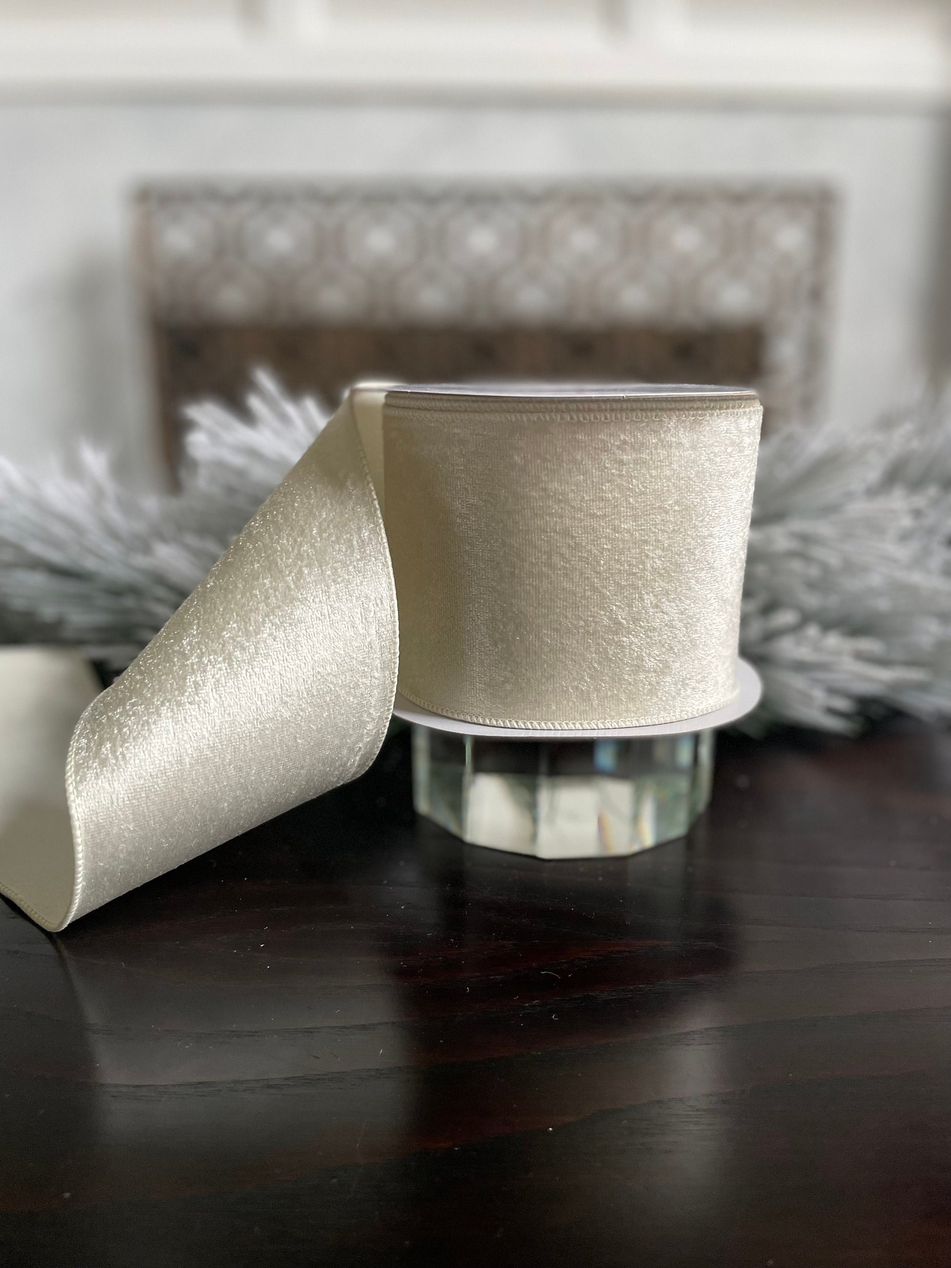 4” x 10 yds. Ivory velvet with dupion back ribbon. Wired. Regency.