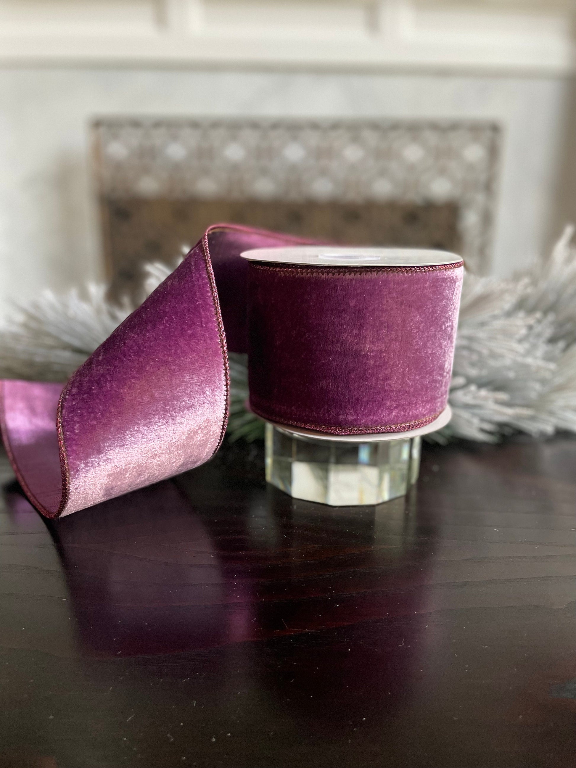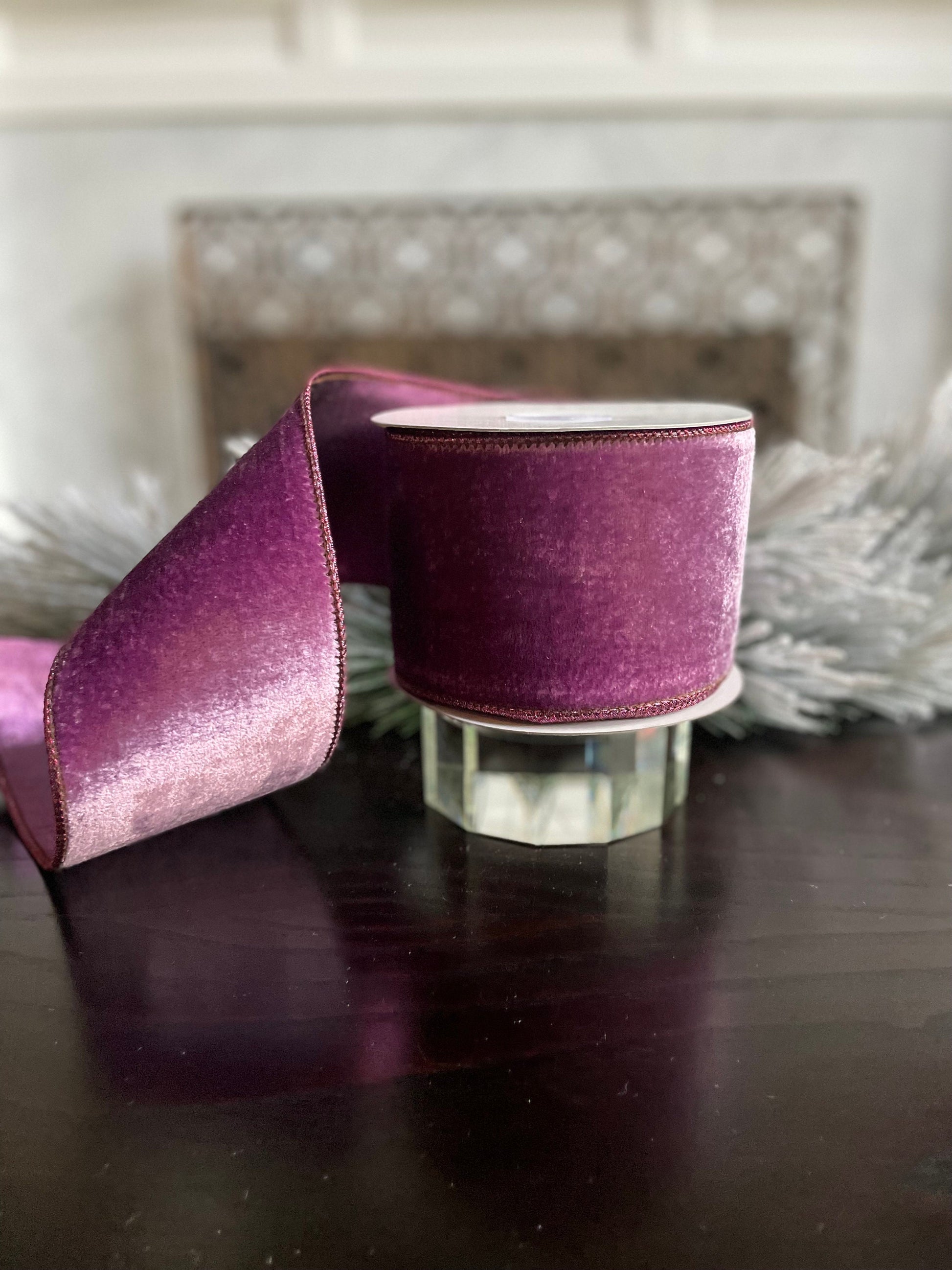 4” x 10 yds. Lavender crown velvet metallic back ribbon. Wired. Regency.