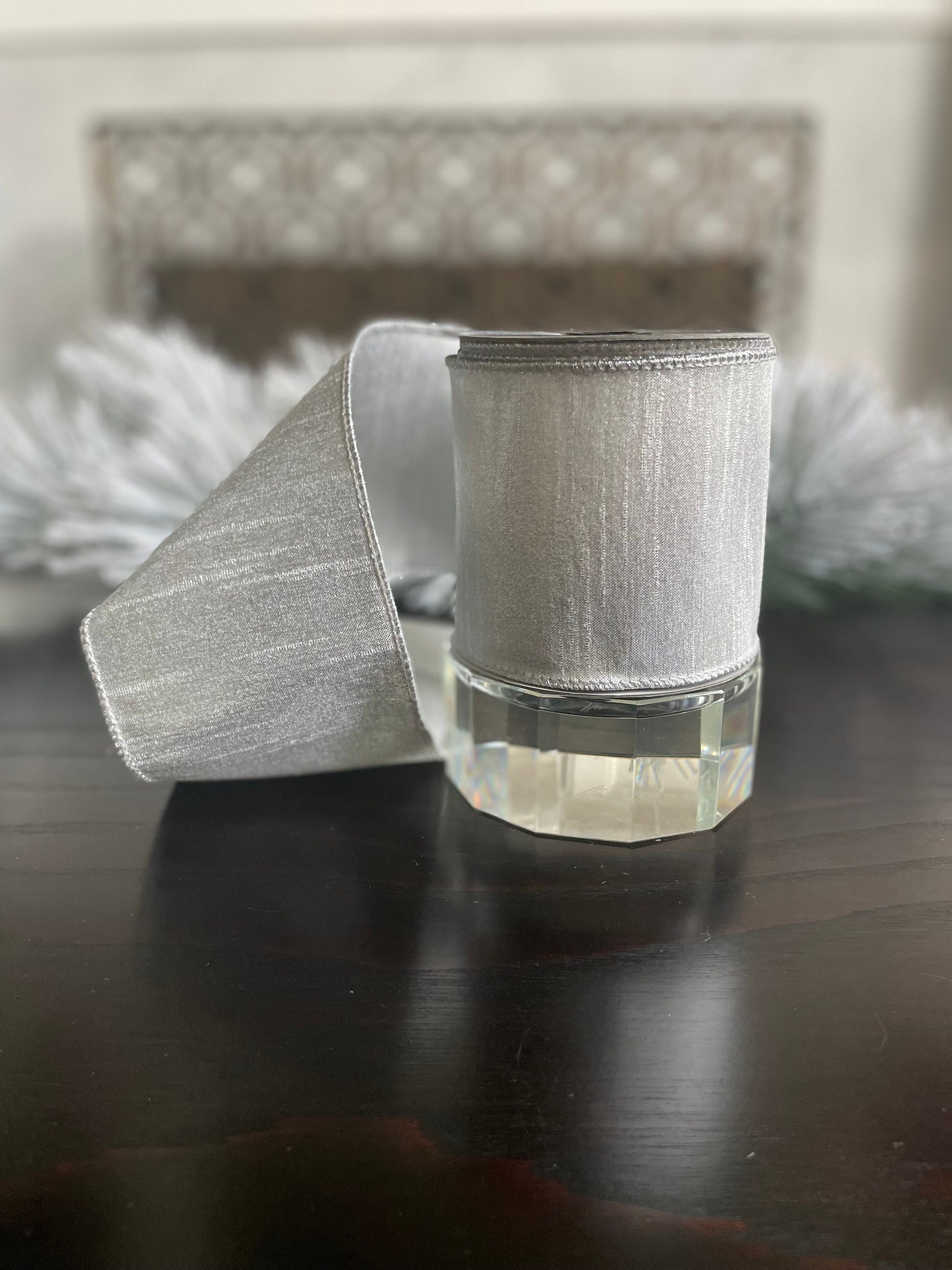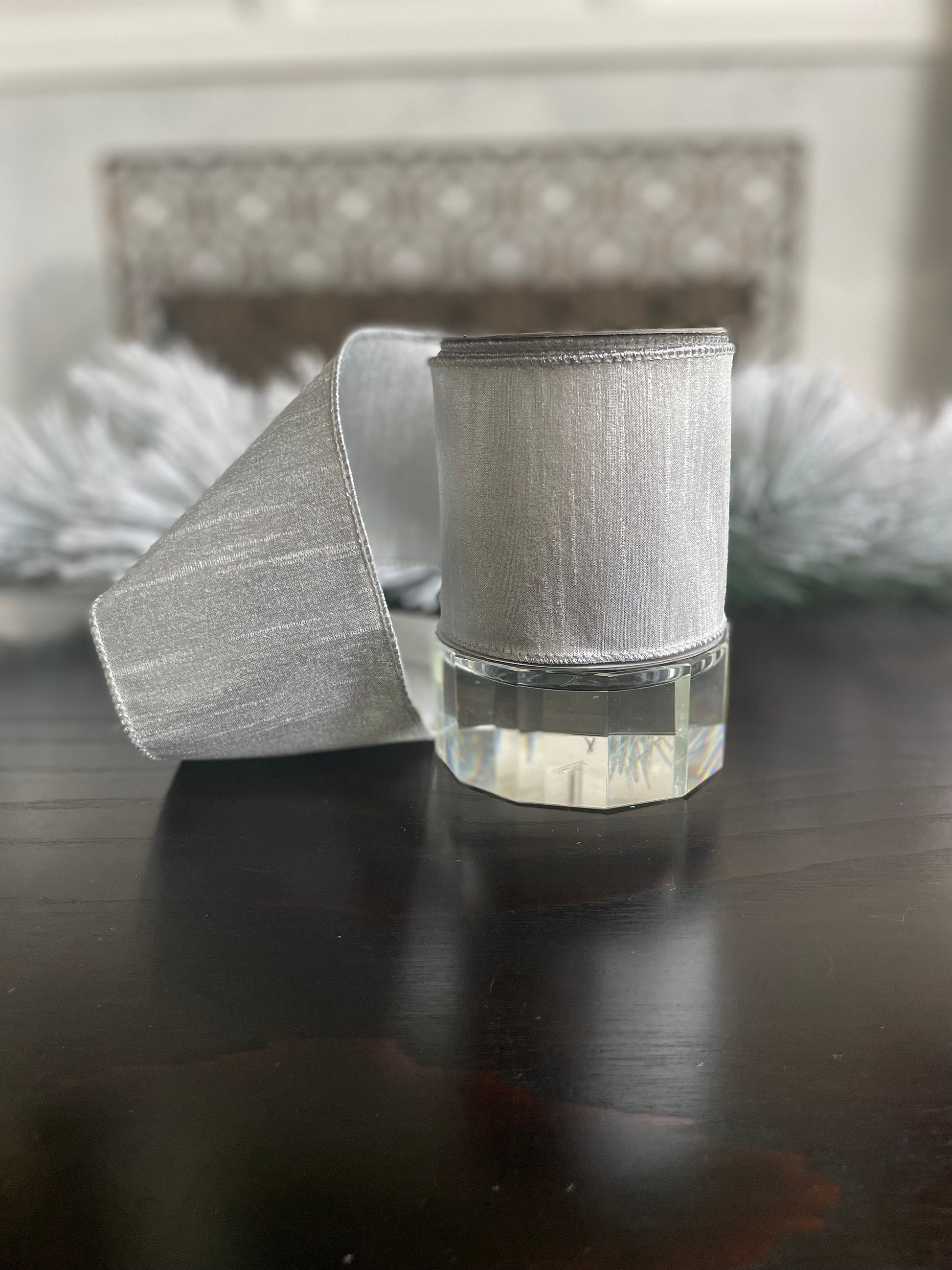 4” x 10 yds. Luster silver ribbon. Farrisilk. Wired.