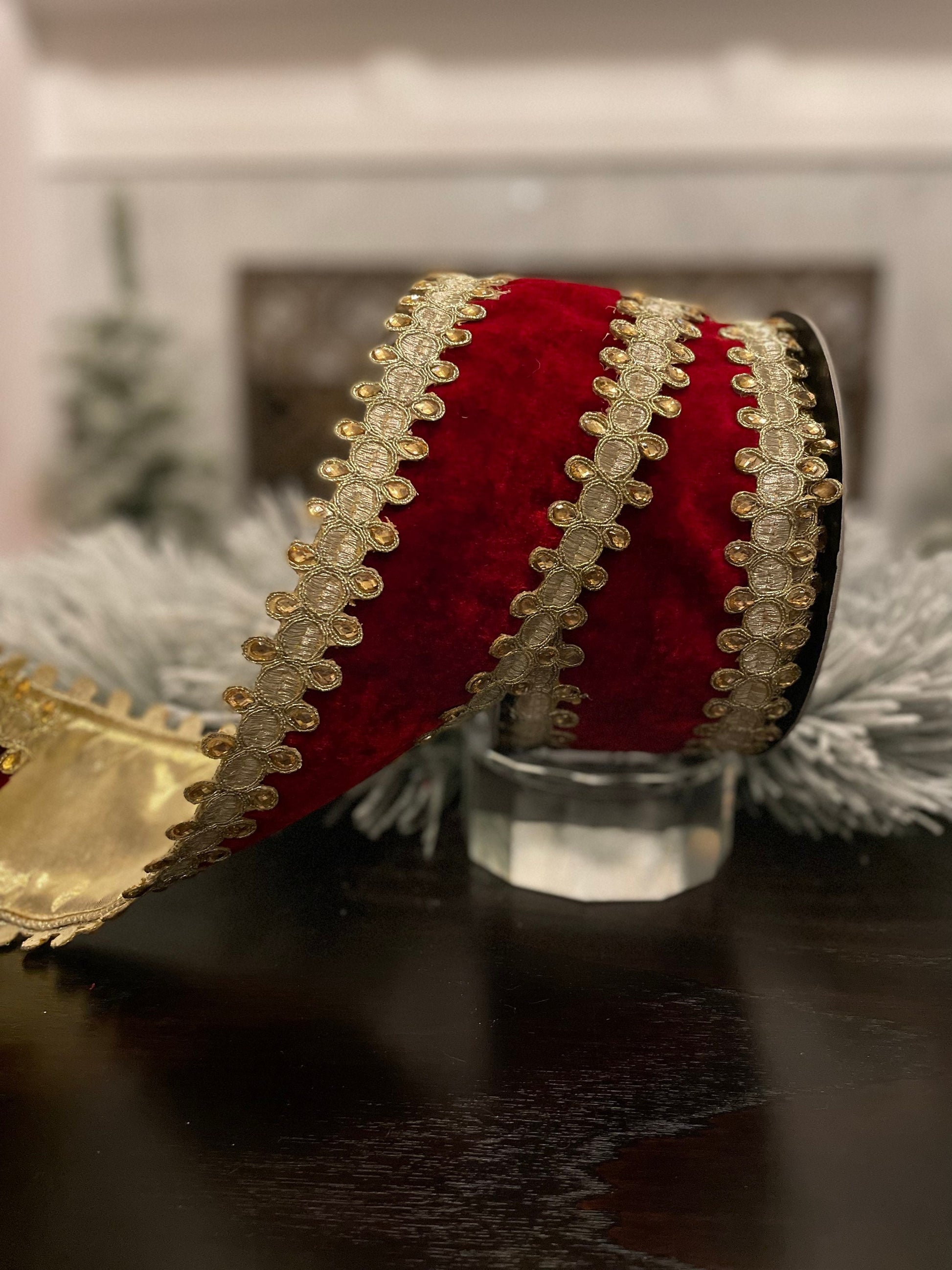 4” x 10 yds. Velvet jewel trim red ribbon. Wired. D. Stevens.* Gorgeous!