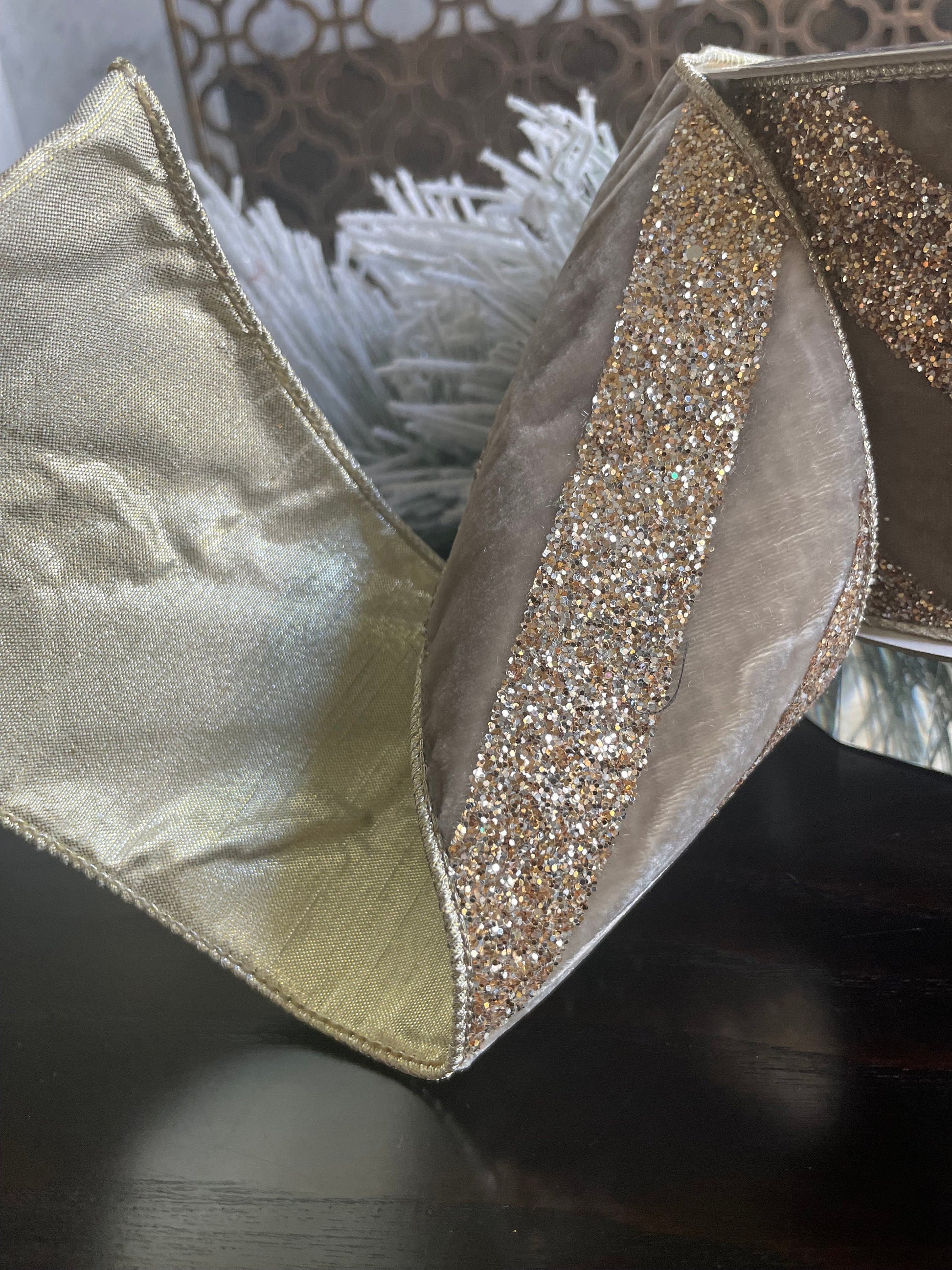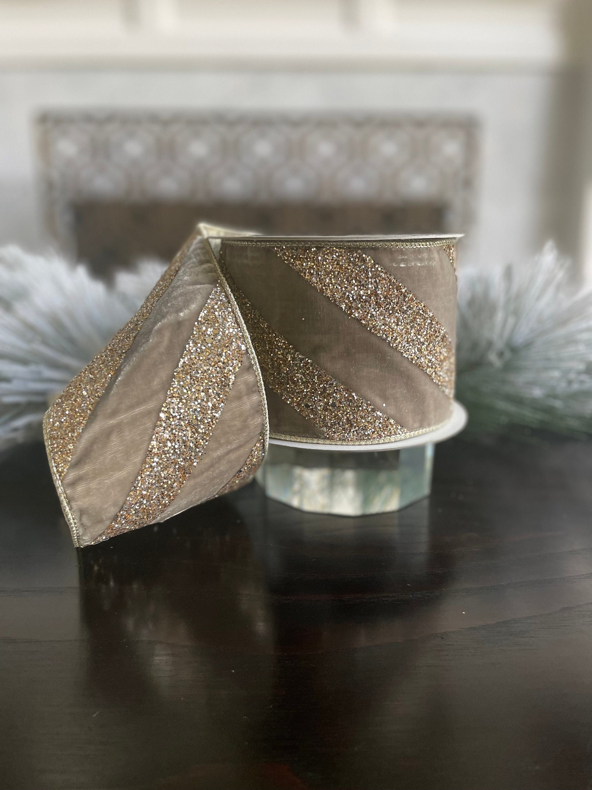 4” x 5 yds. Chunky stripes platinum glitter wired ribbon. Farrisilk.