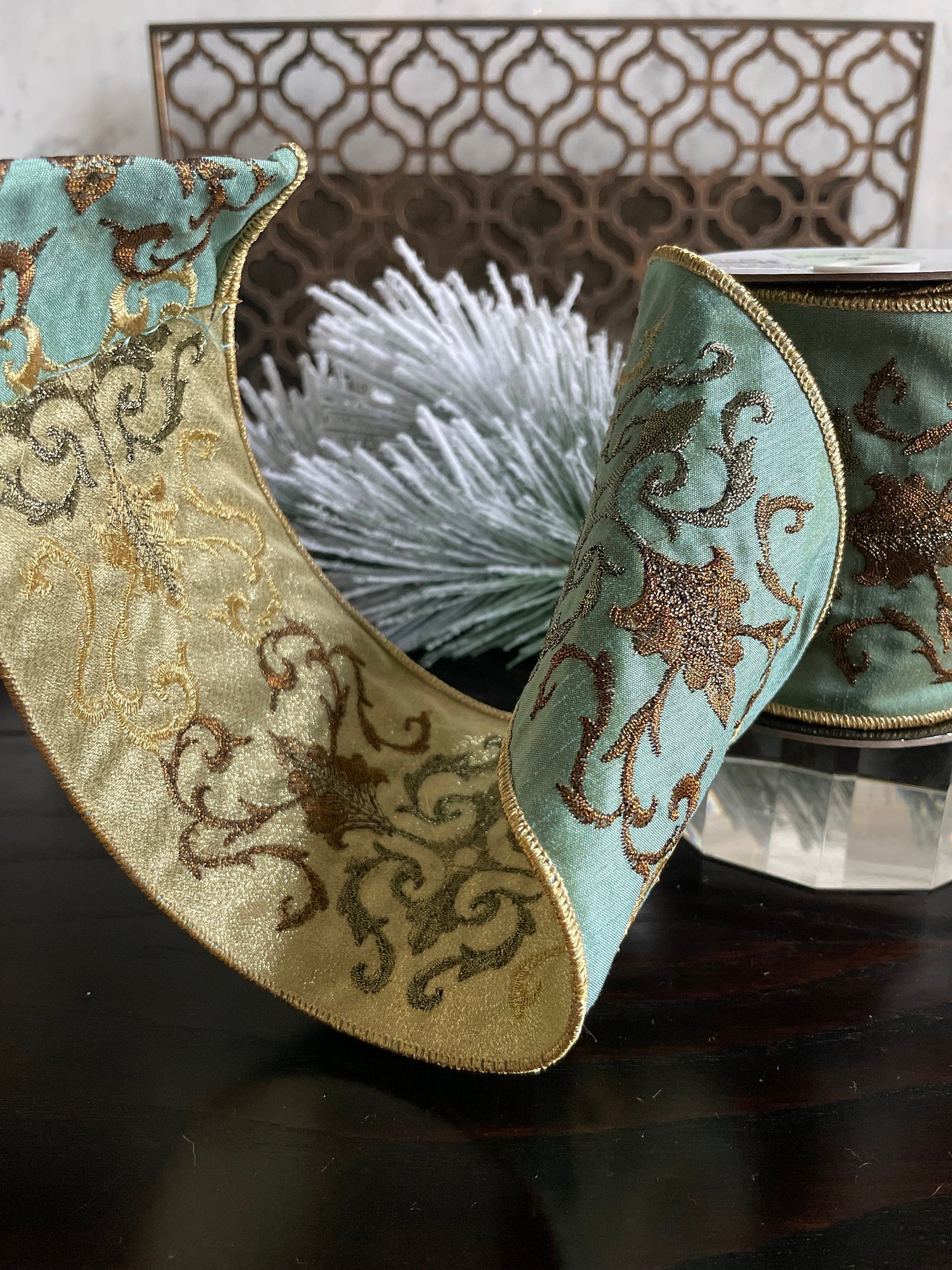 4” x 5 yds. Designer aqua and gold embroidered leaf filigree ribbon. Wired. Regency.