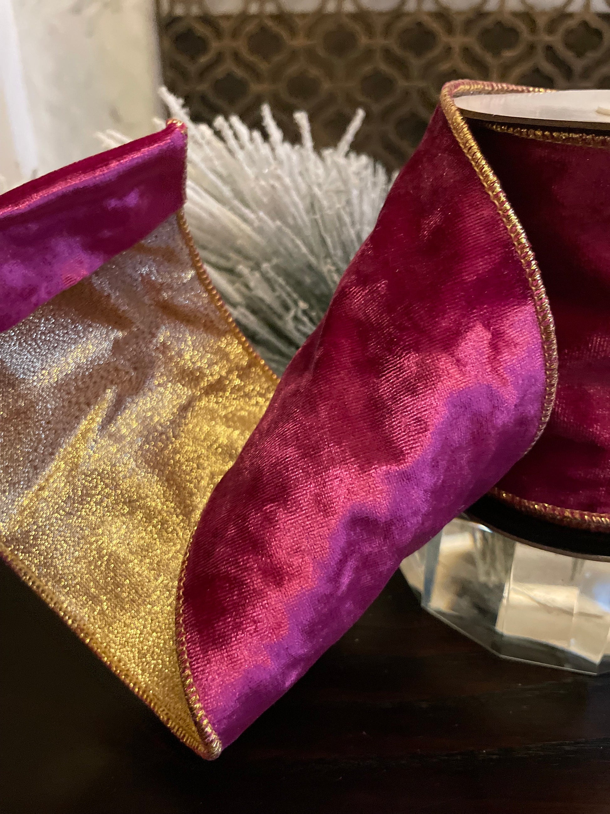 4” x 5 yds. Designer fuschia luxury textured velvet ribbon. Wired. Regency.