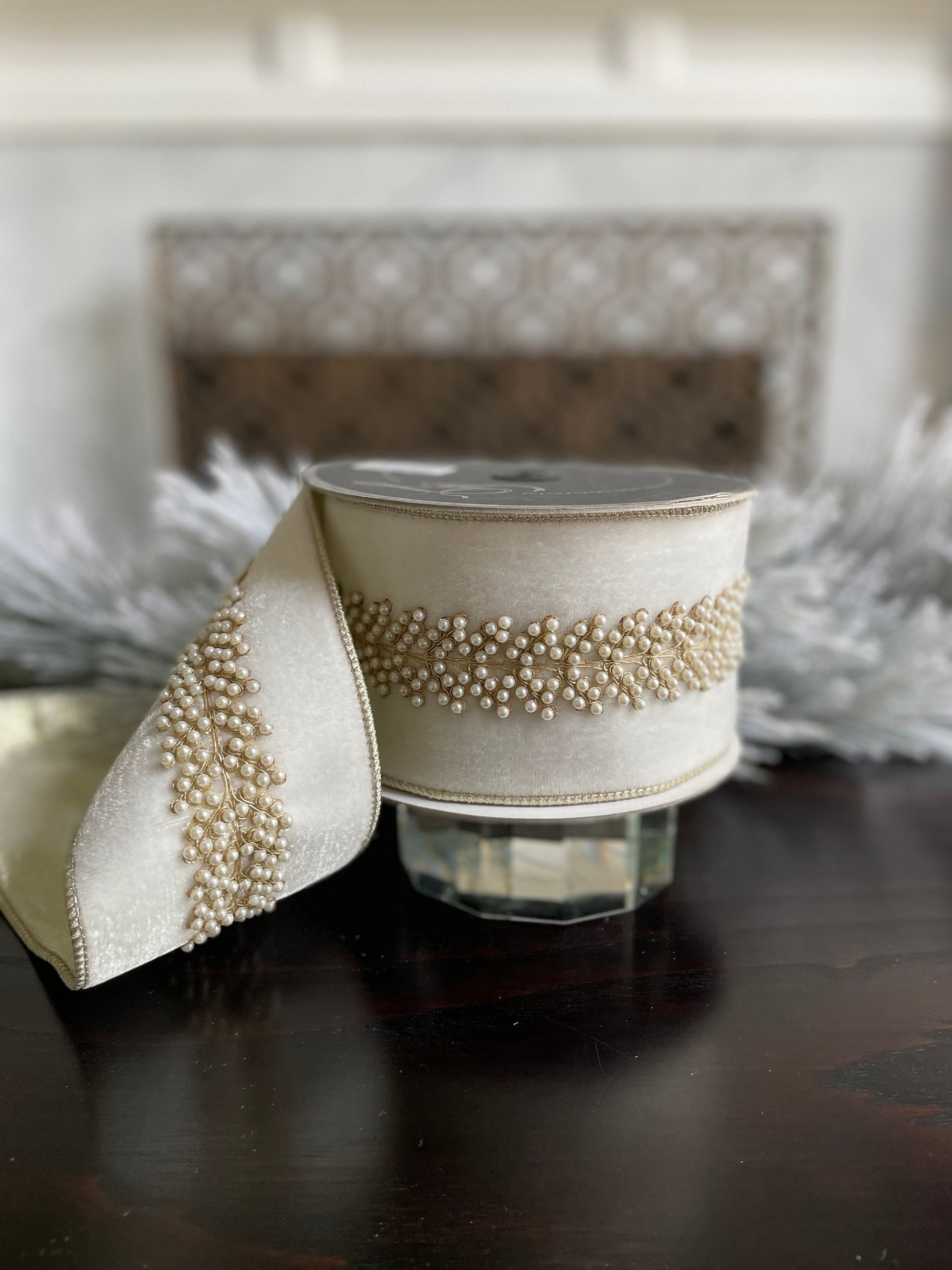 4” x 5 yds. Designer ivory royal pearl vine velvet ribbon. Wired. Farrisilk.