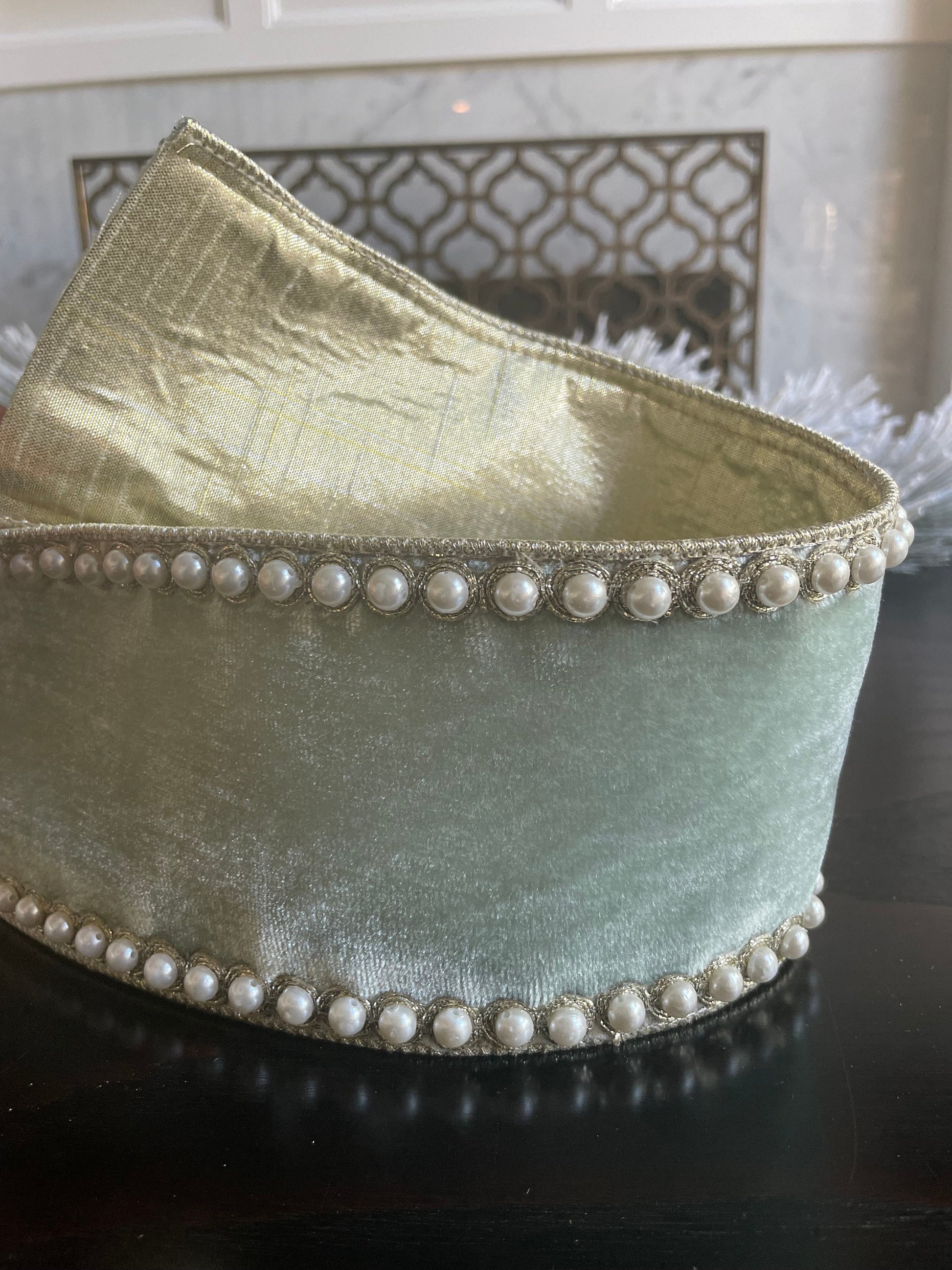 4” x 5 yds. Designer pearl borders light blue velvet wired ribbon.