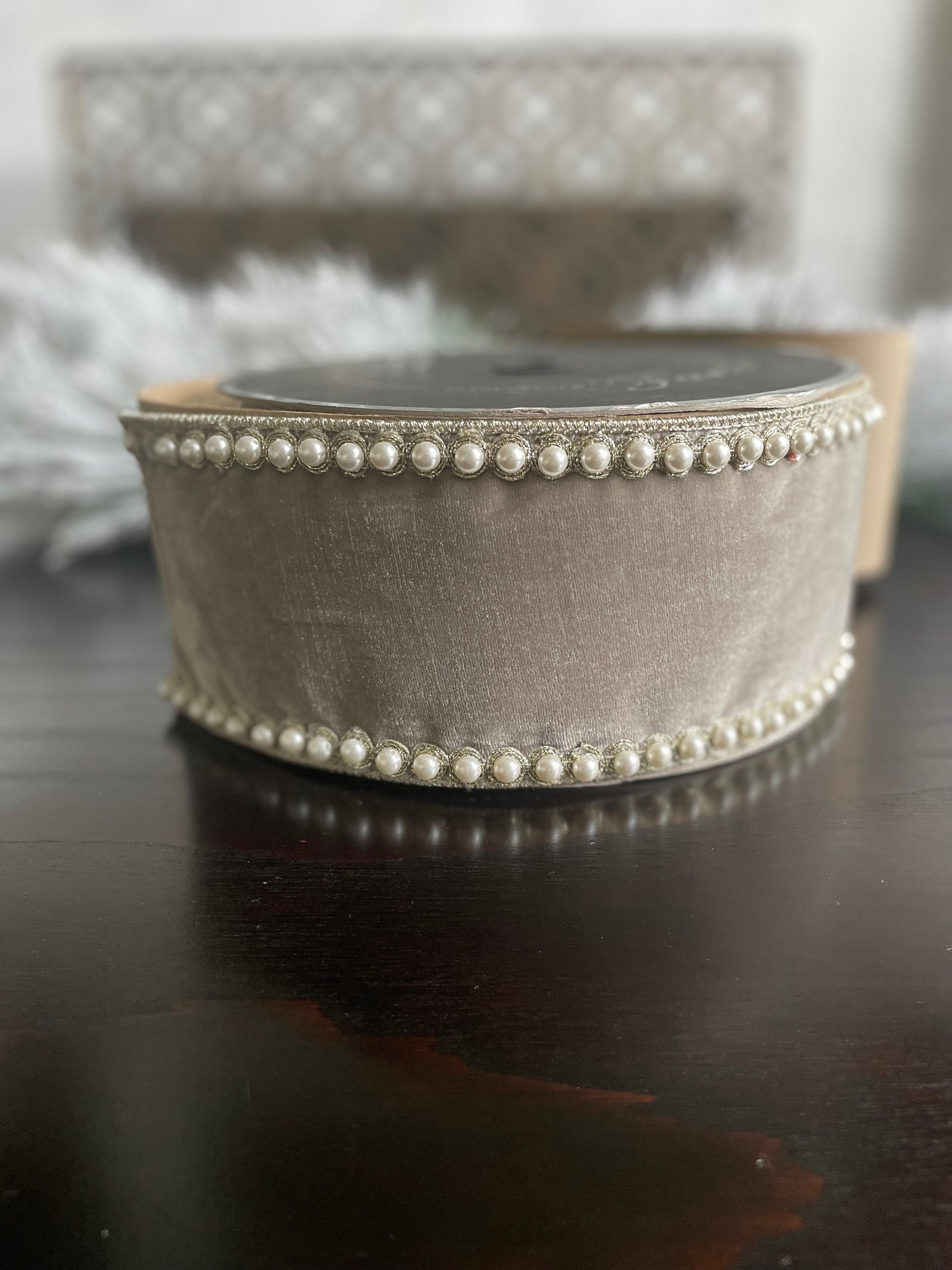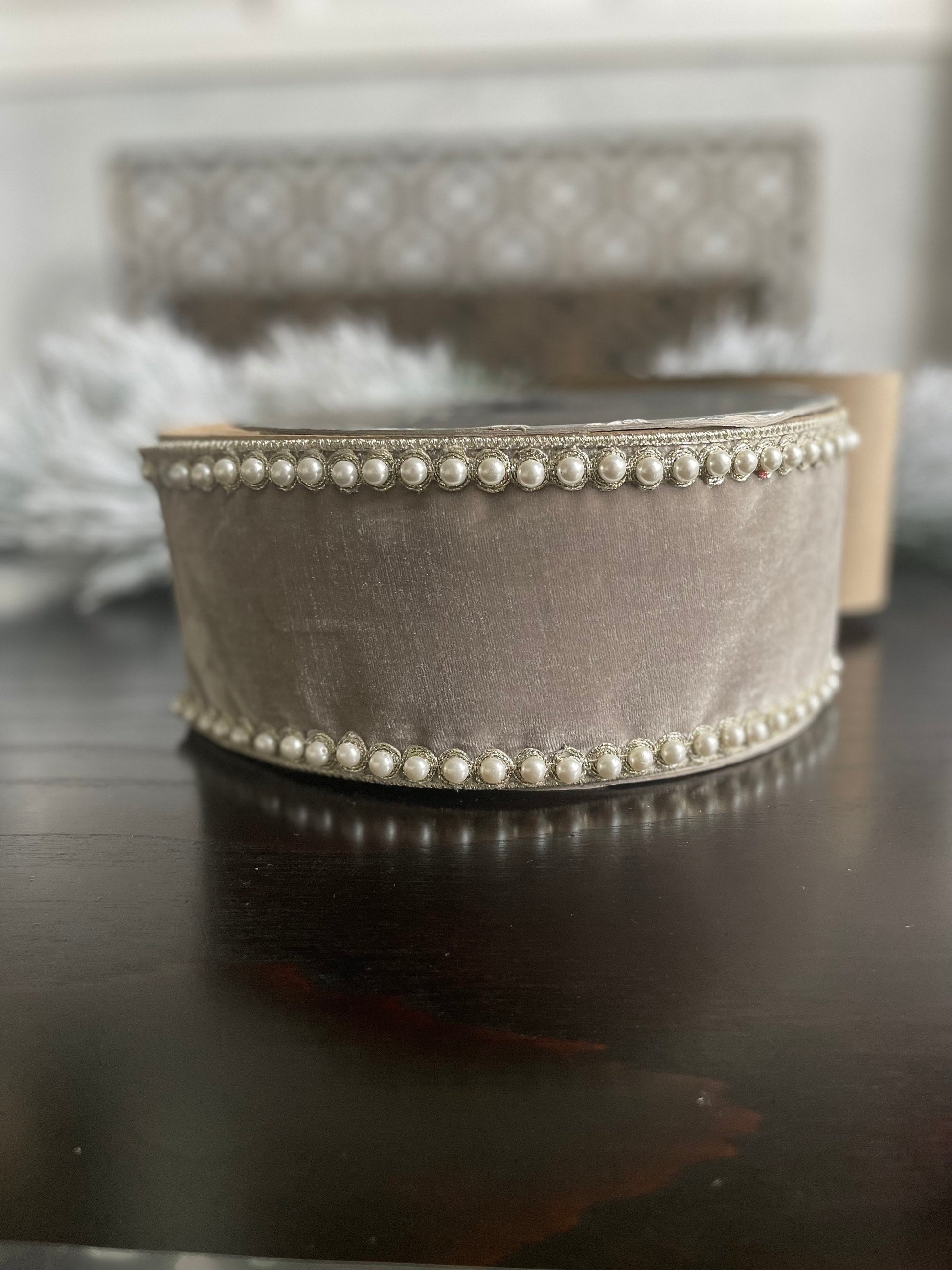 4” x 5 yds. Designer pearl borders platinum velvet wired ribbon.