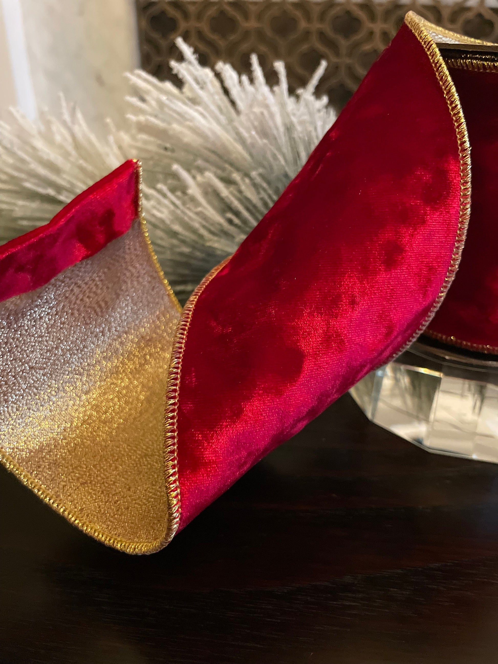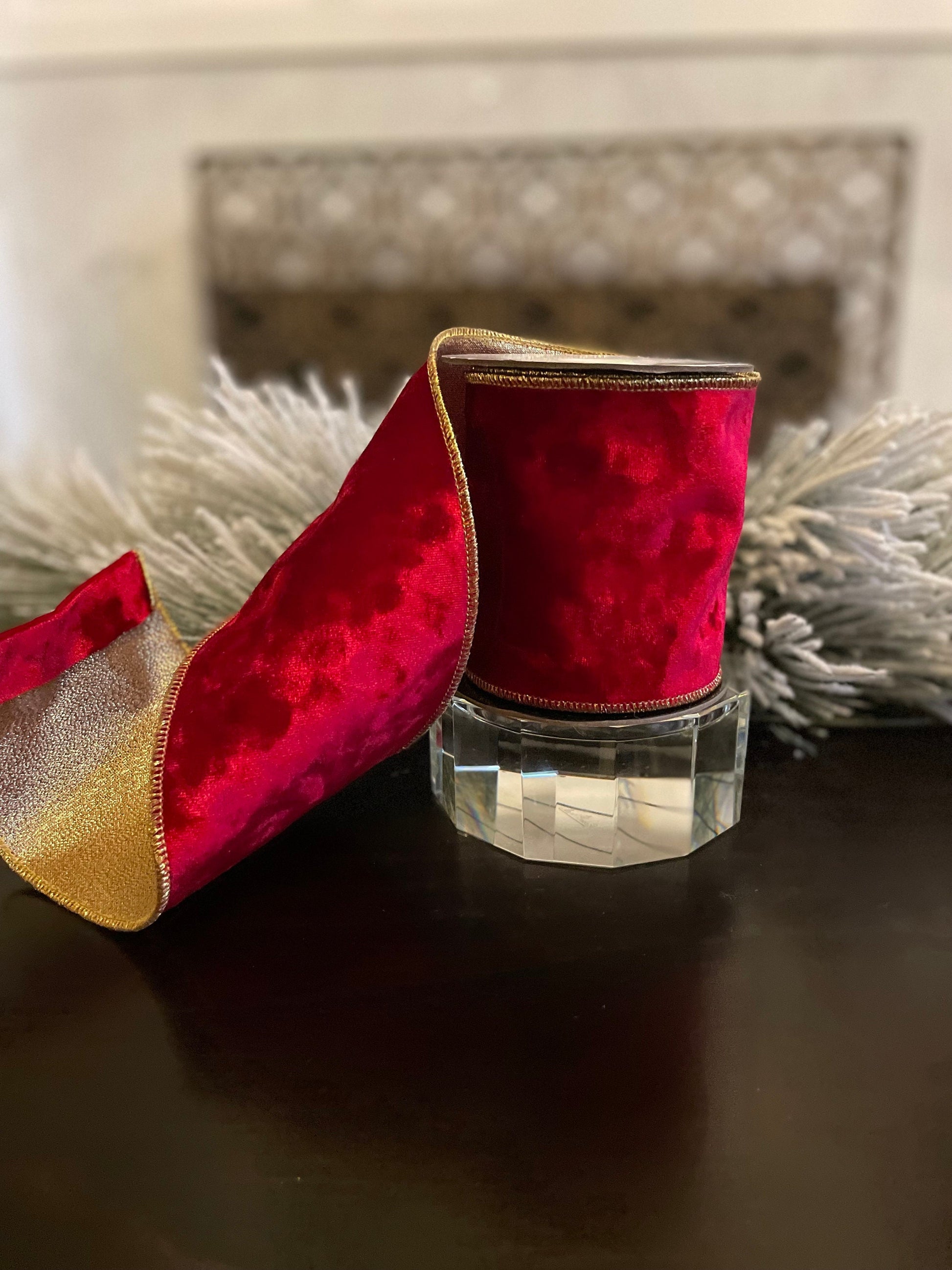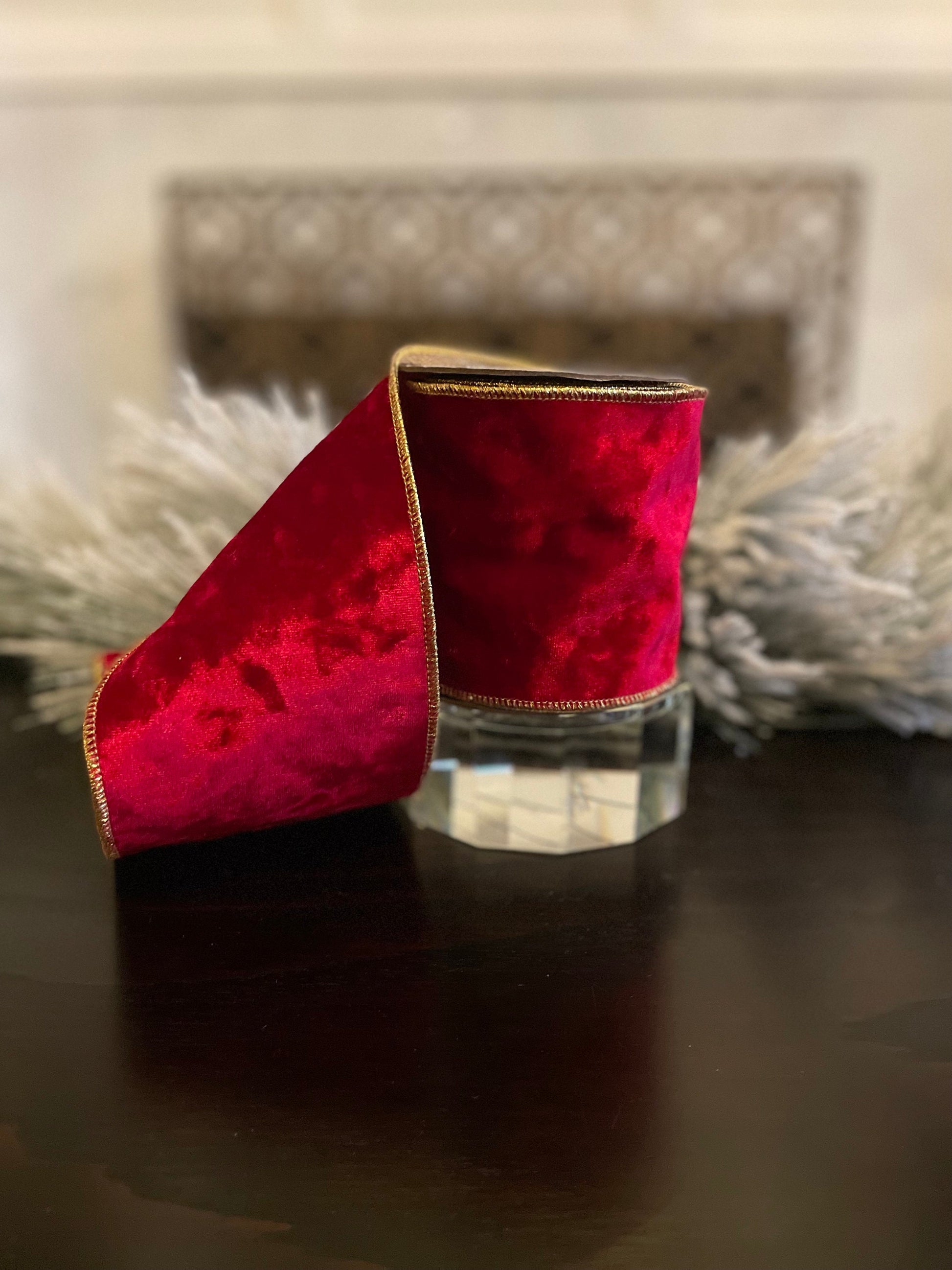 4” x 5 yds. Designer red luxury textured velvet ribbon. Wired. Regency.