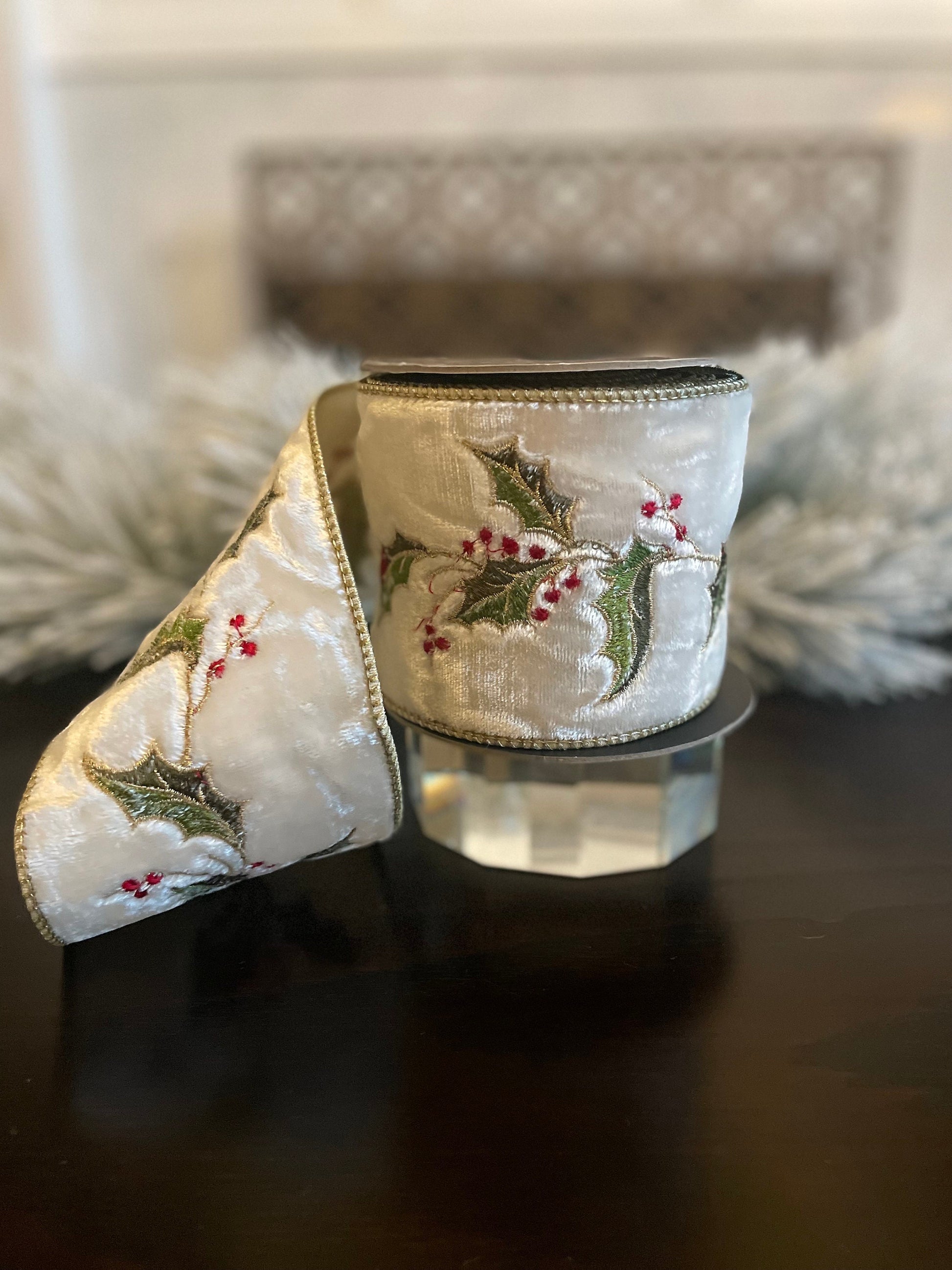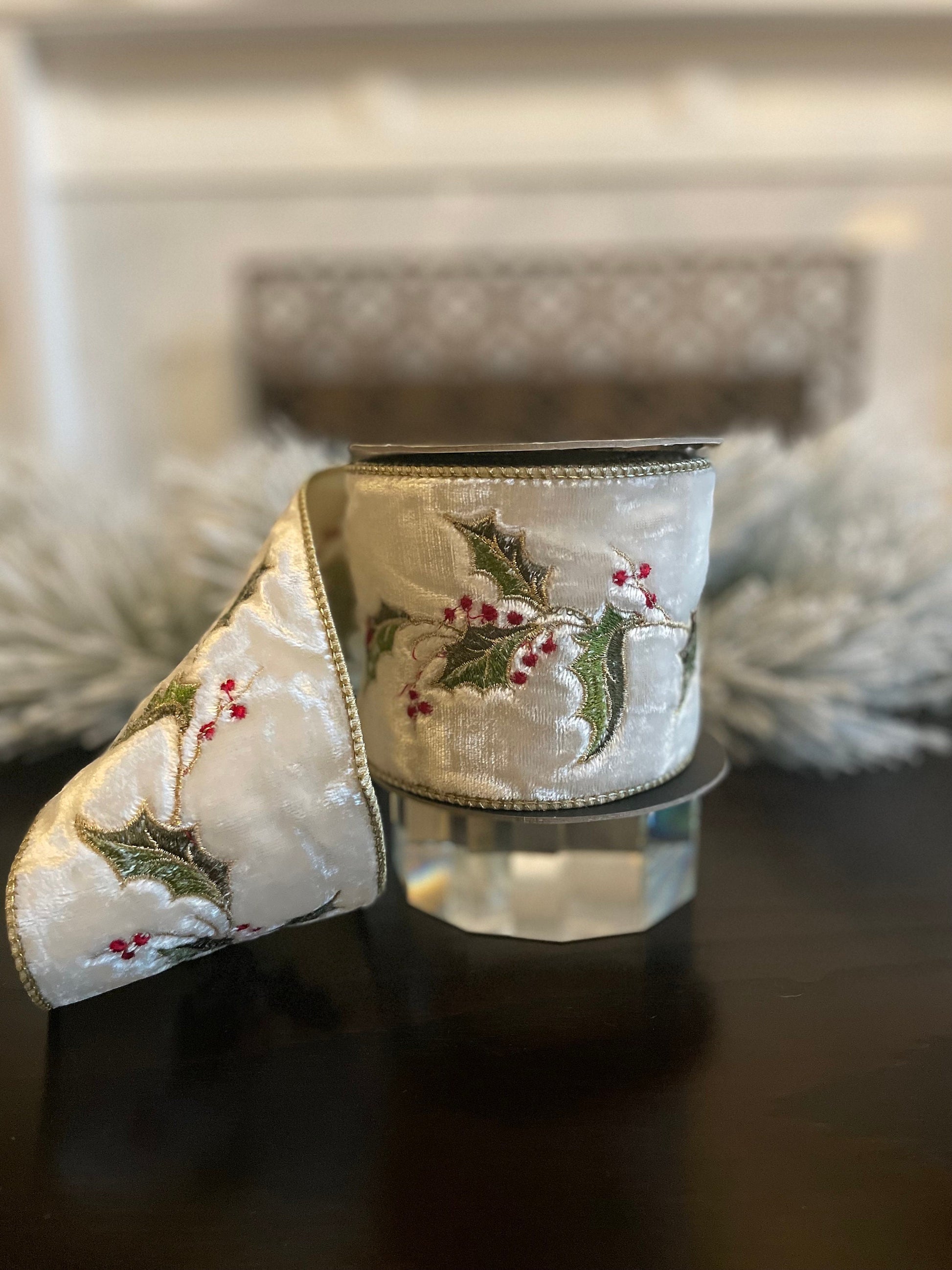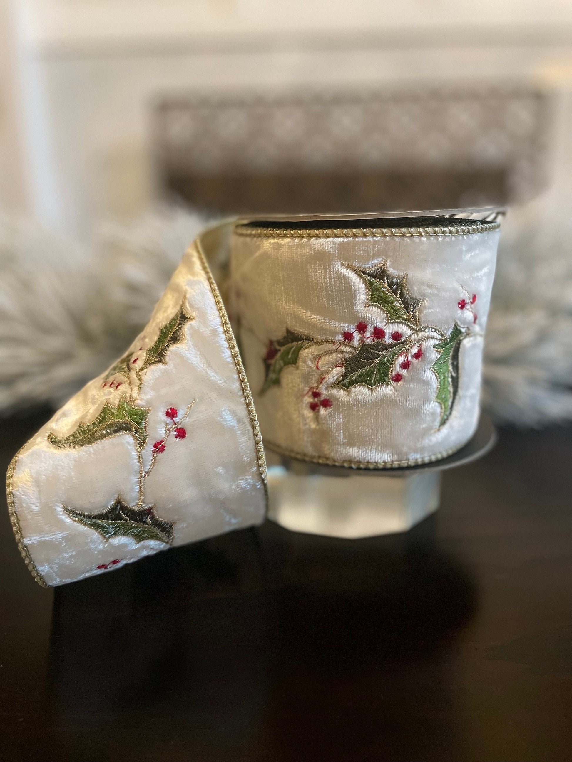 4” x 5 yds Ribbon Holly embroidery ivory-gold. Wired. D. Stevens.