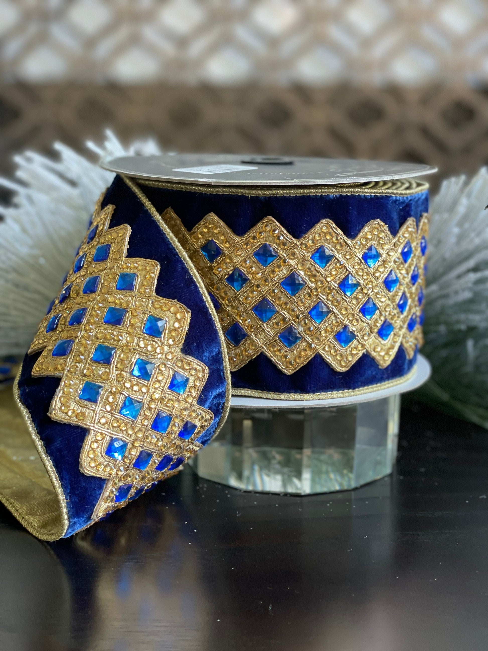4” x 5 yds. Velvet bejeweled lattice indigo ribbon.