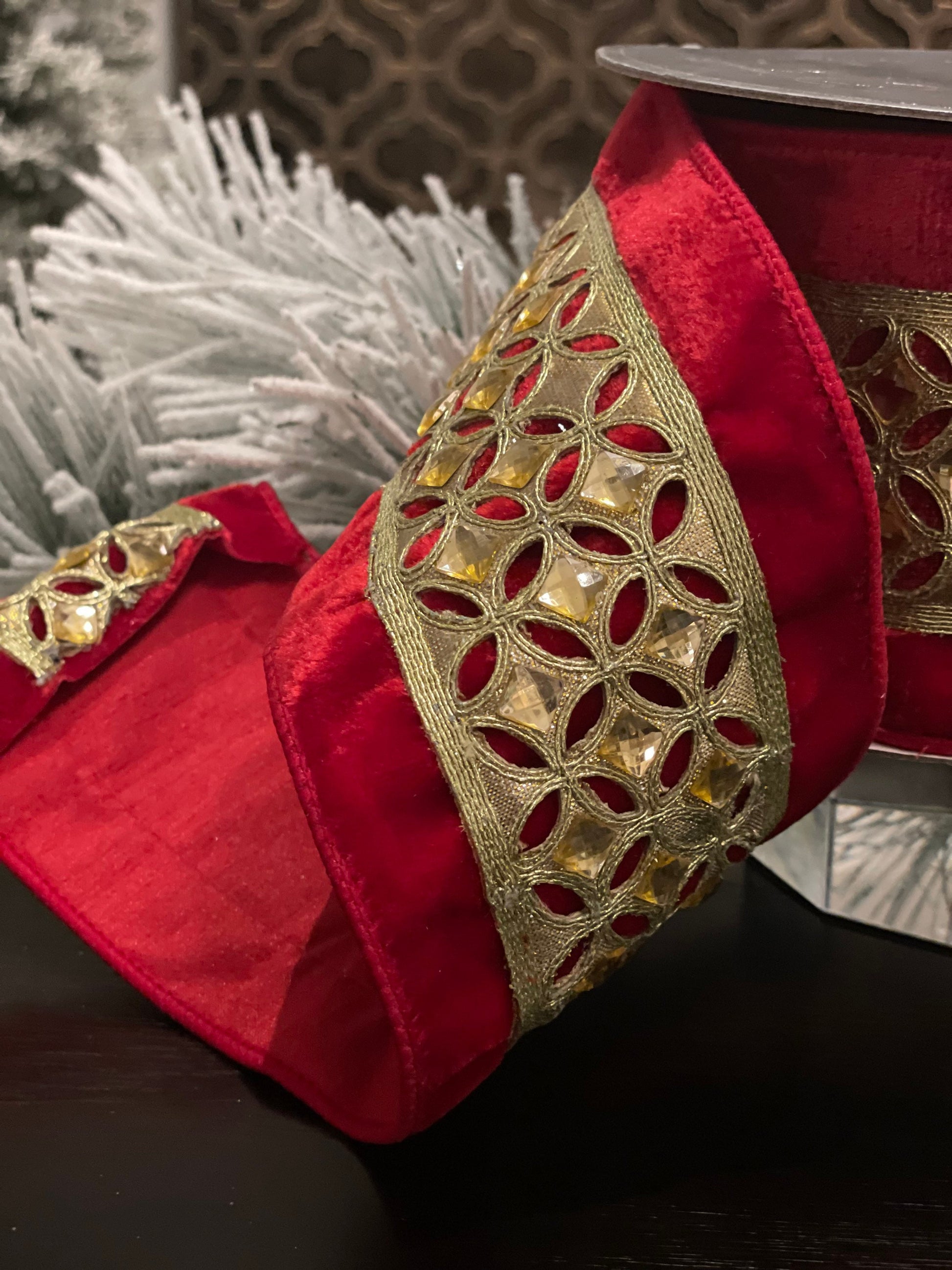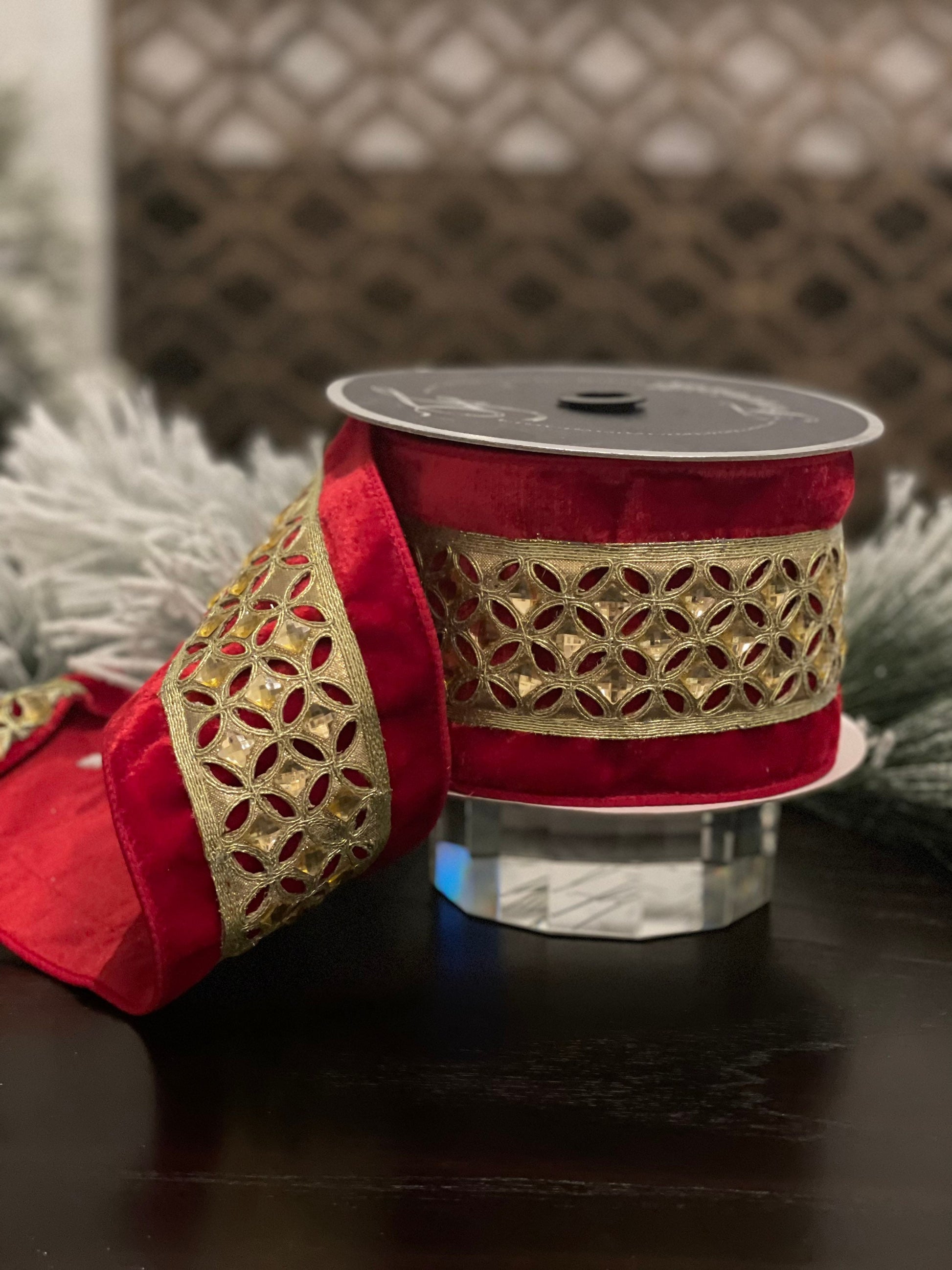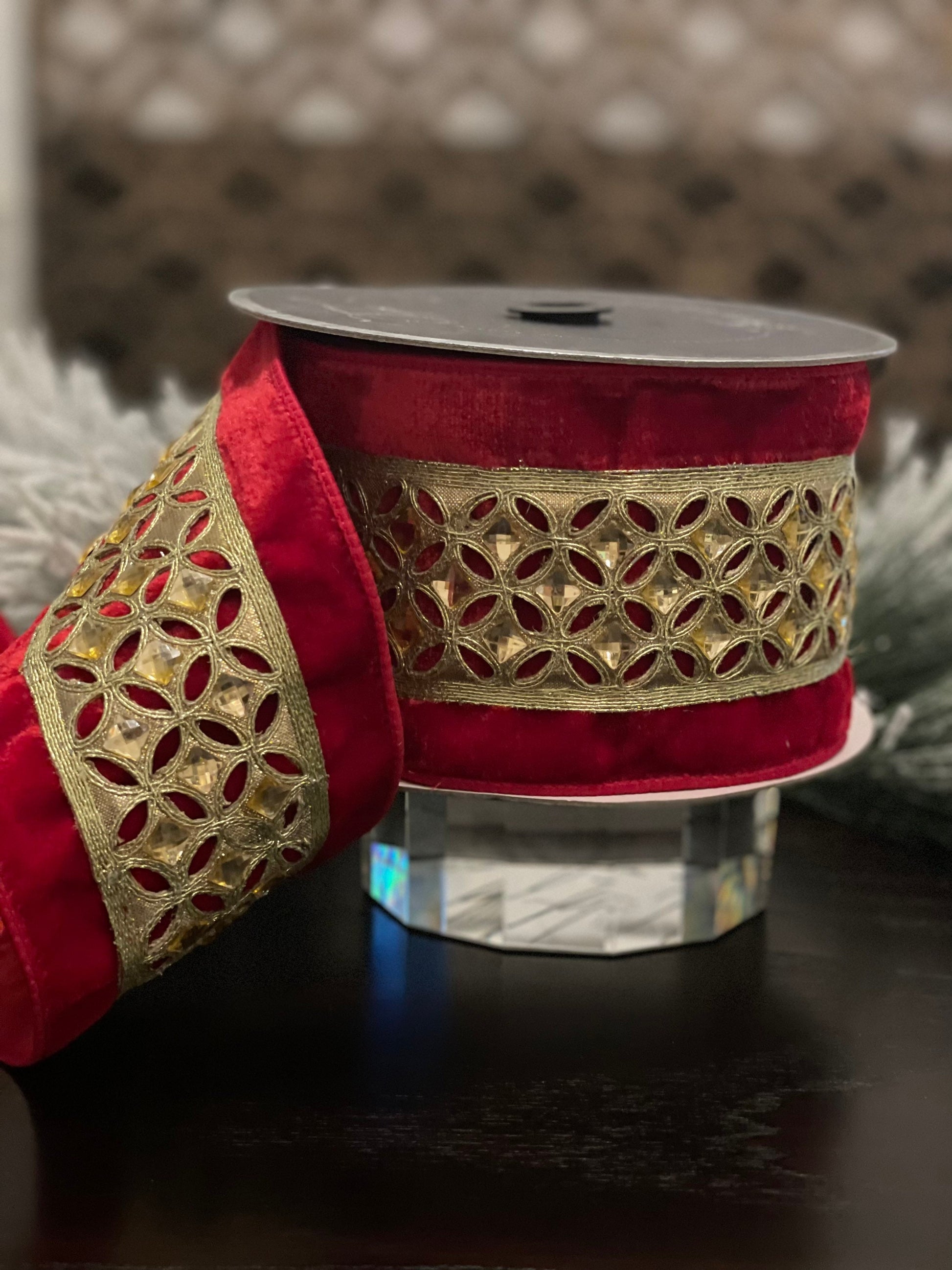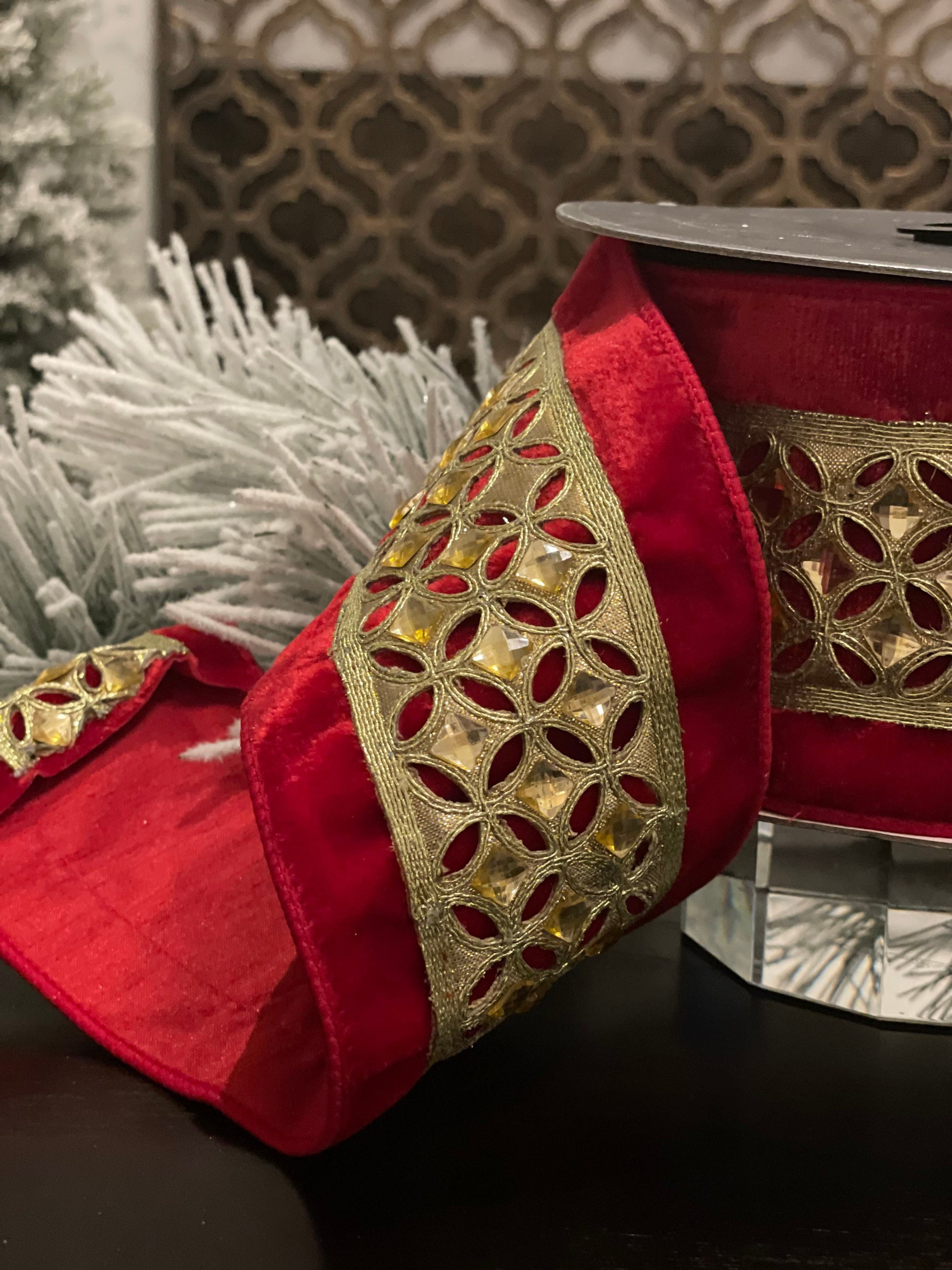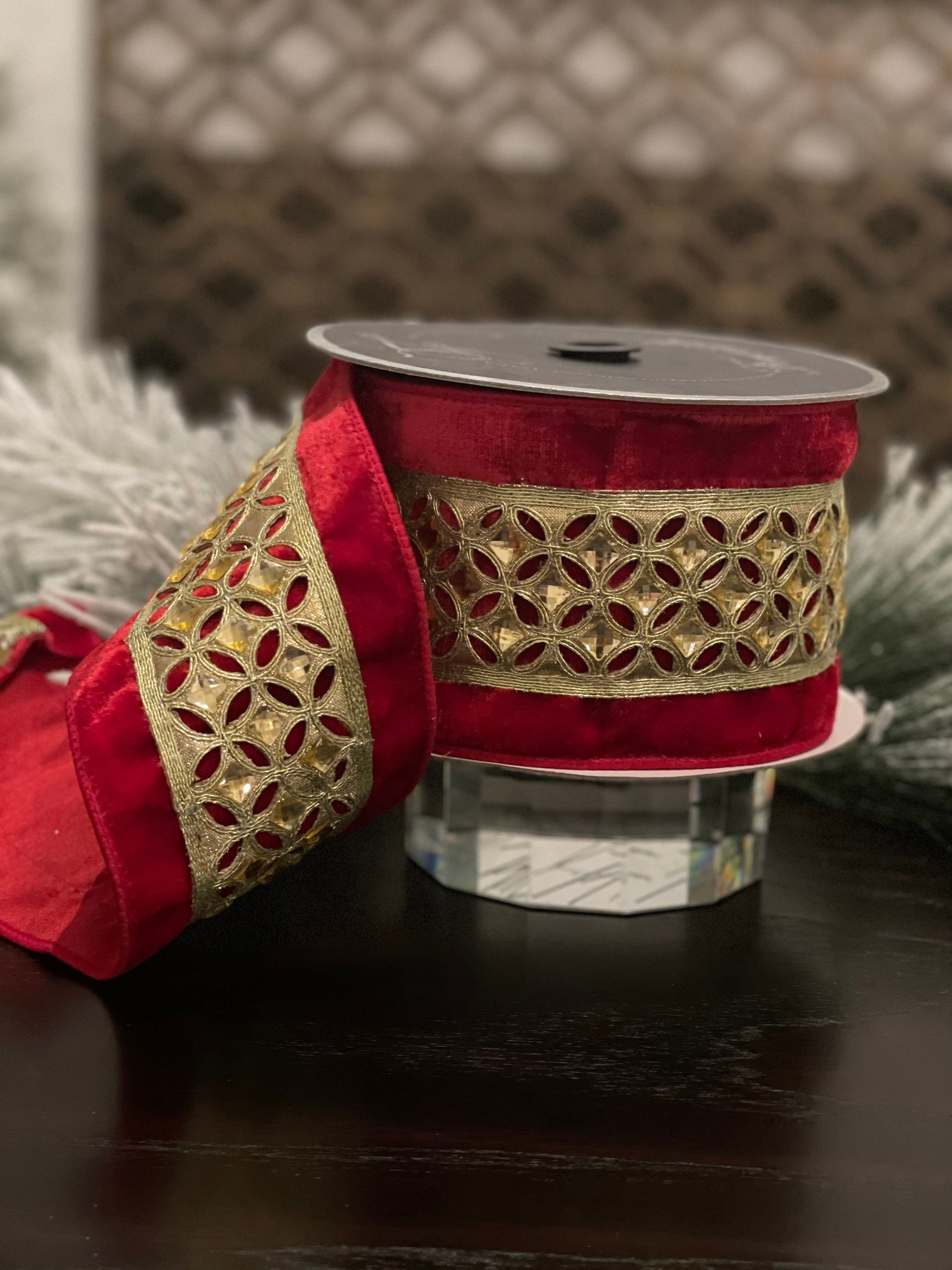4” x 5 yds. Velvet diamond lace red and gold . Wired. Farrisilk.