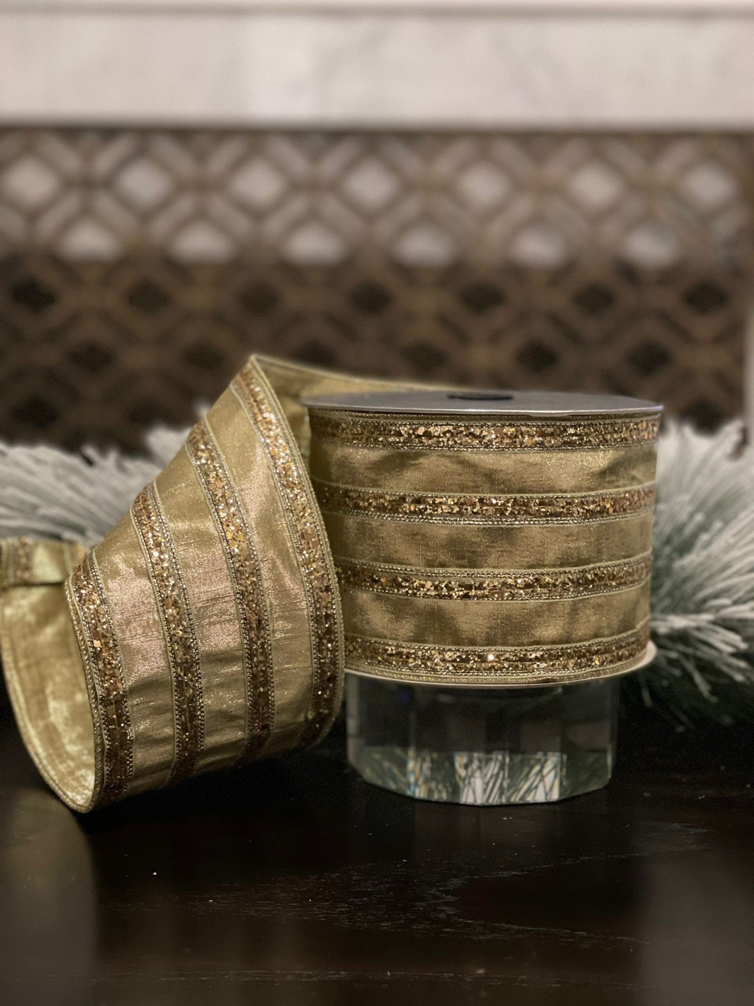 4” x10 yds. chunk glitter stripes gold. Wired. Farrisilk.