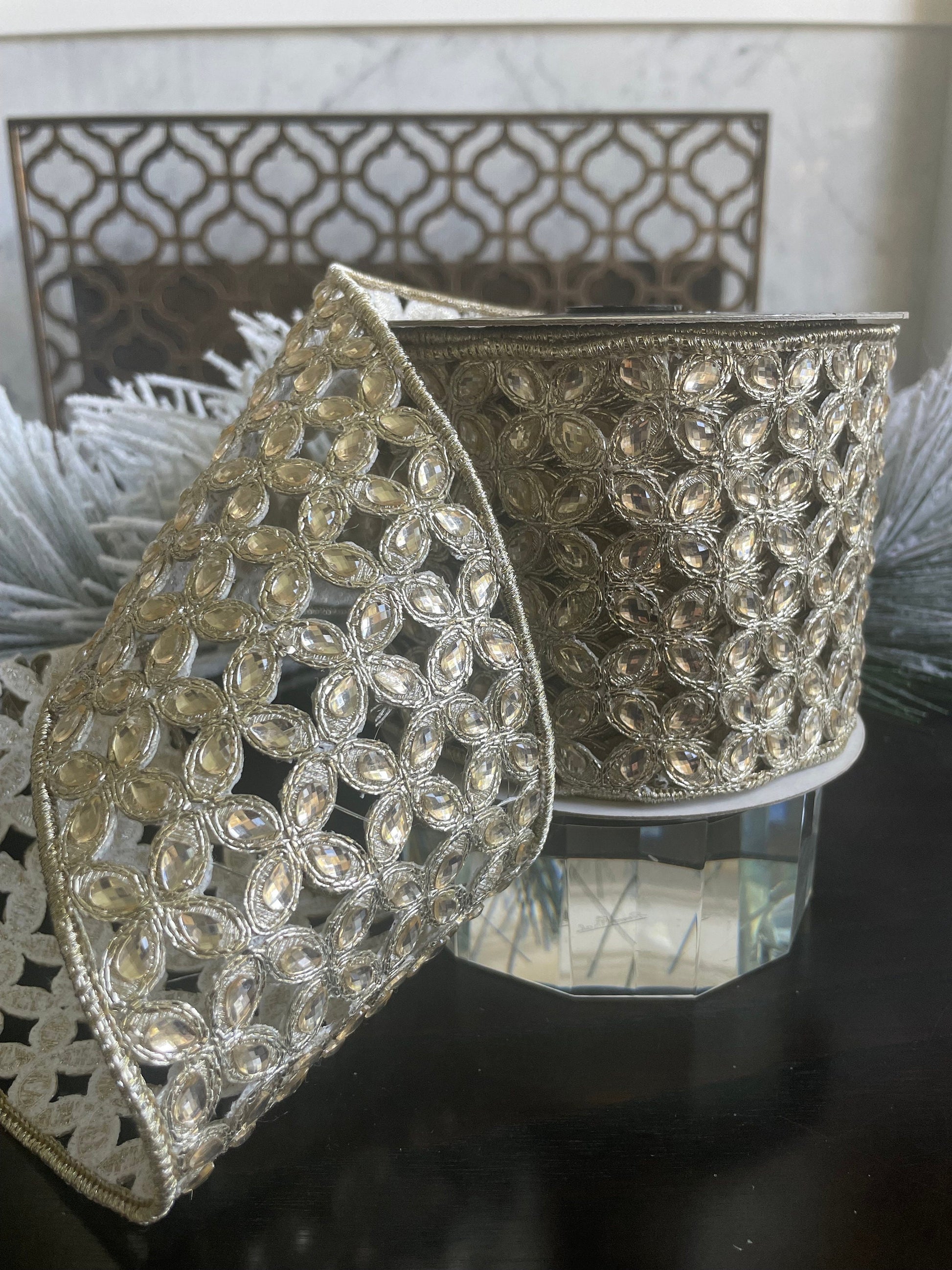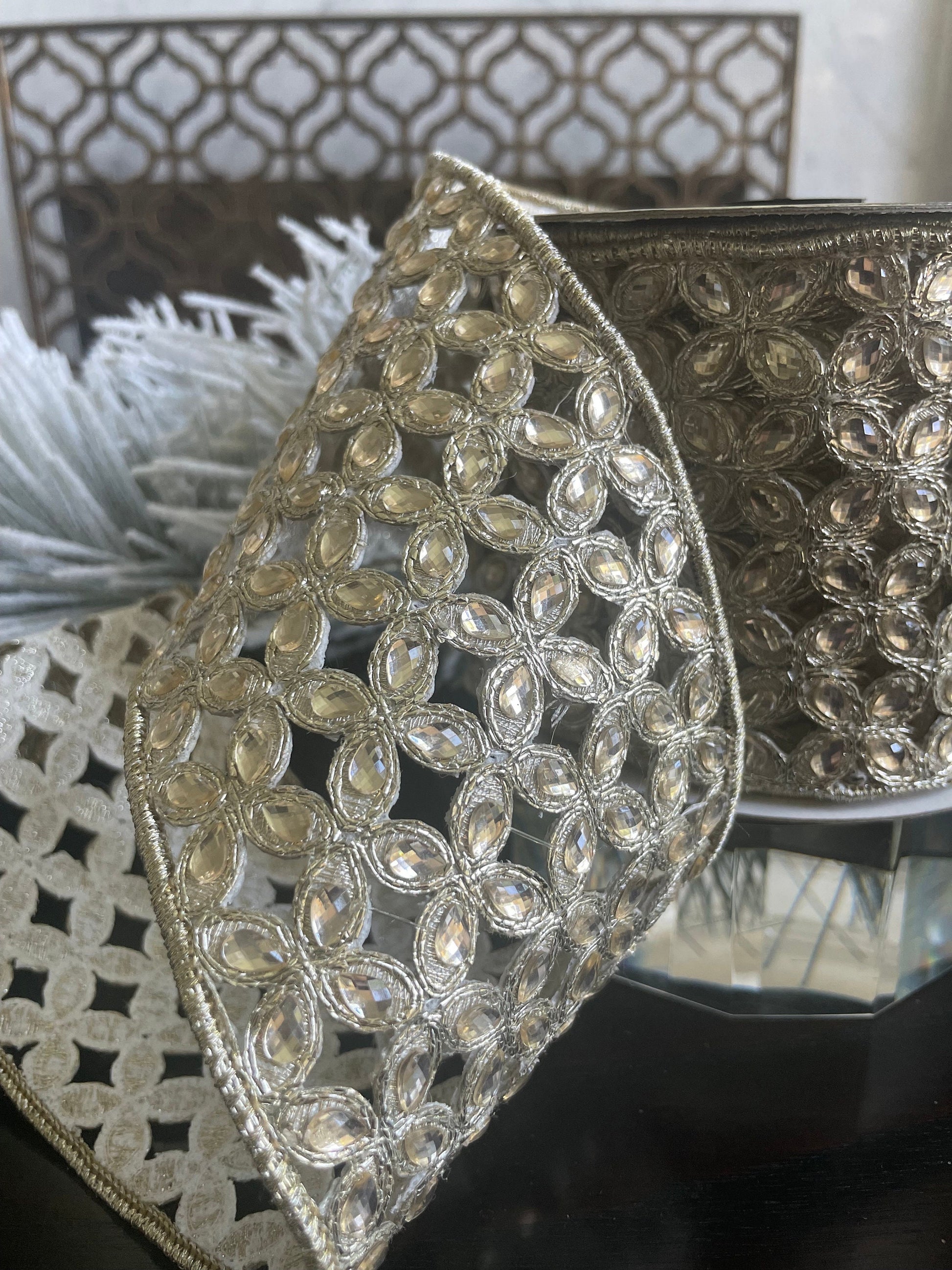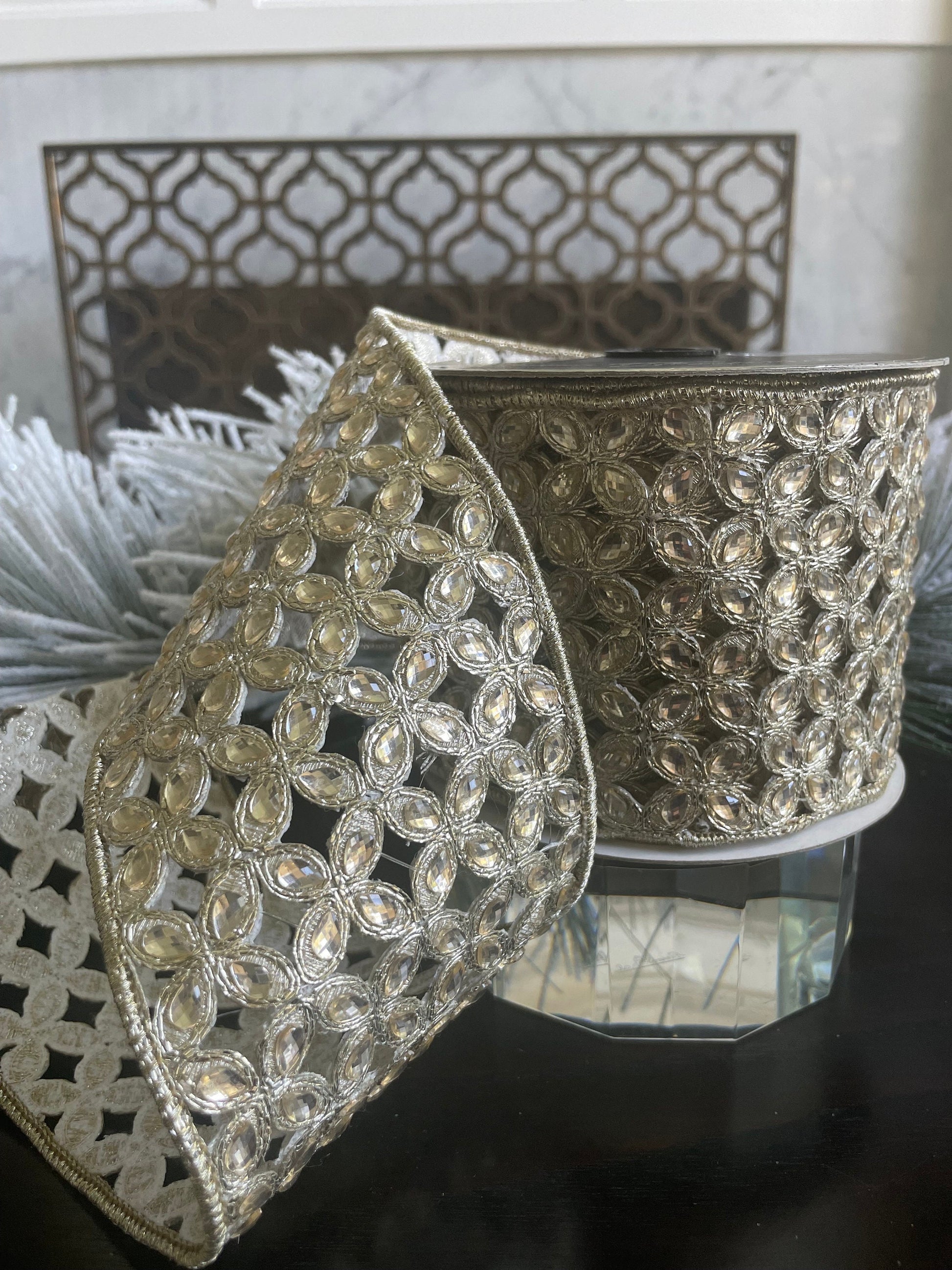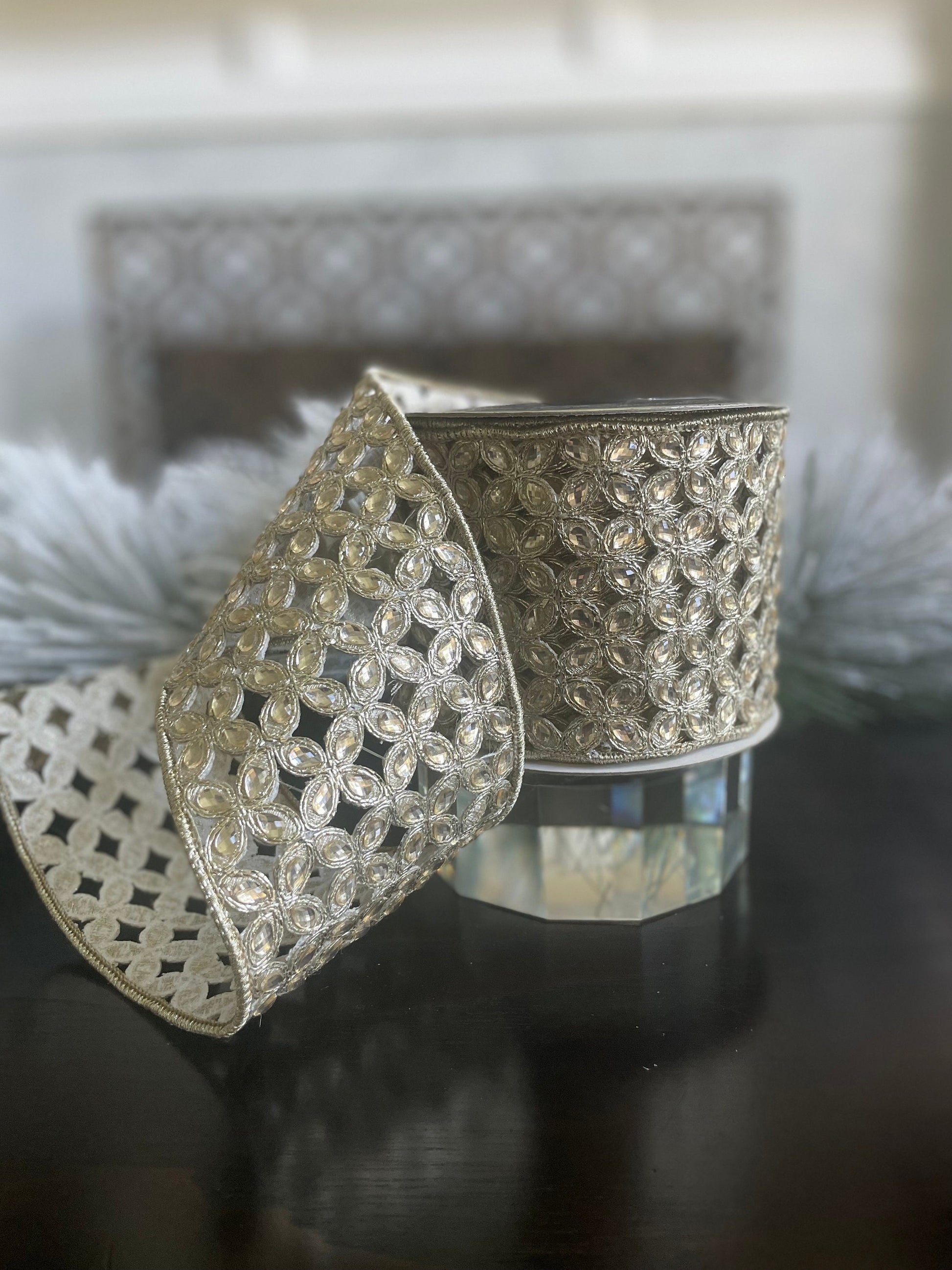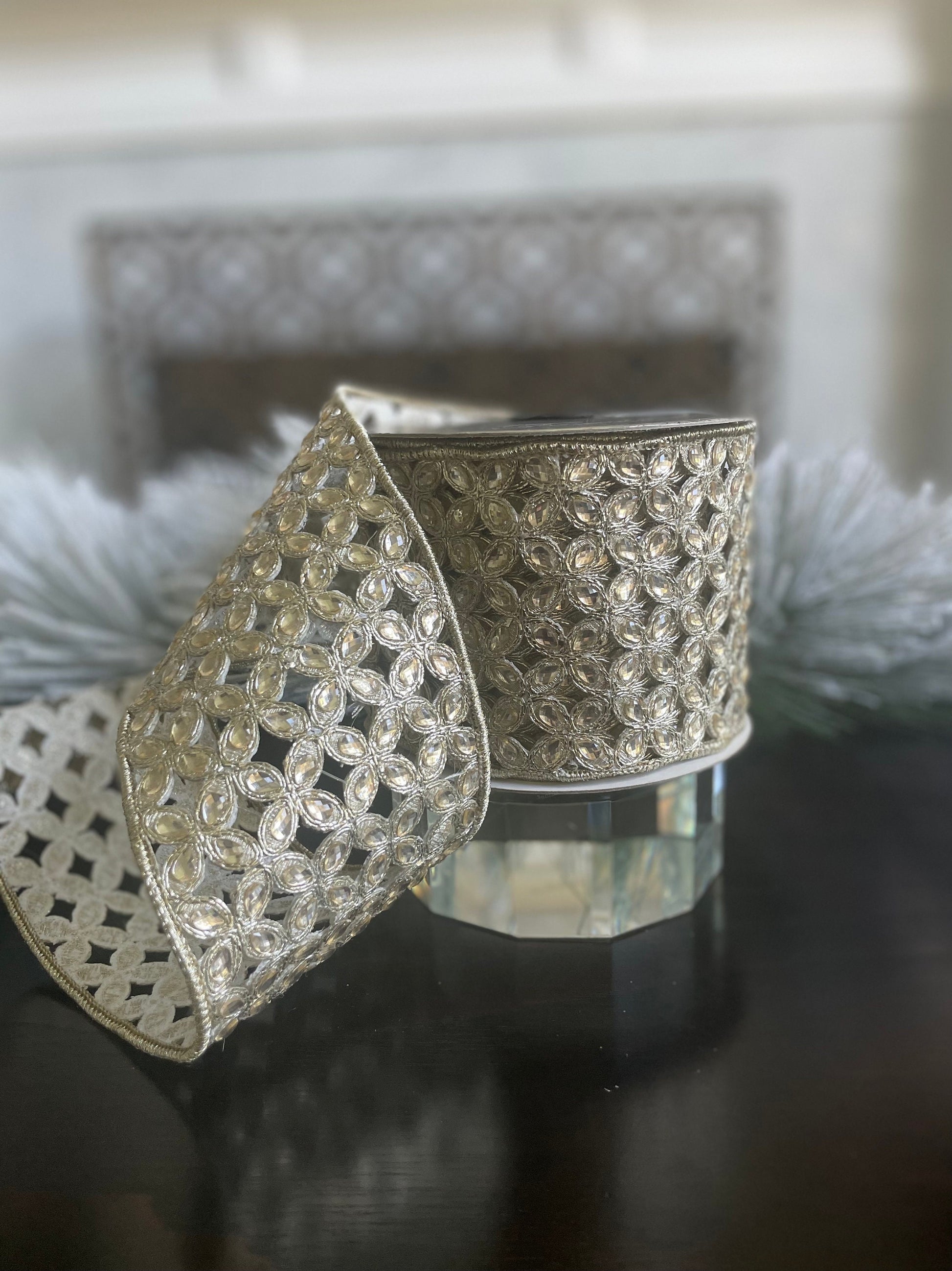 4"x 5 yds. jeweled platinum Christmas flowers wired ribbon.