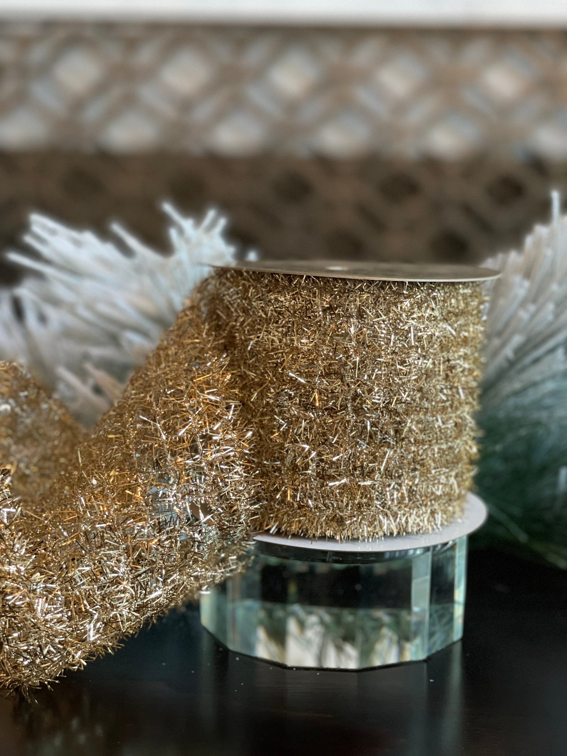 4”x10 yds. or 2.5”x 10yds. tinsel ribbon. Champagne. Wired.