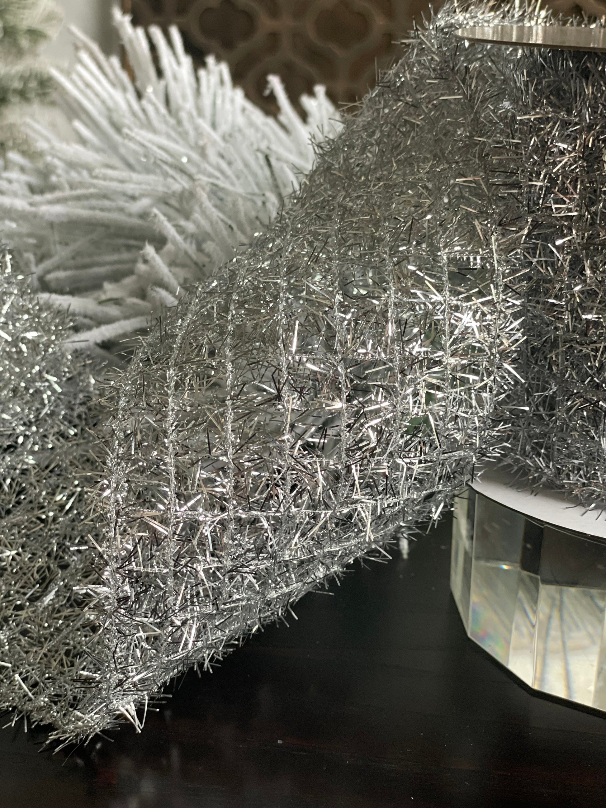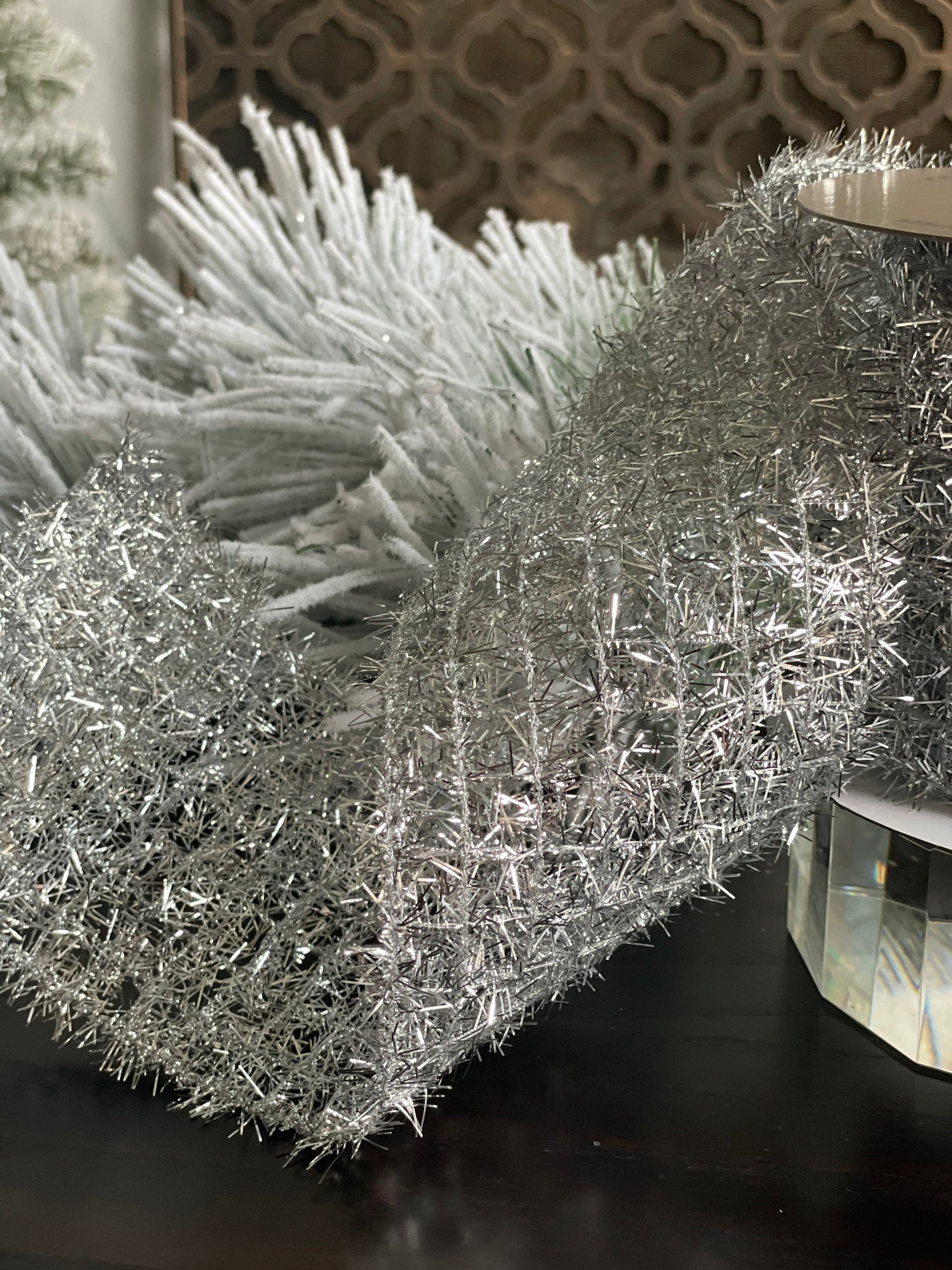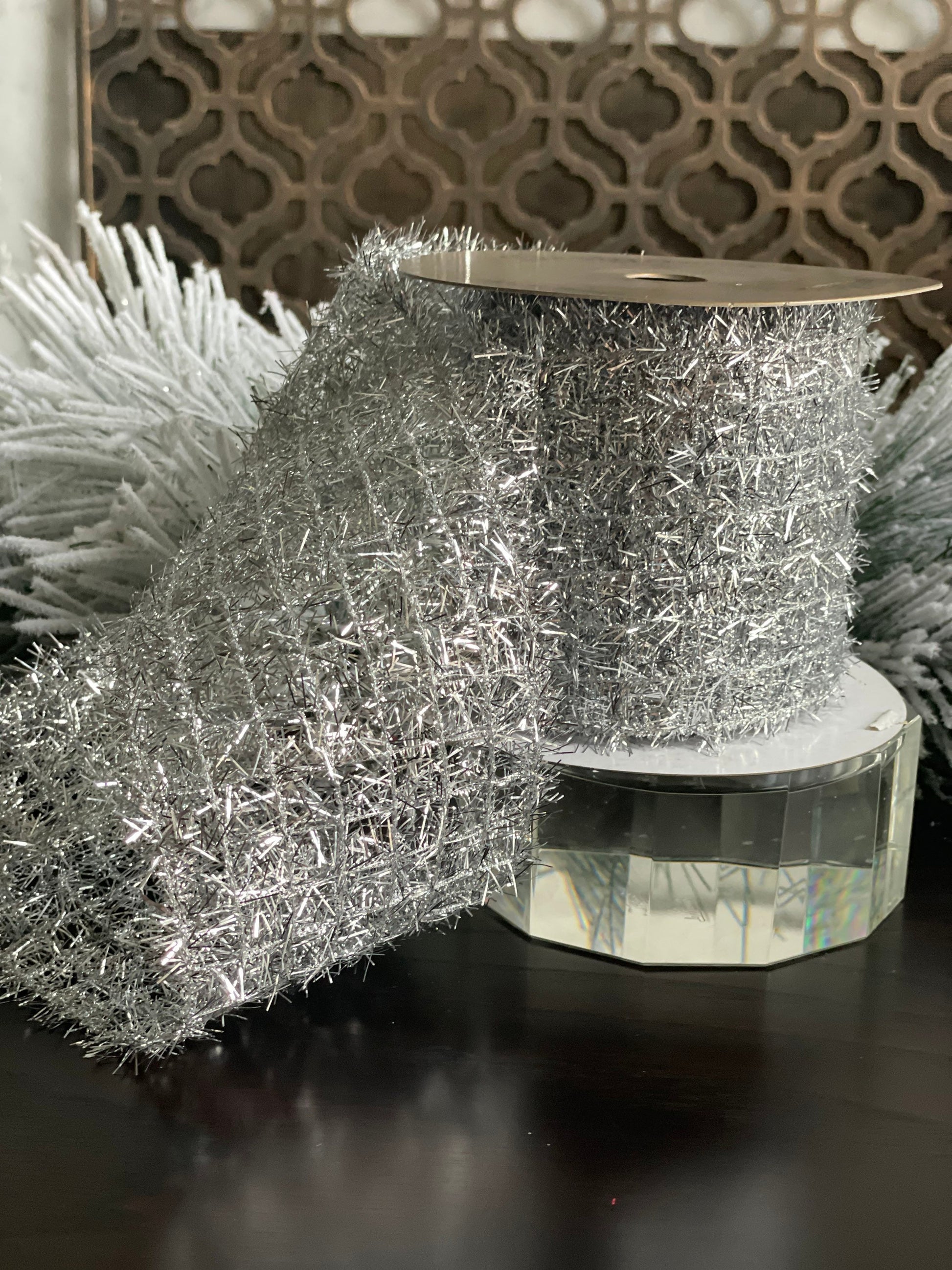 4x10” yds. Silver tinsel ribbon. Wired