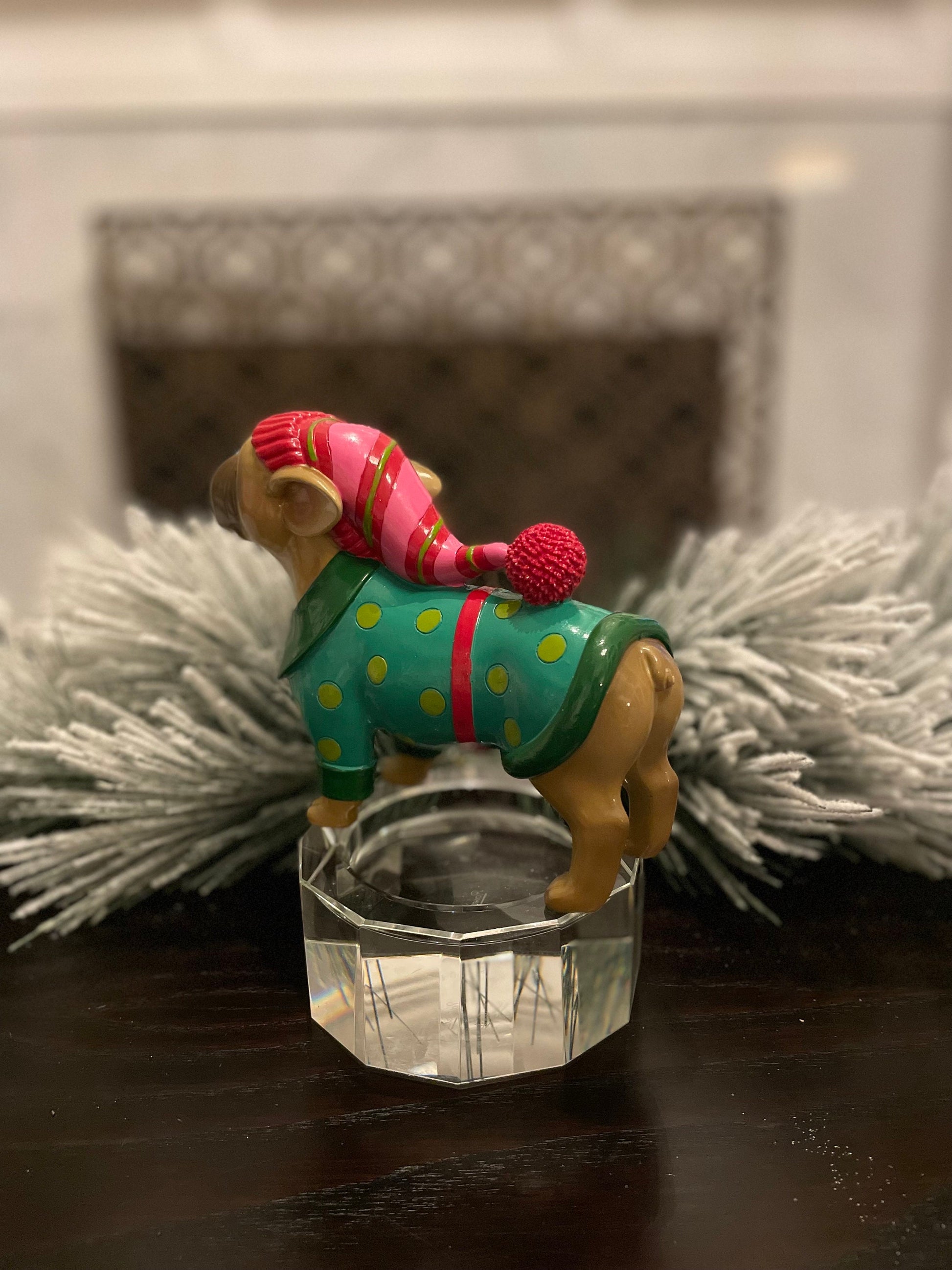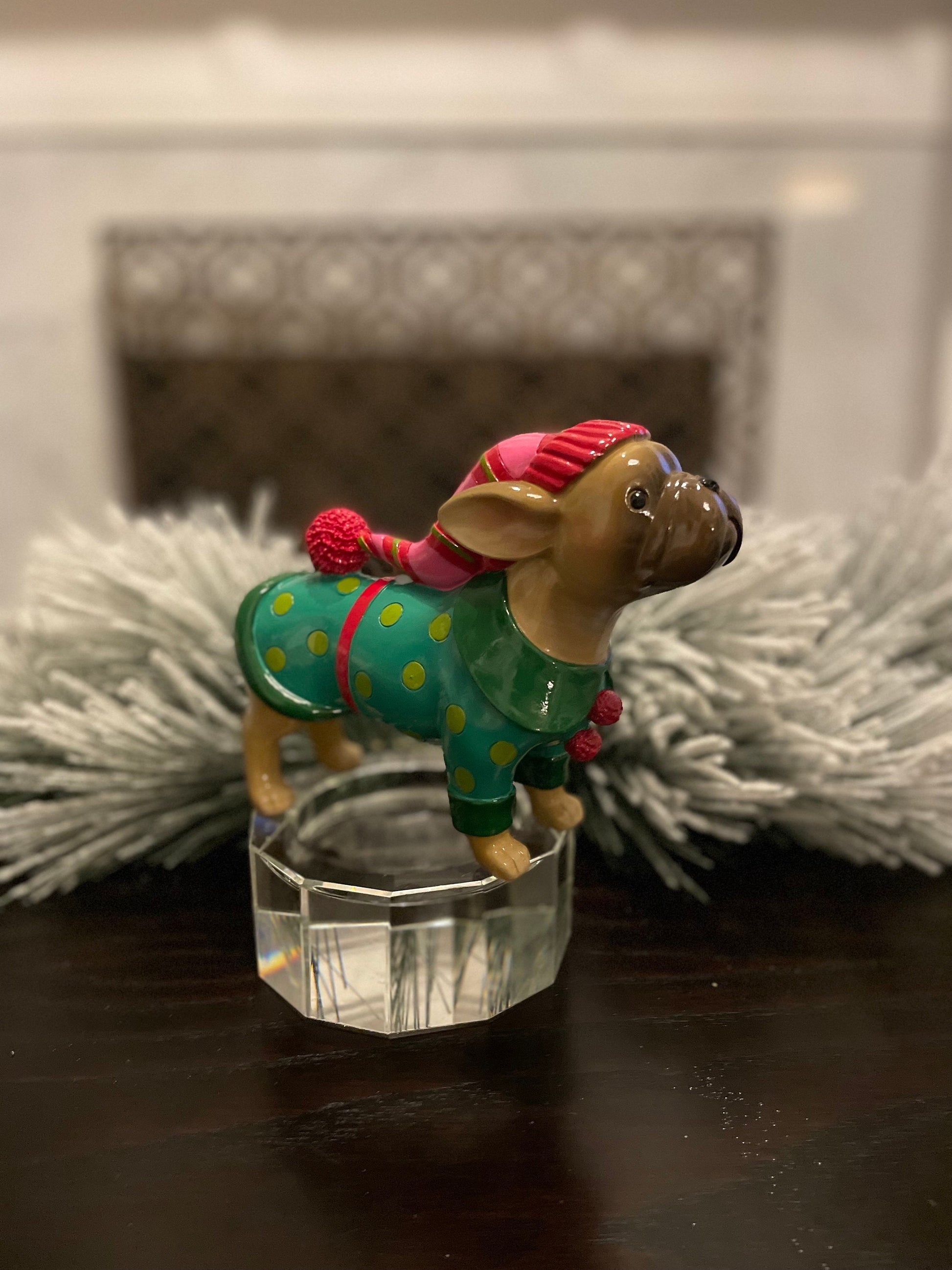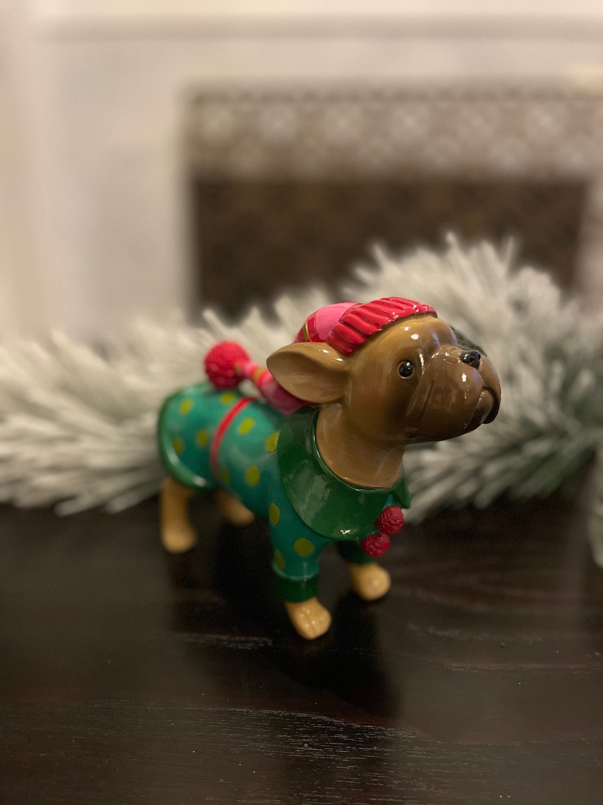 5.5” resin bulldog in Christmas sweater. Tabletop.