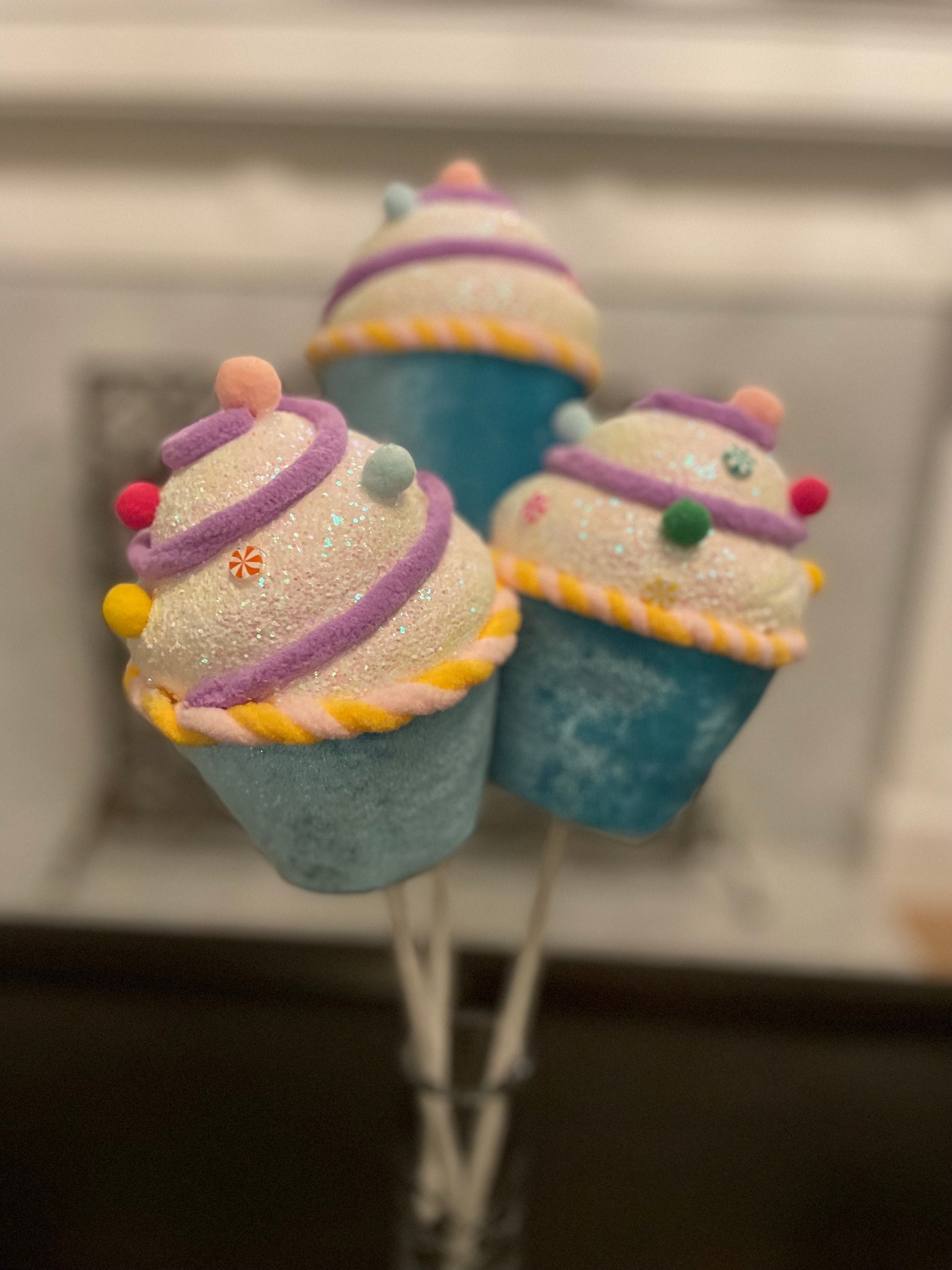 6.5” Cupcake with sprinkles ornament. Blue velvet and glitter. Yummy!