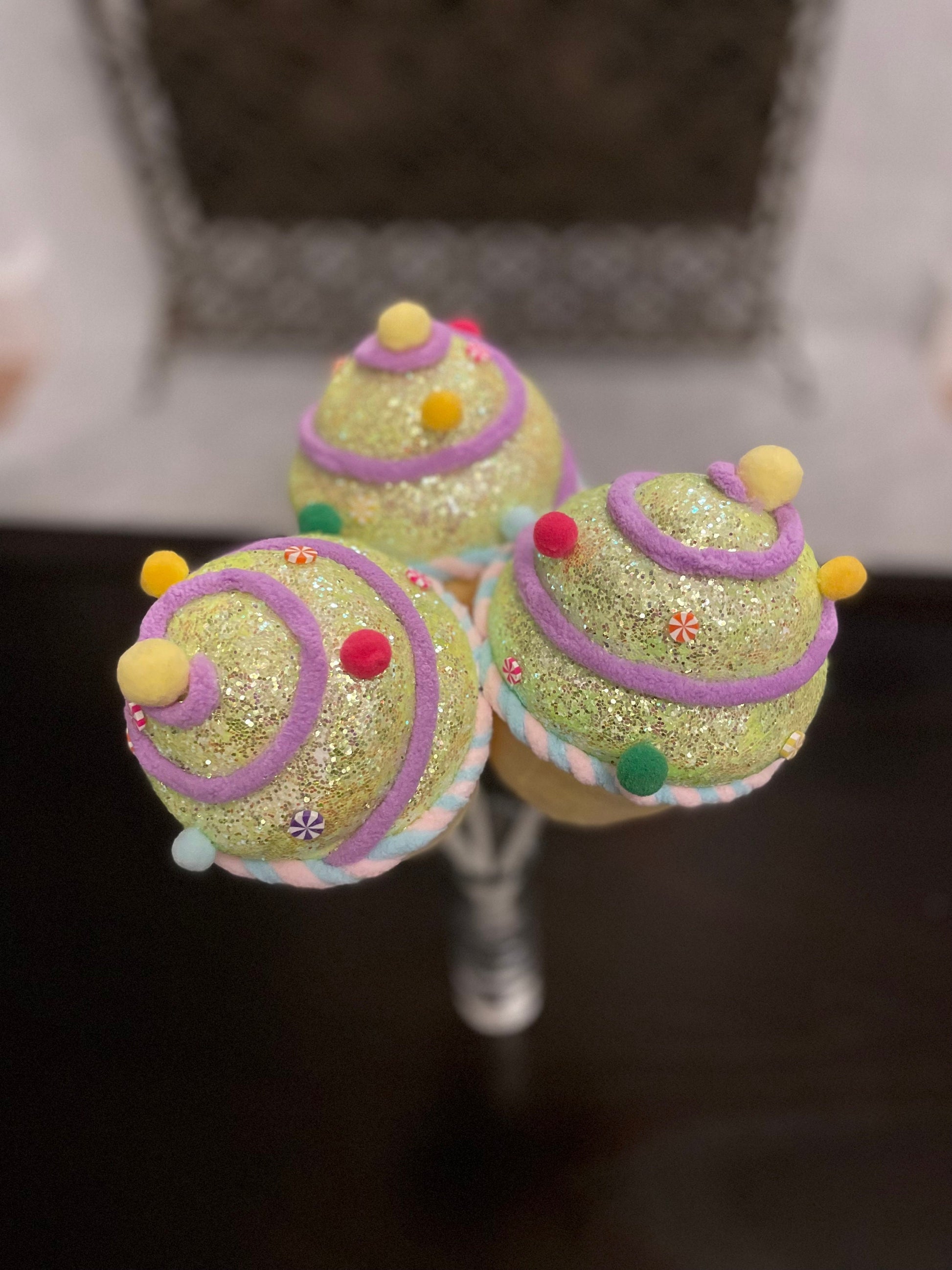 6.5” Cupcake with sprinkles ornament. Light yellow velvet and glitter. Yummy!
