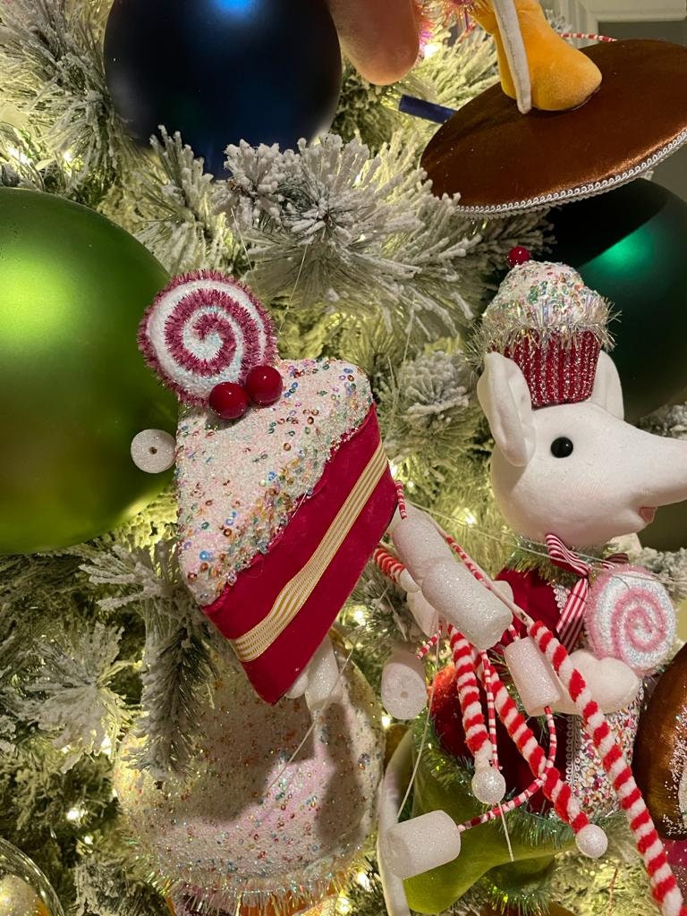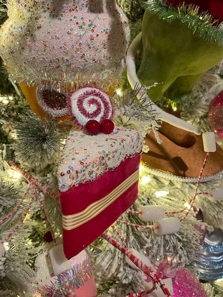 Cake slice 6 inches in red. Perfect for a candy Christmas theme. This cute cake slice it’s sprinkled with colorful glitter and sequins and it has a candy and 2 cherries on top.