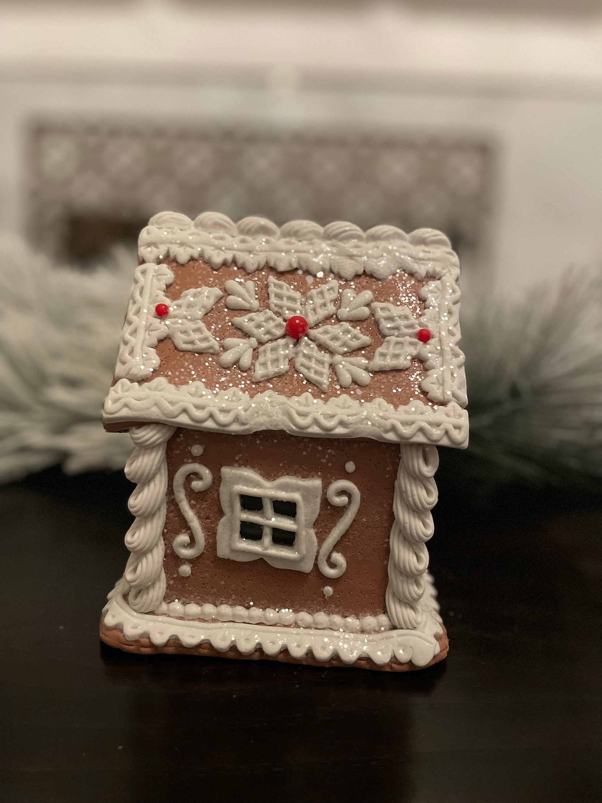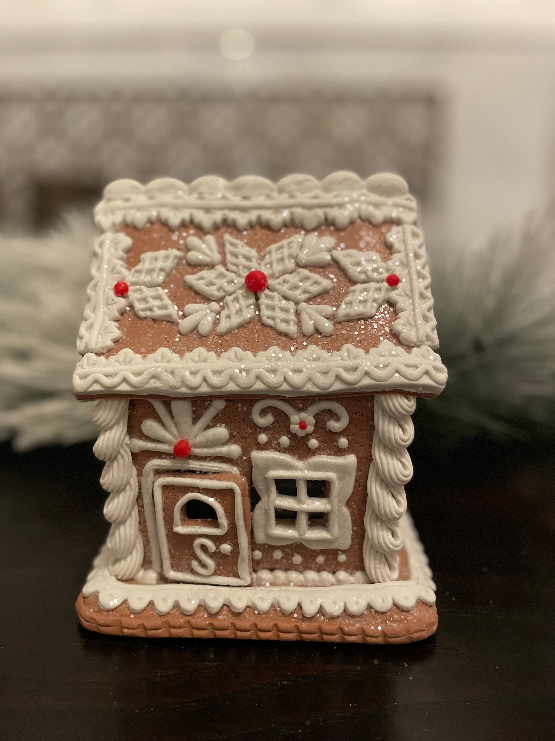 6”H x 5”W. Gingerbread lighted house. Needs batteries. Perfect for your candy theme Christmas!