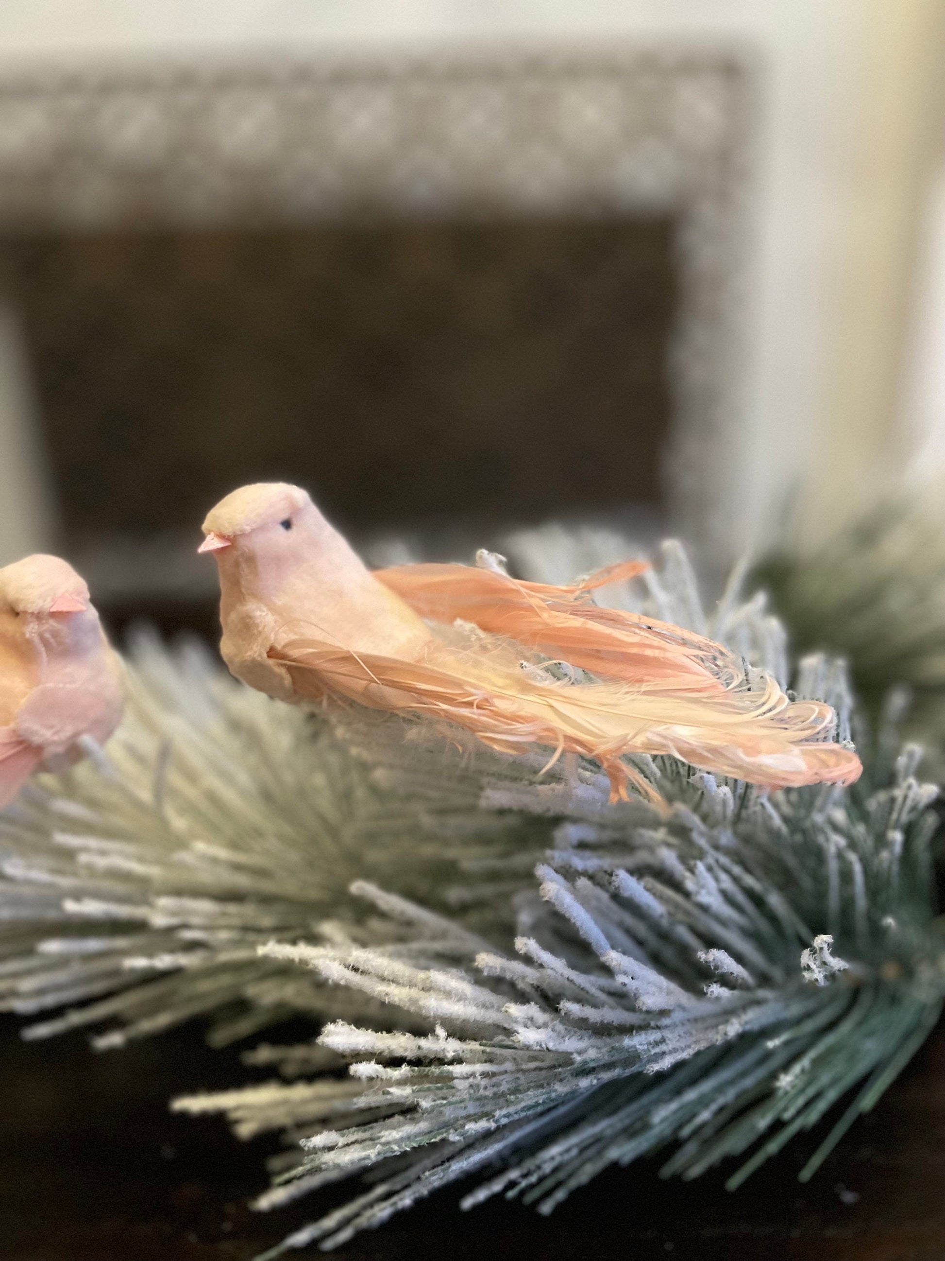 6” Pair of velvet and feather fluffy tail bird clip ornaments. Soft pink. 1 set of 2 birds. Very cute!