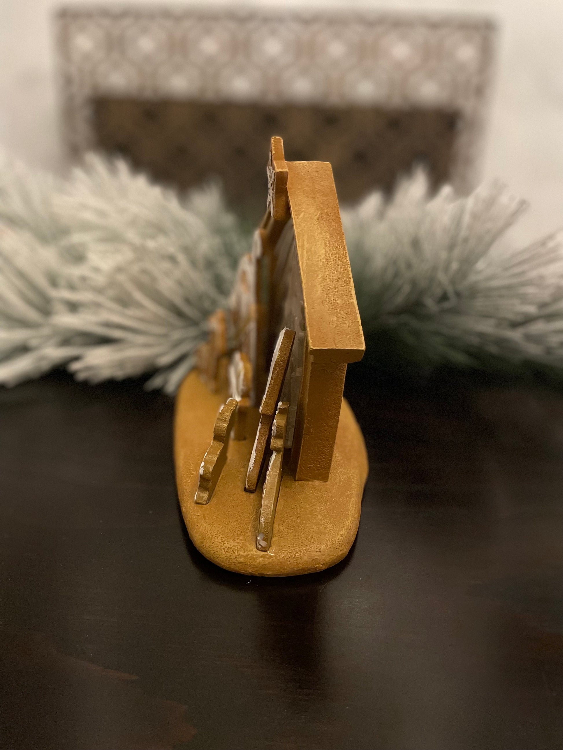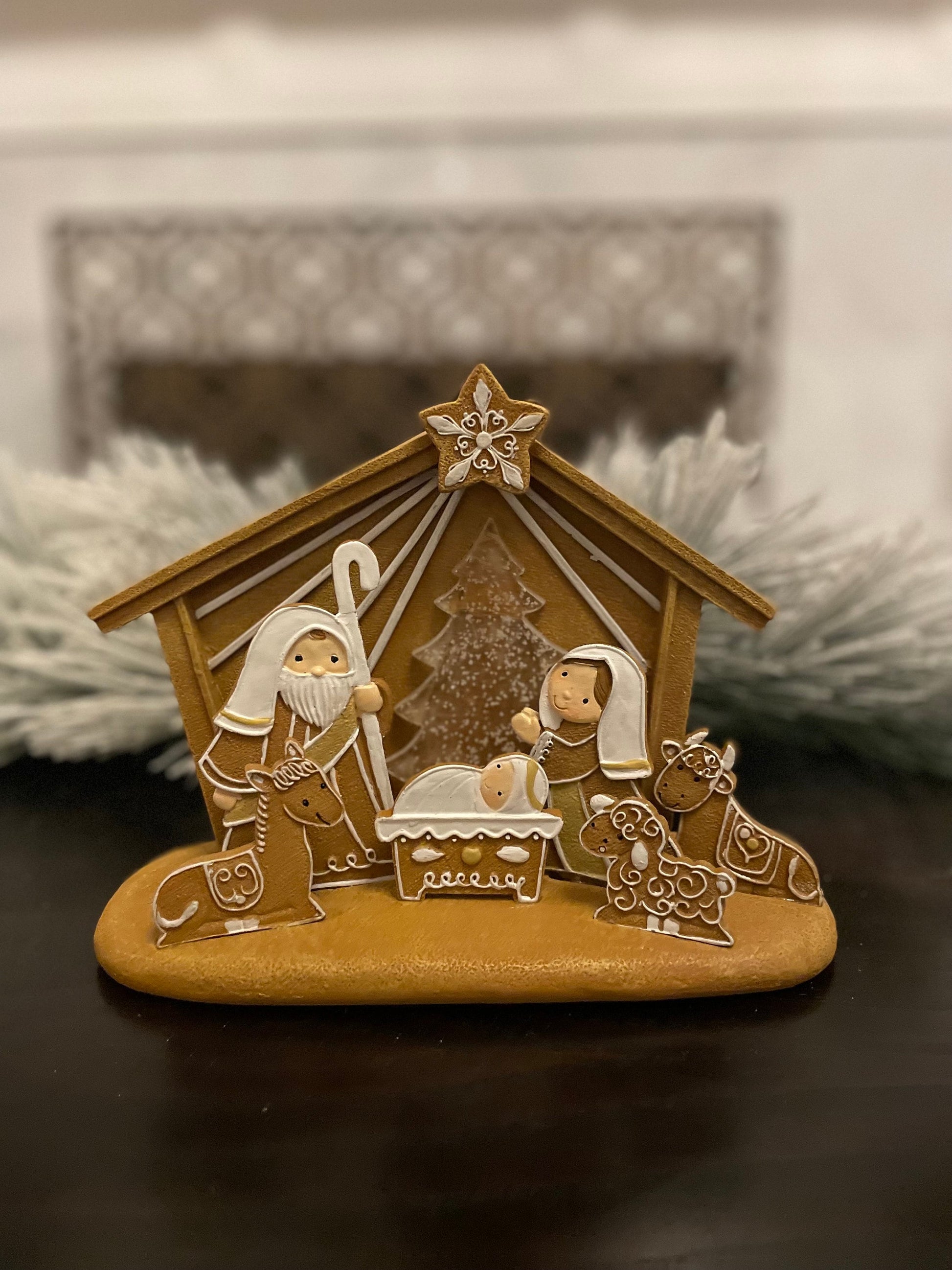 7.5”H x 8”L x 4”W. Gingerbread lighted Nativity. The reason for the season!