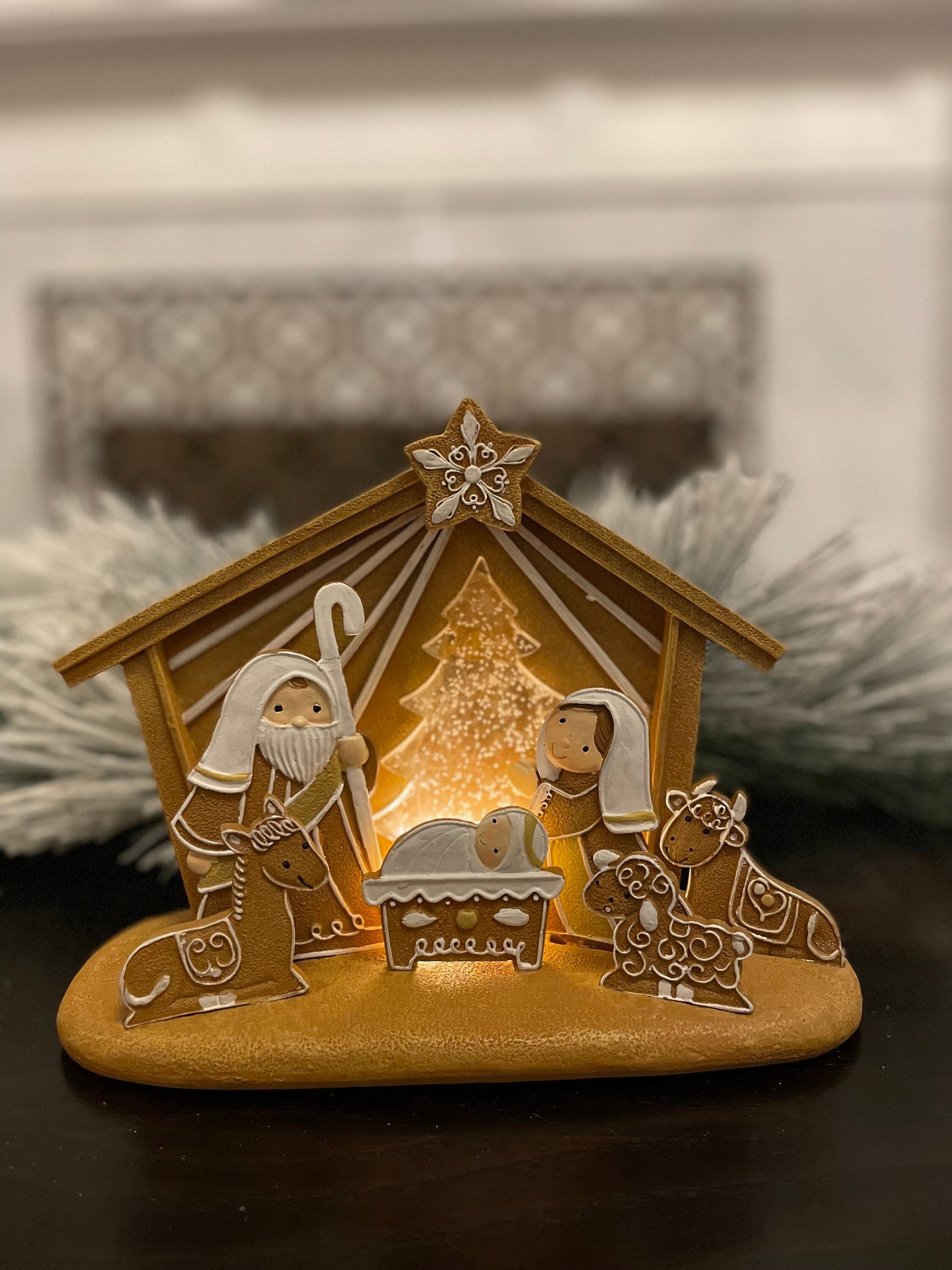 7.5”H x 8”L x 4”W. Nativity Gingerbread lighted. Manger scene.