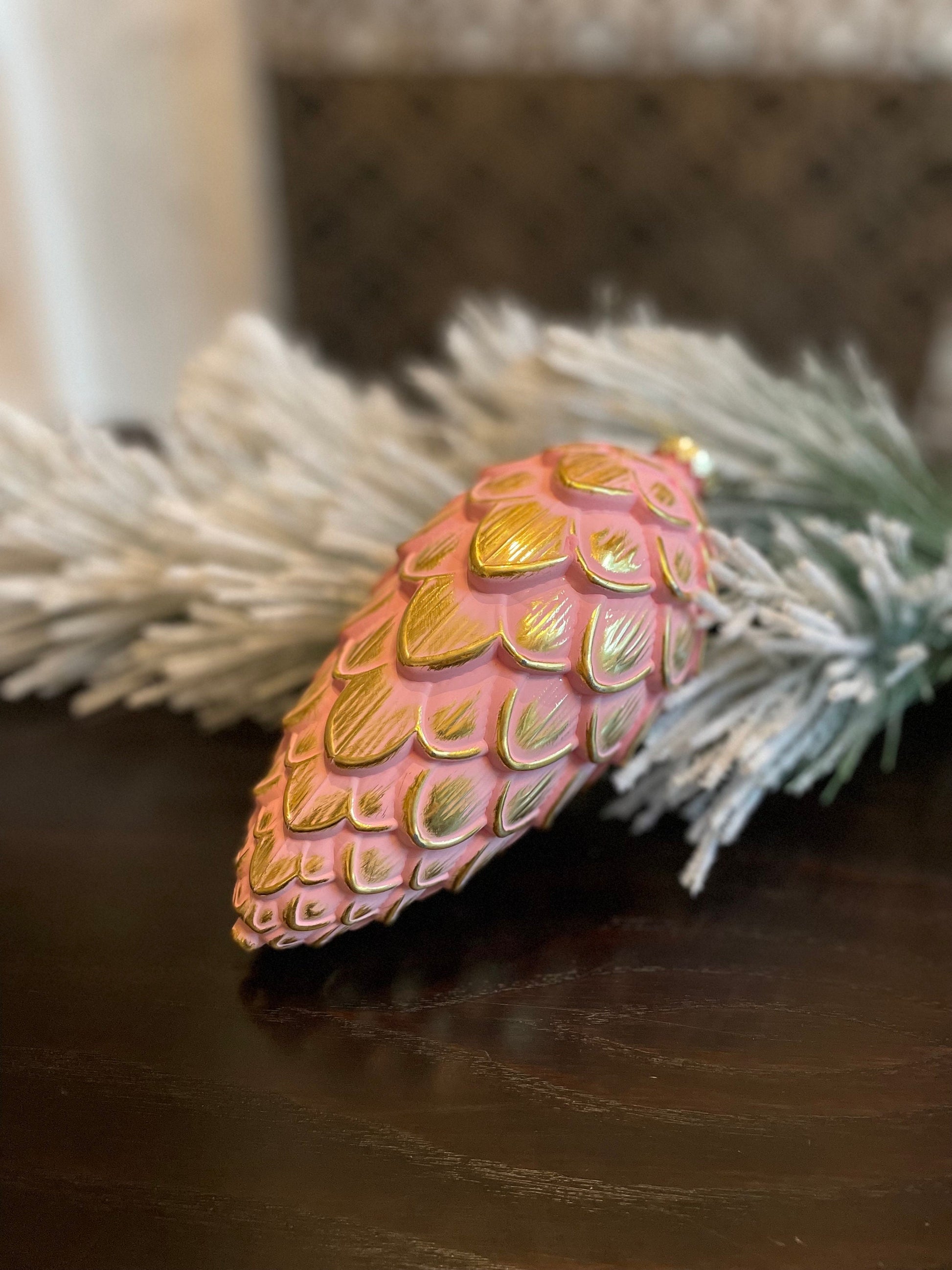 8” Pinecone ornament. Pink and gold. Shatterproof.