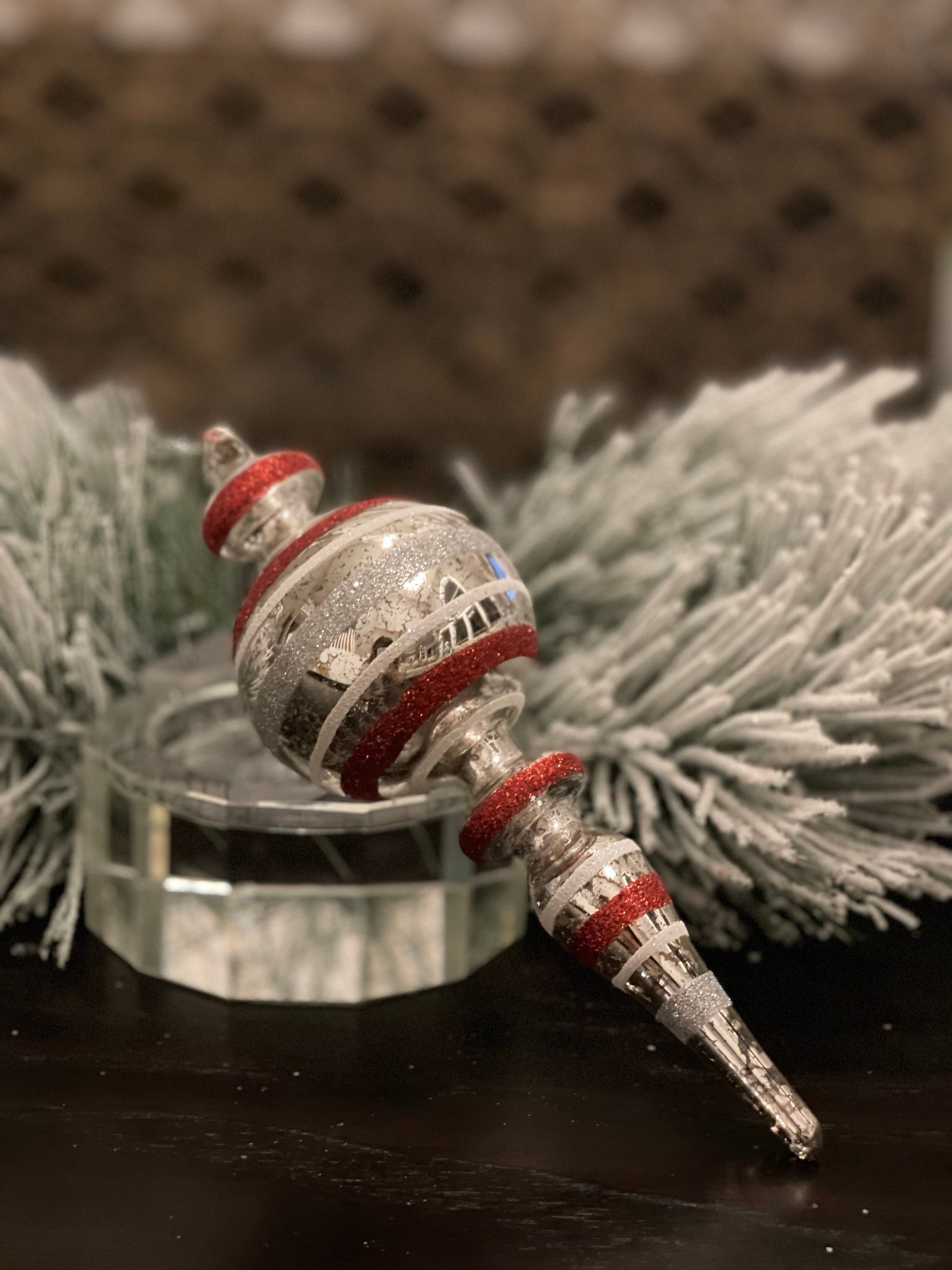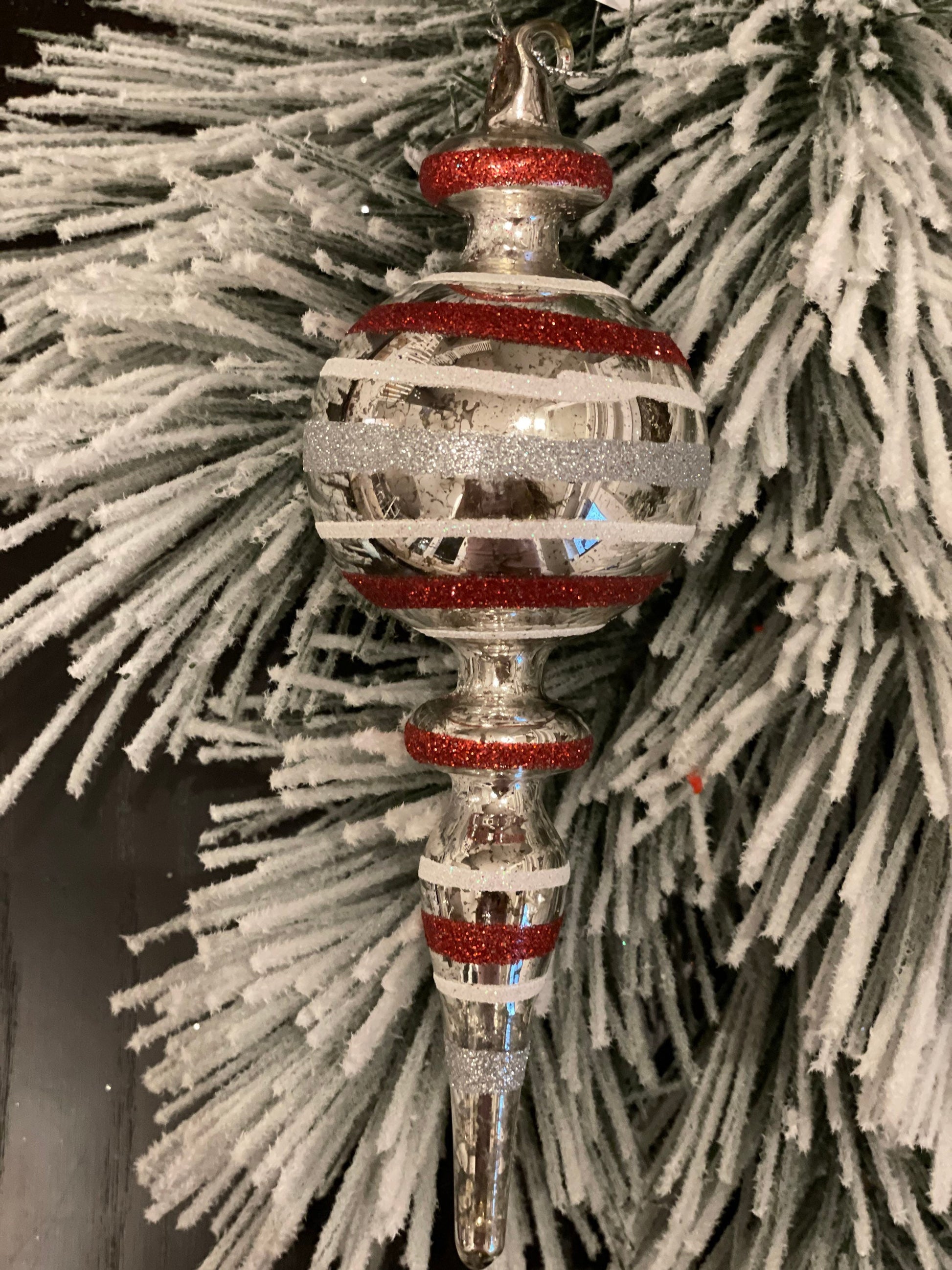 9.25" Striped glass finial ornament. Red and silver. Glitter. Beautiful!