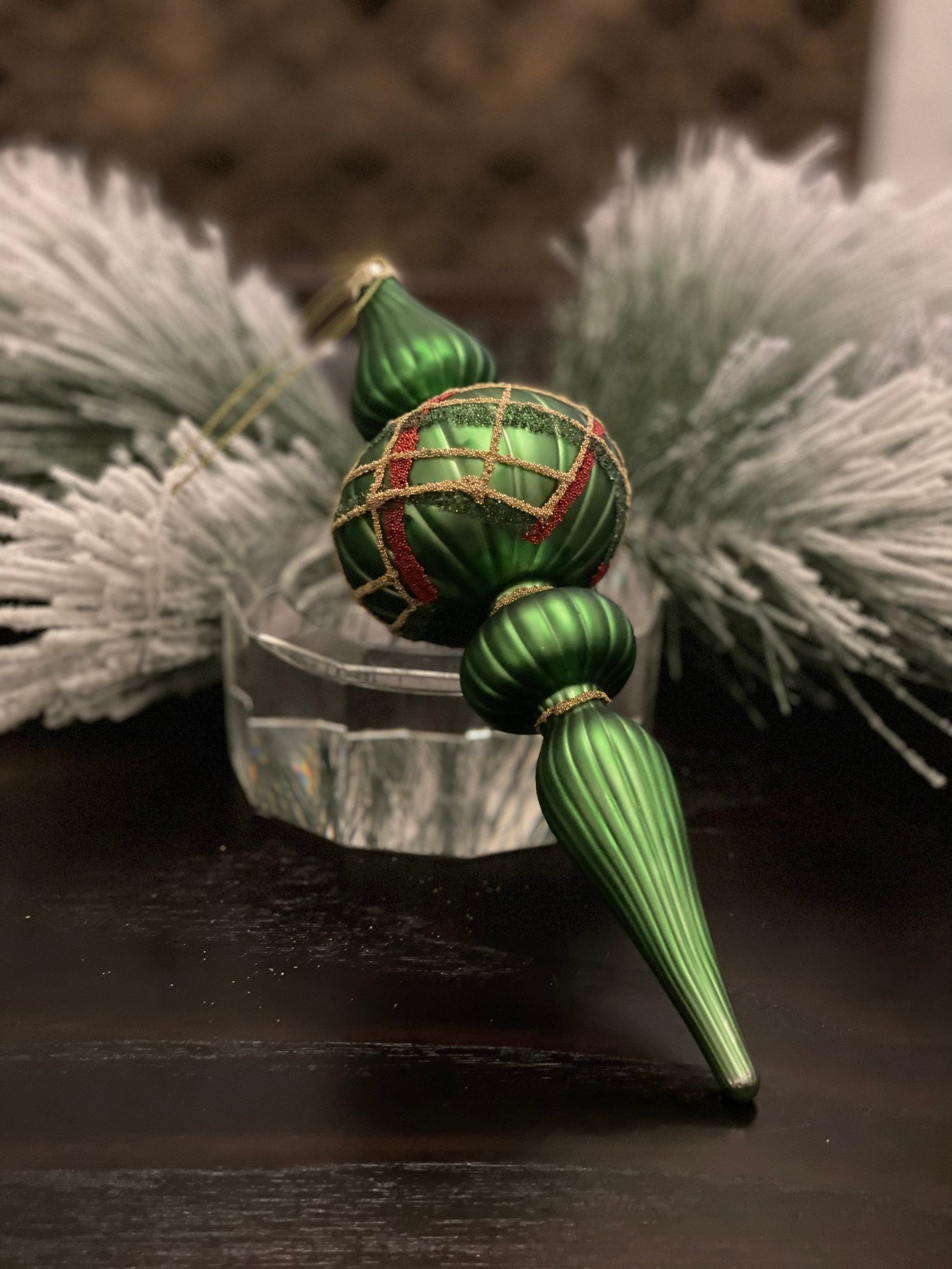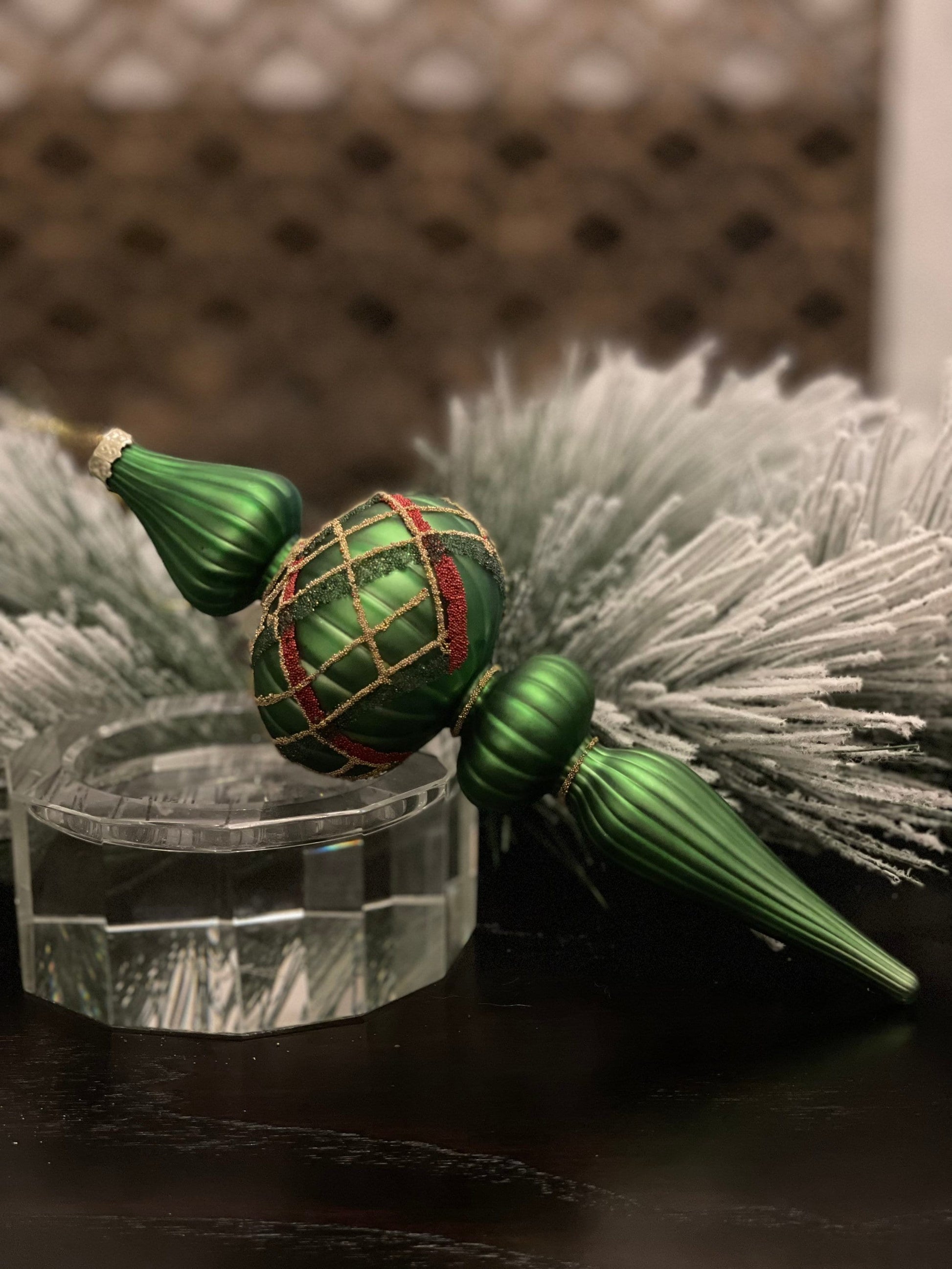 9" Mercury glass beaded plaid finial ornament. Green, red and gold.