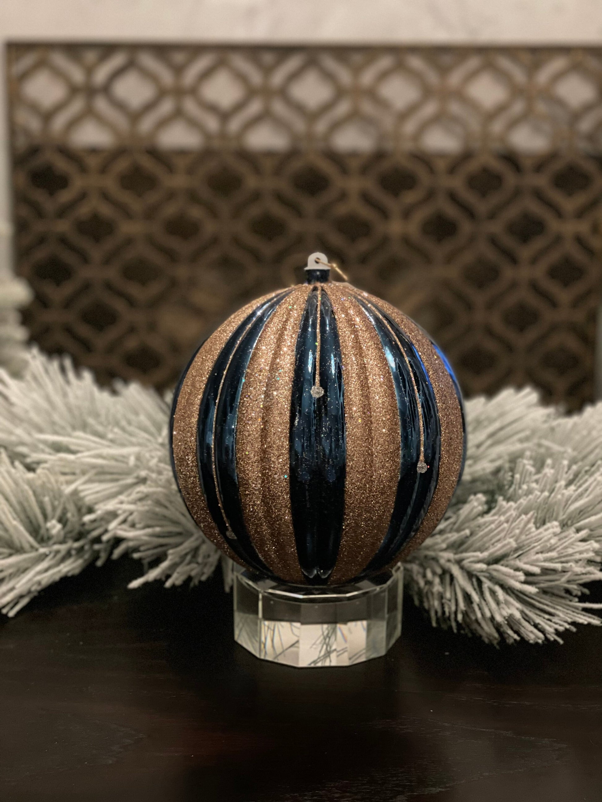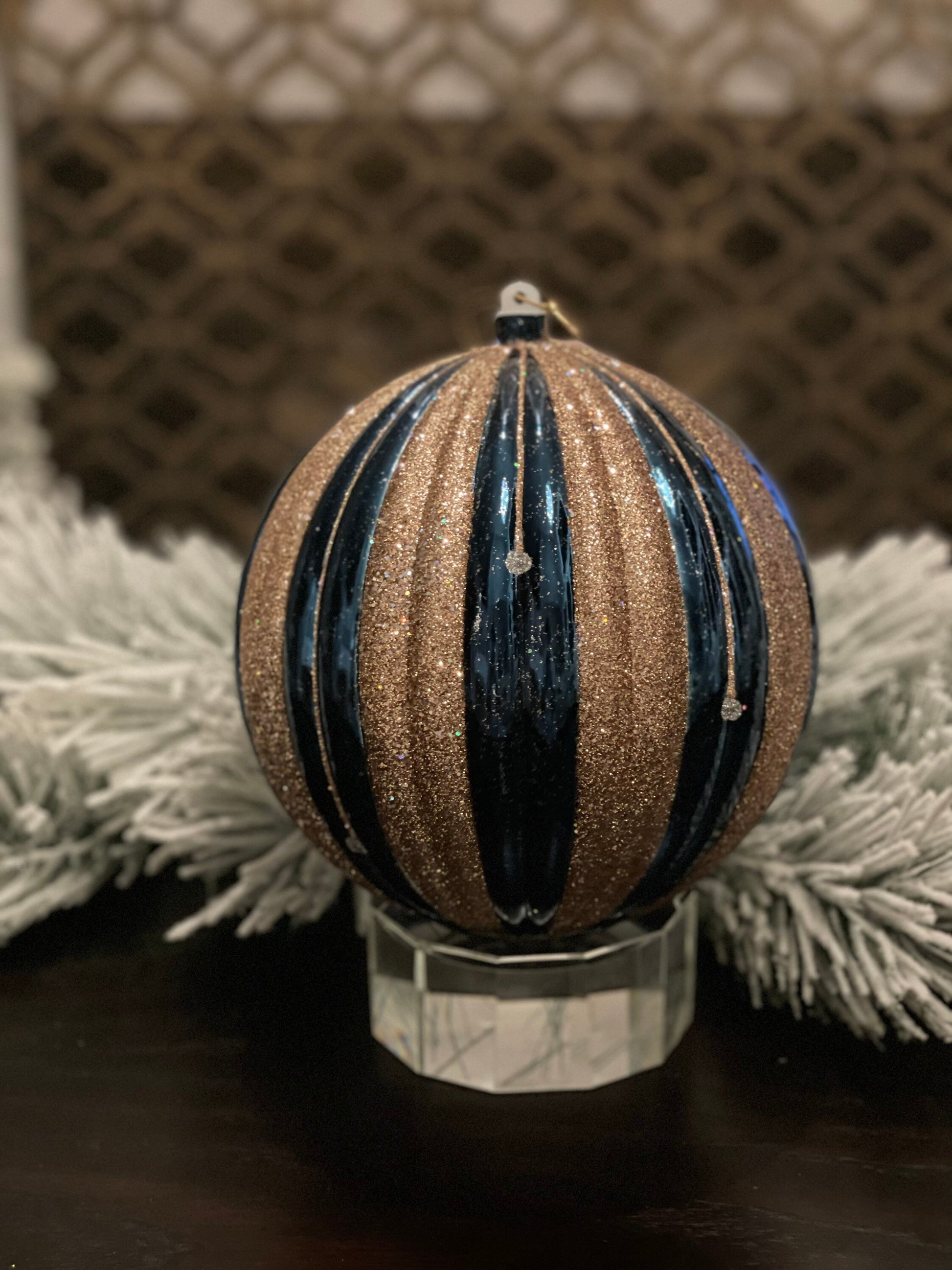 Ball 200mm/ 8” striped ball. Shiny dark blue/sand gold and silver.