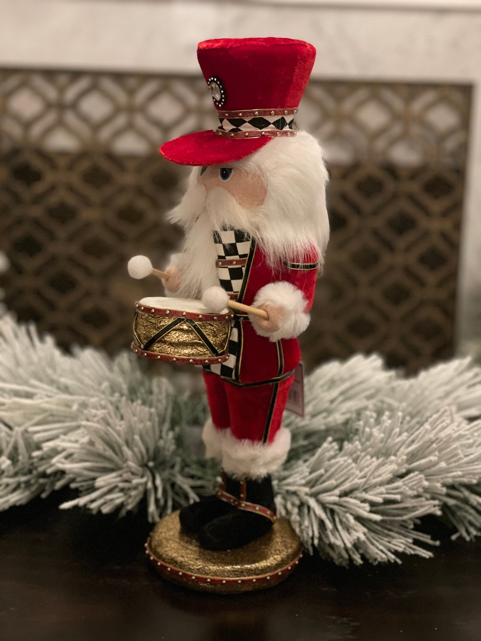 16” Nutcracker in red velvet with a checkered pattern band in his hat that matches his jacket