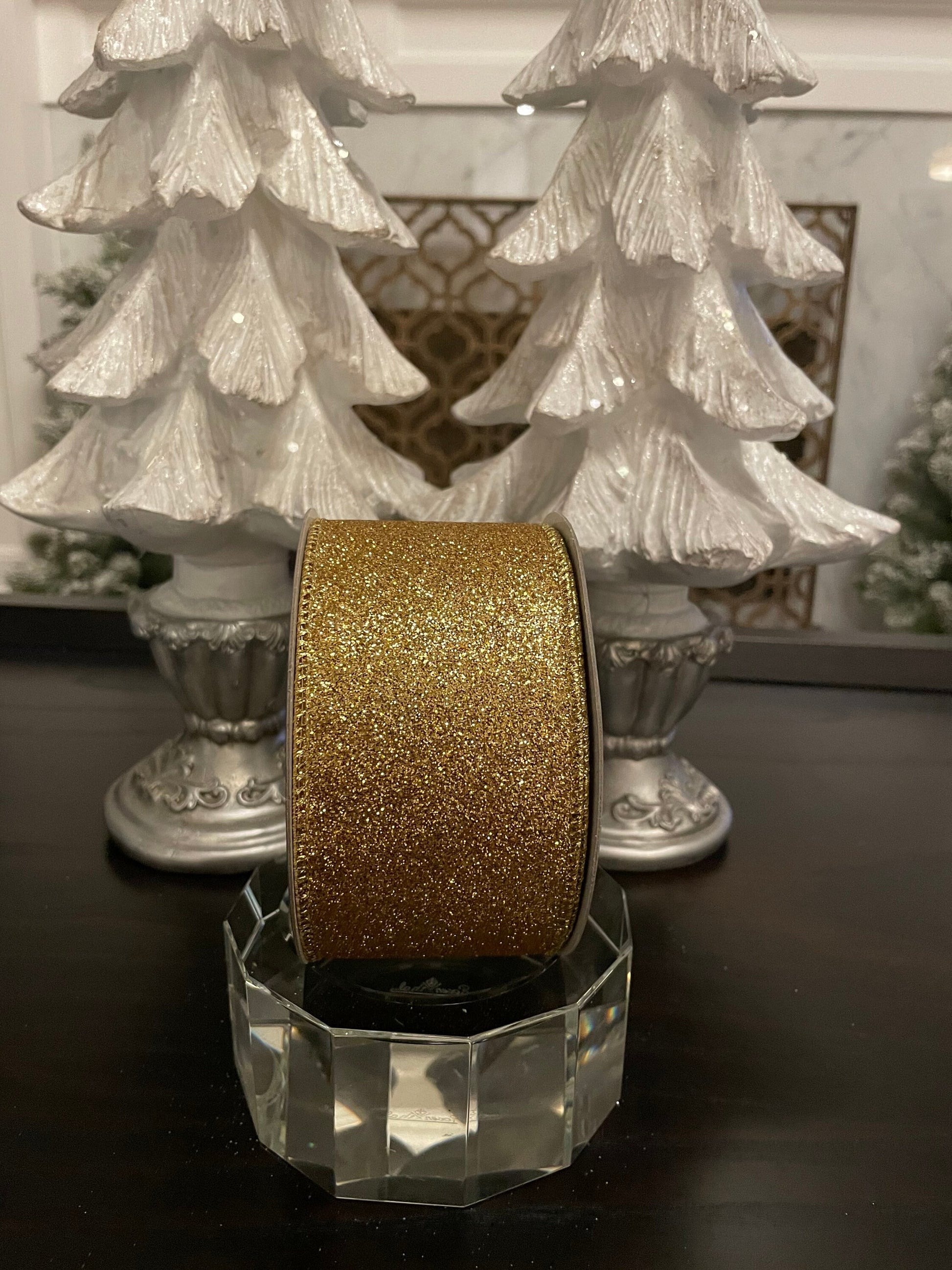Designer diamond dust gold ribbon. 2.5” x 10 yards. Wired.