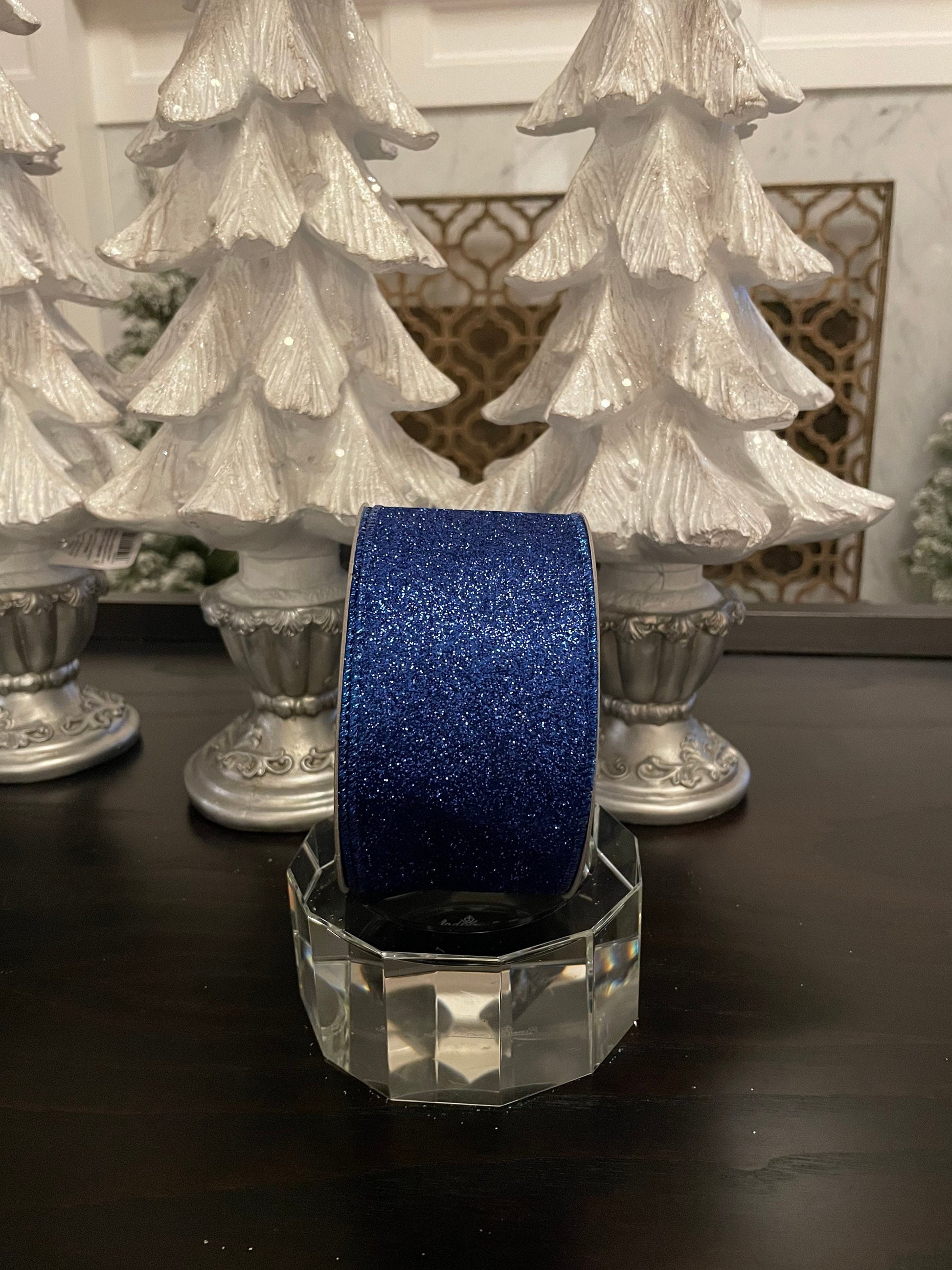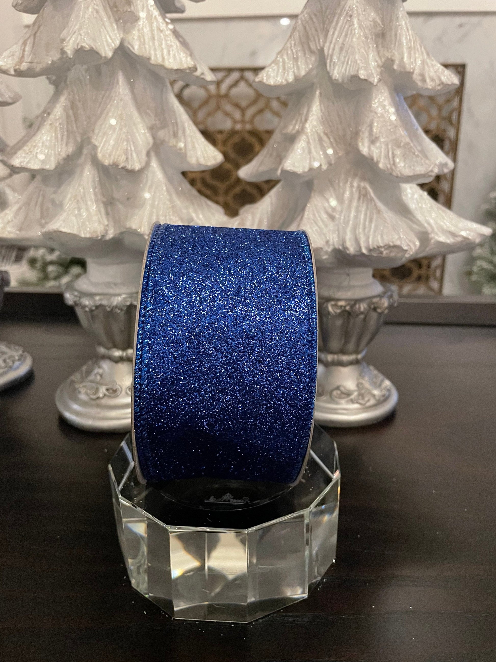 Designer diamond dust royal blue ribbon. 2.5” x 10 yards. Wired.
