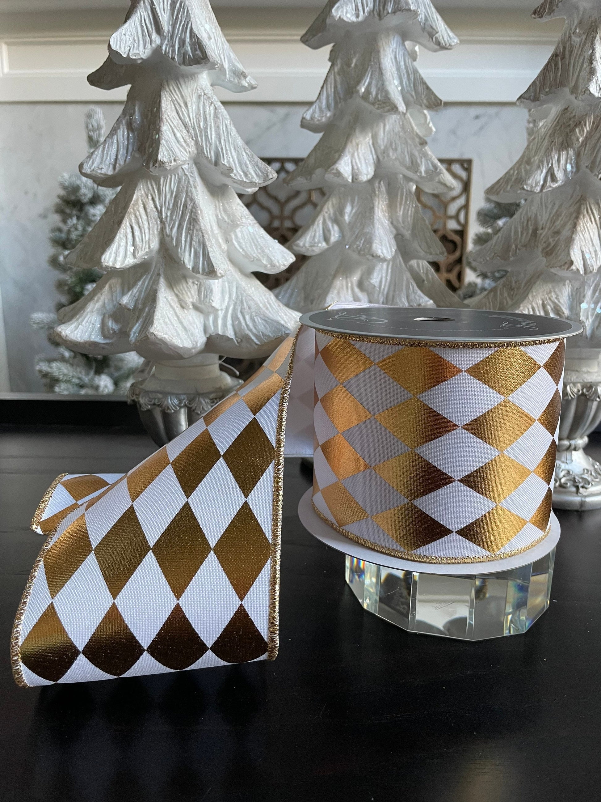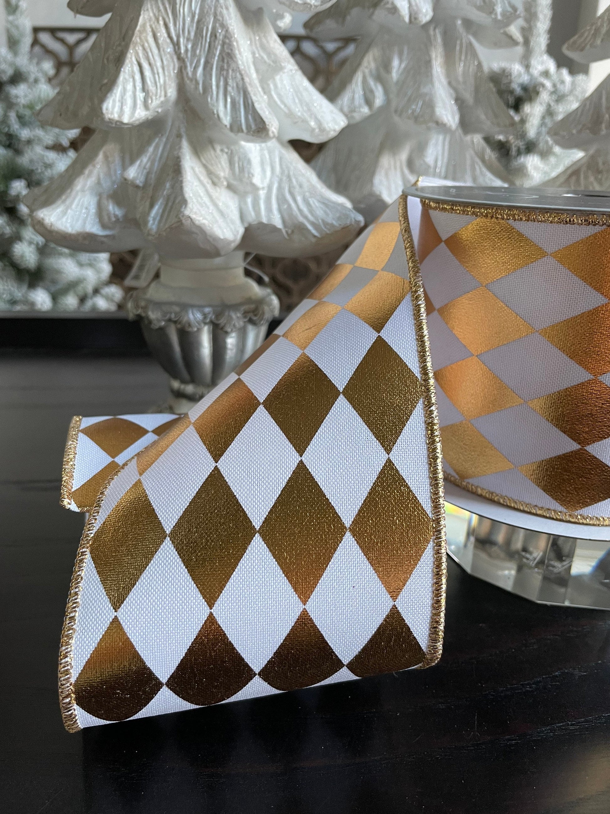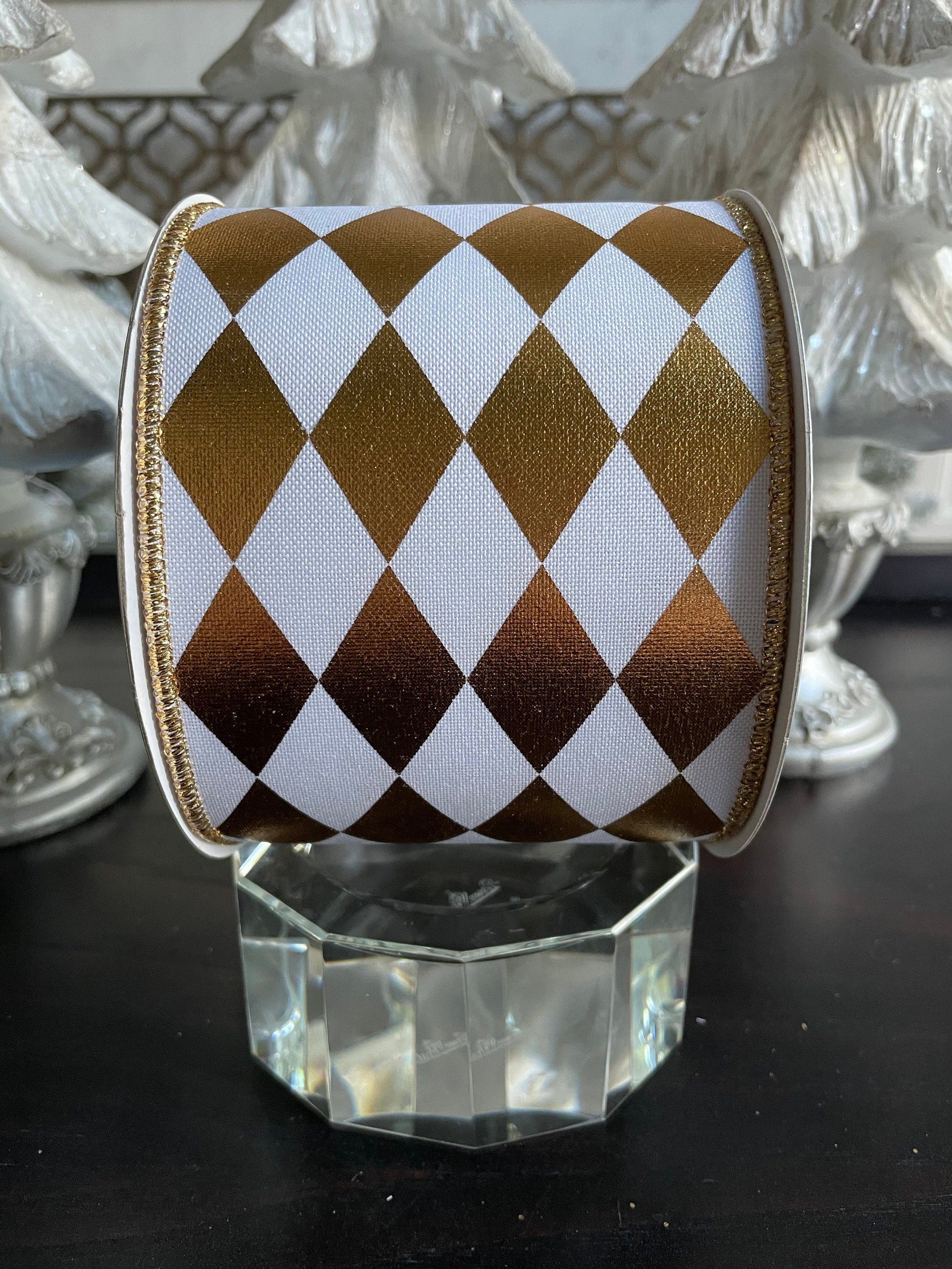 Designer Foil jester diamonds gold ribbon. 4”x 10 yards. Wired.