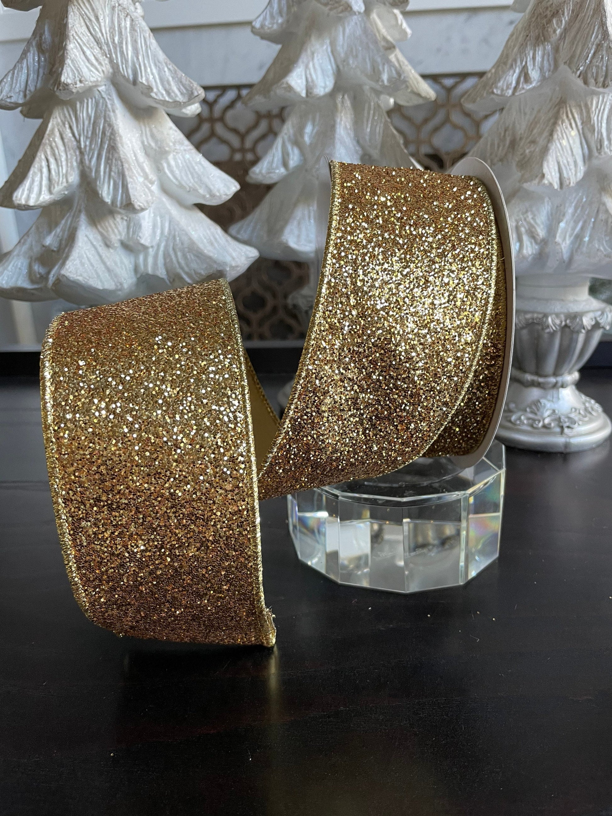 Designer glitter magic gold ribbon. 2.5”x 10 yards. Wired.
