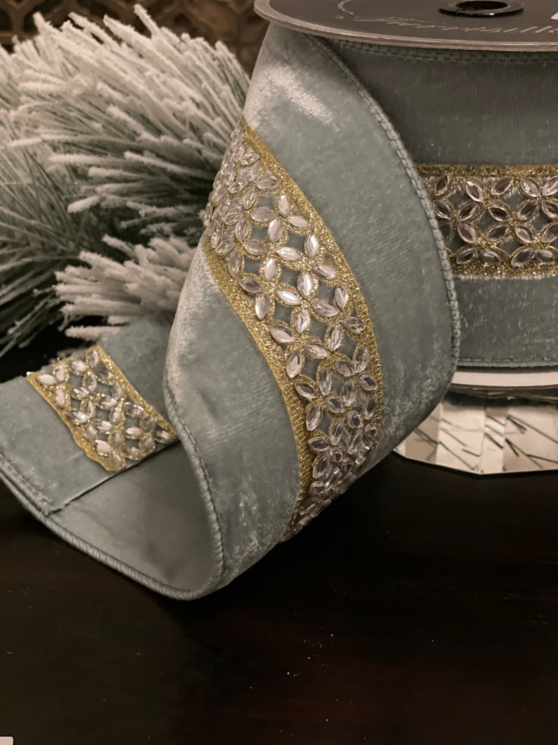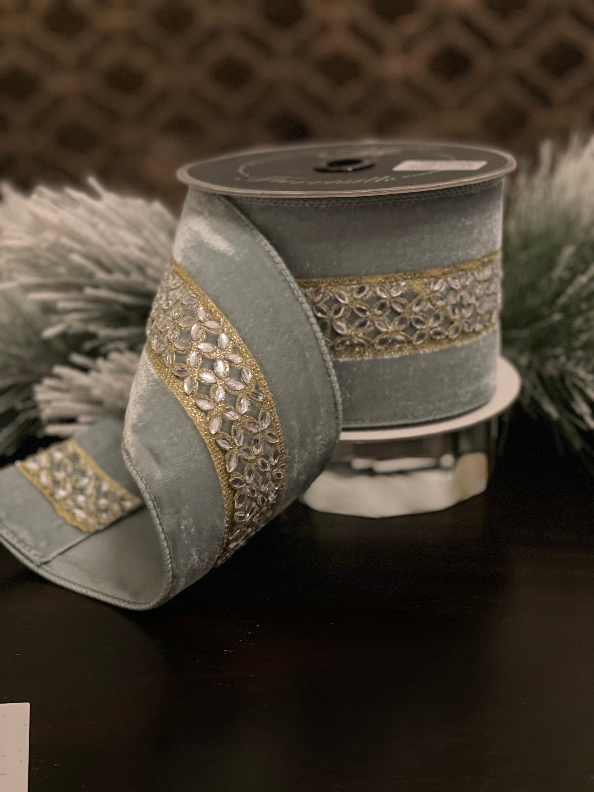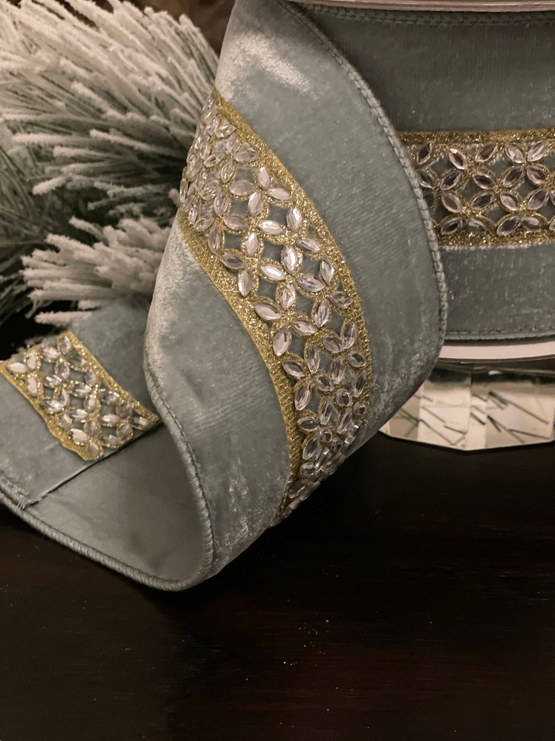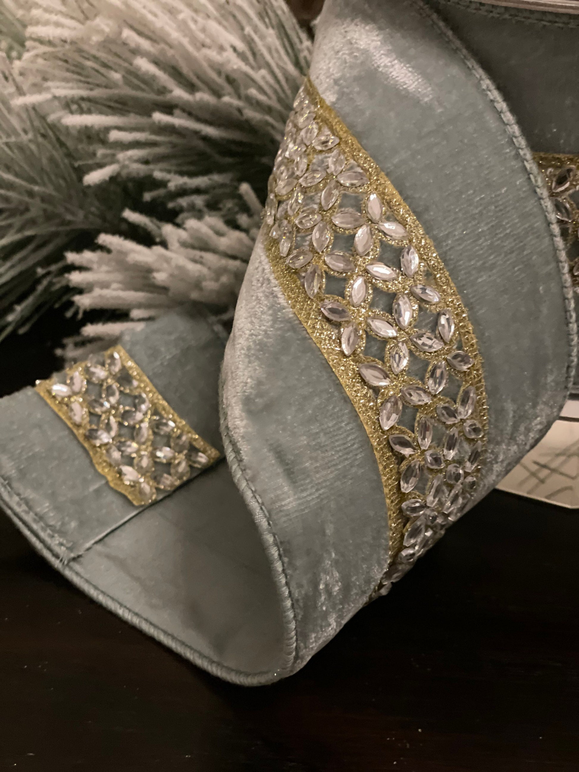 Designer jeweled lace light blue and platinum wired ribbon 4” x 5 yards.*
