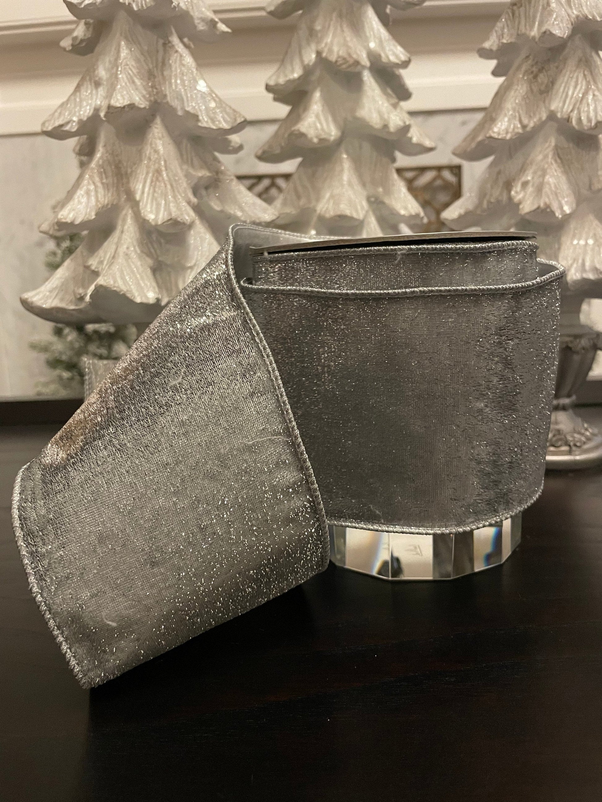 Designer lame velvet silver ribbon. 4”x 10 yards. Wired.