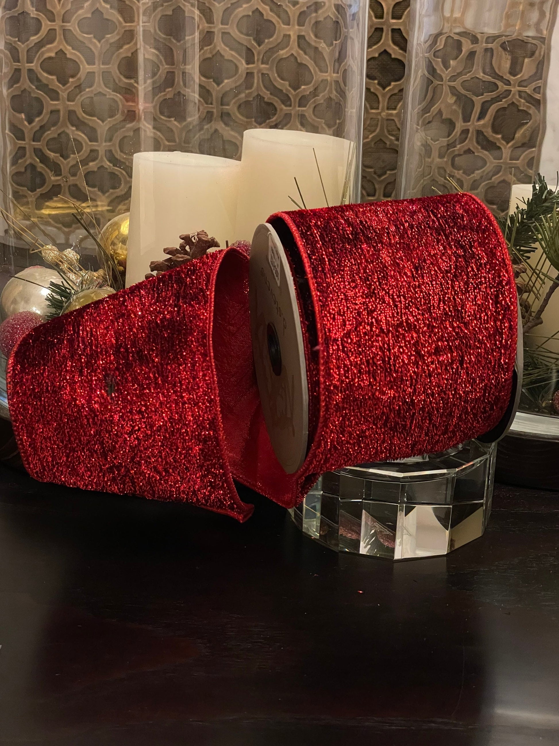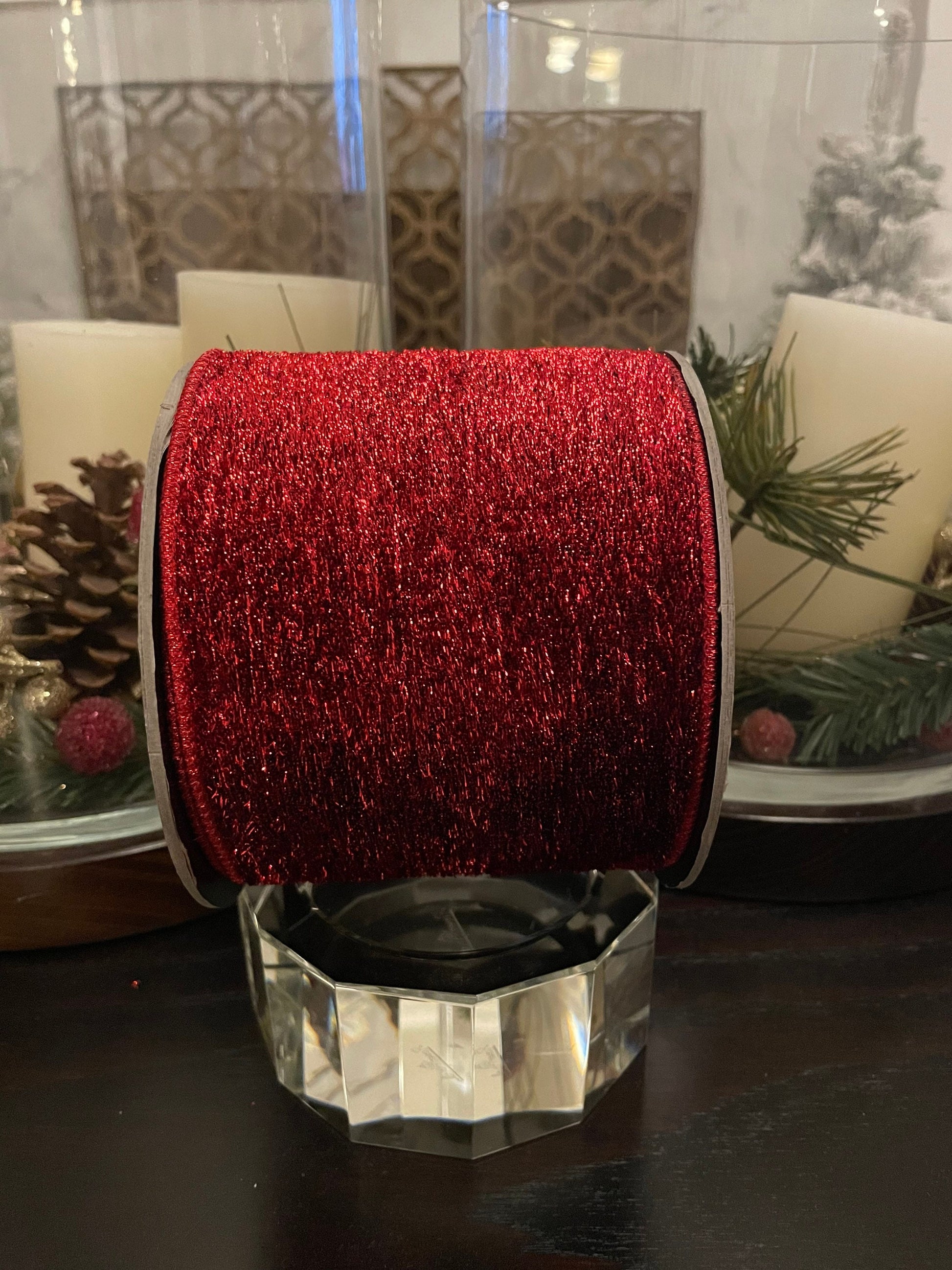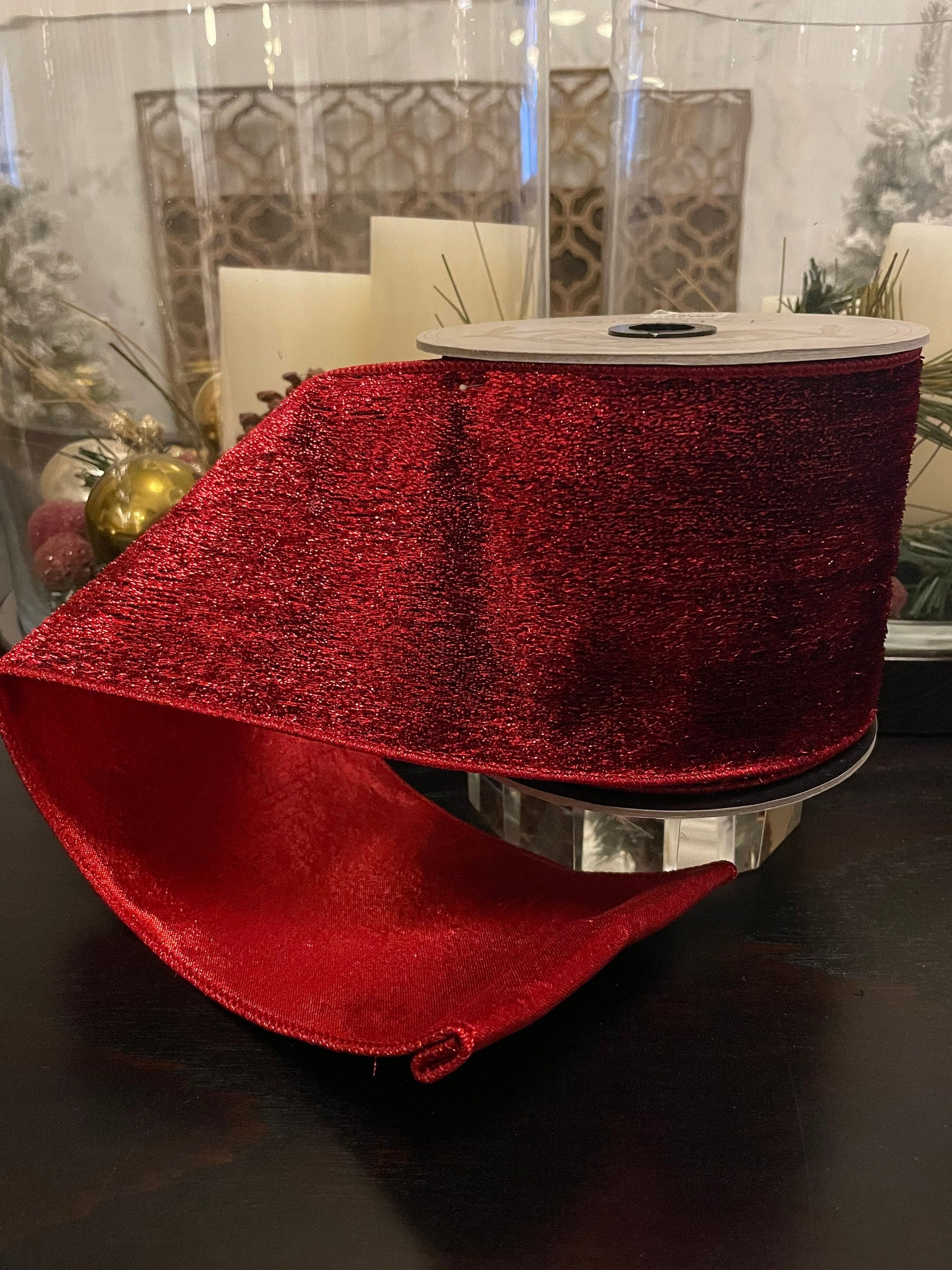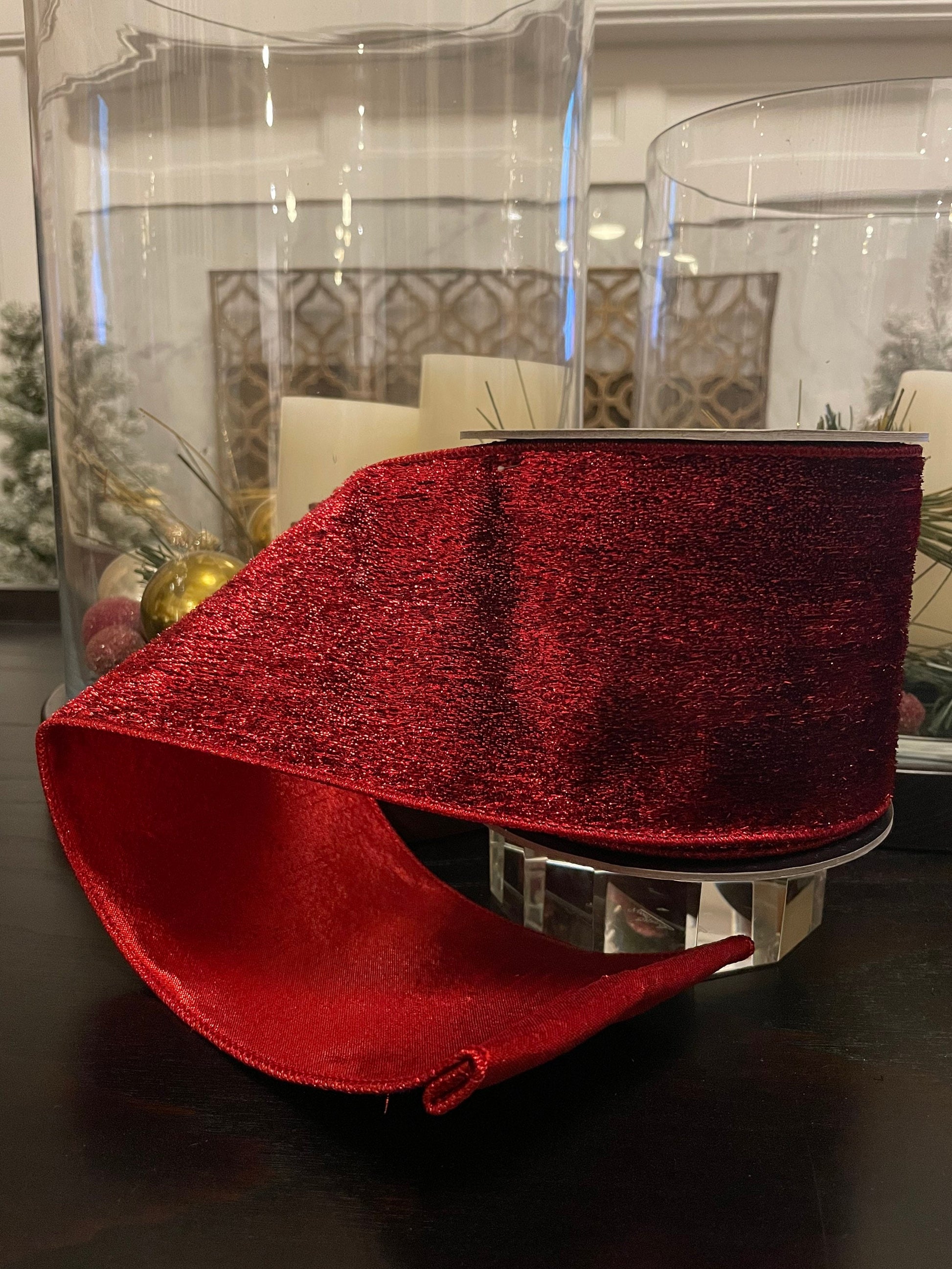 Designer metallic velvet red ribbon. 4”x 10 yards. Wired.*