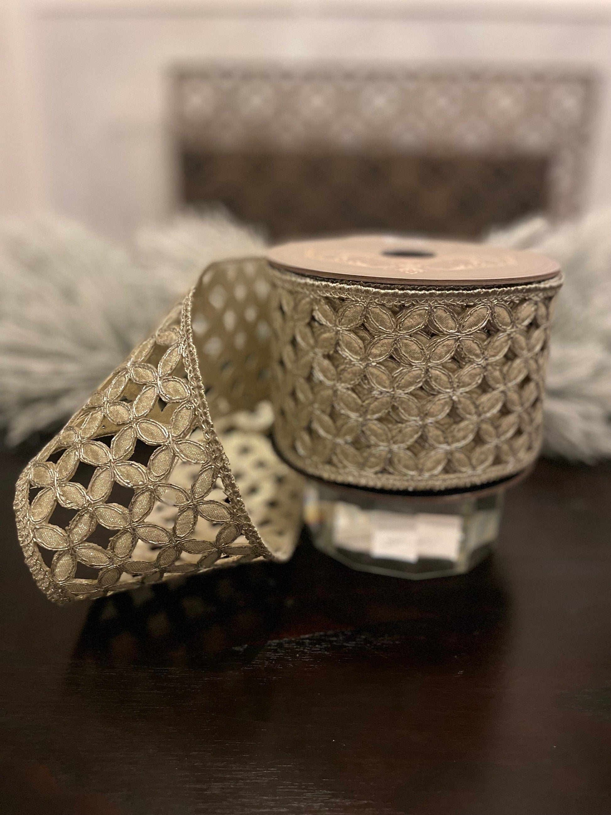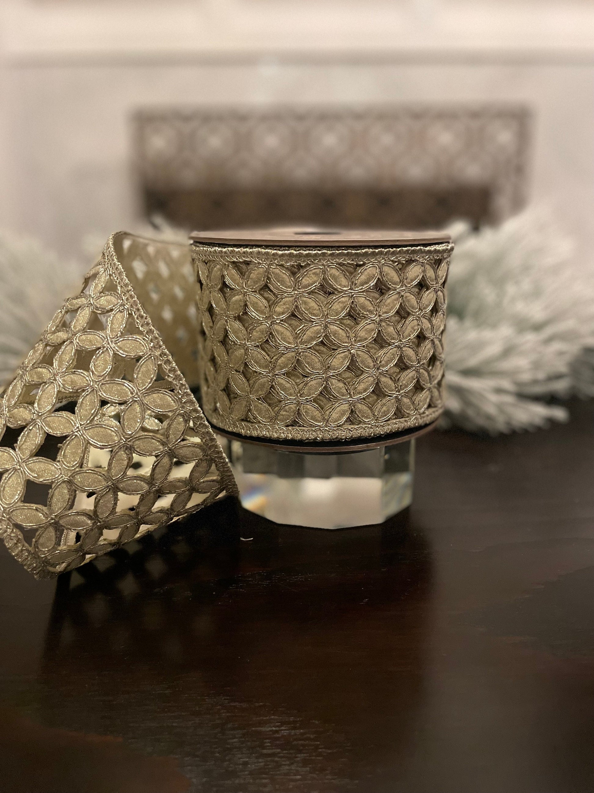 Designer platinum metallic floral ribbon. 4”x 10 yards. Wired. D. Stevens.