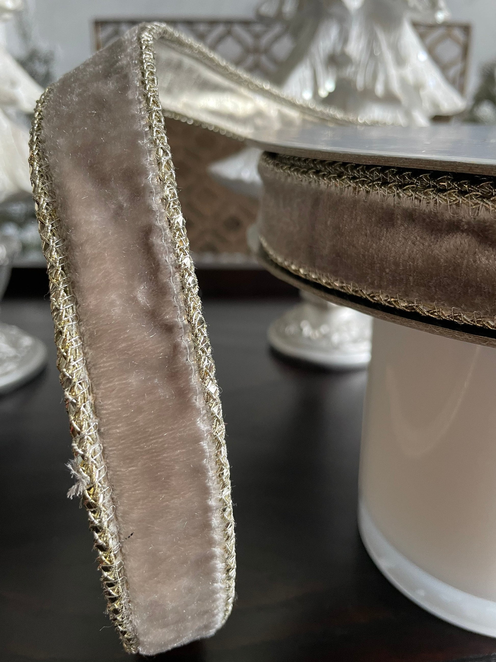 Designer ribbon, highest quality manufacturer. Gray velvet with platinum accents.