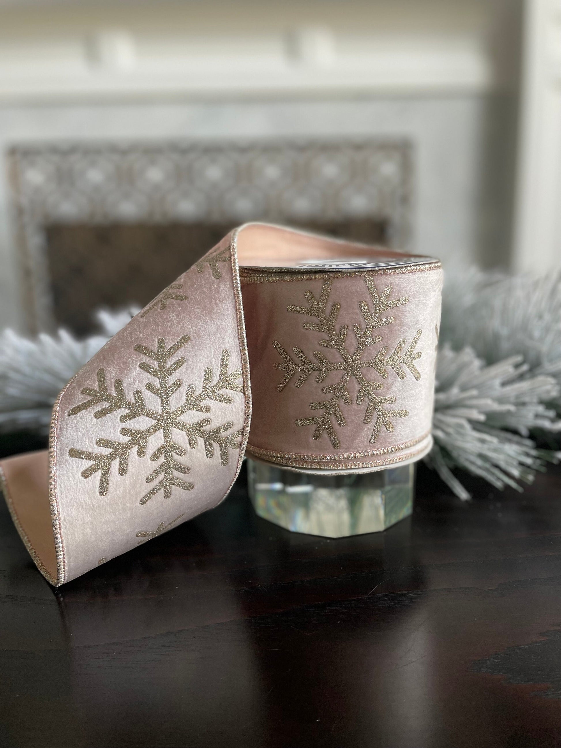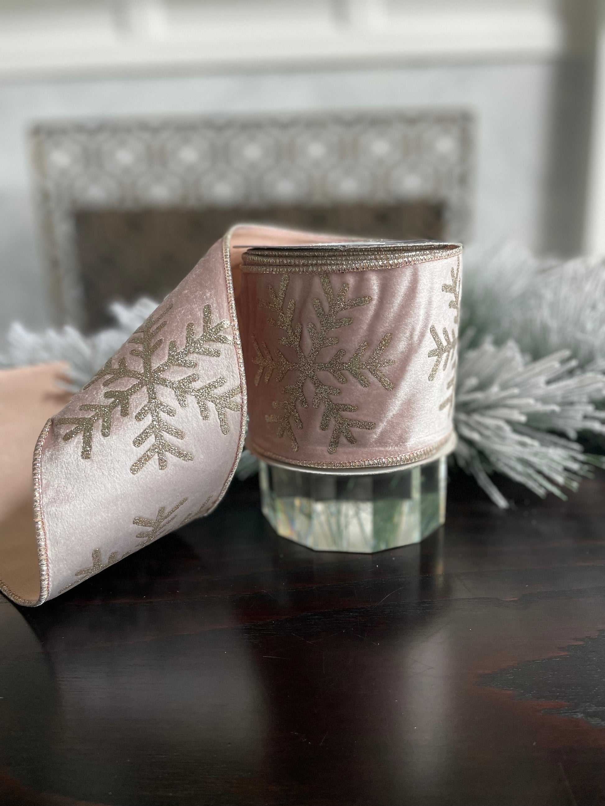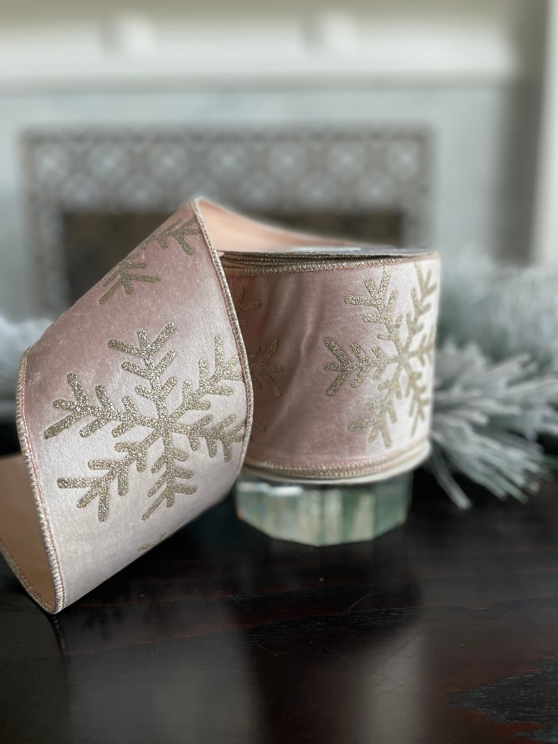 Designer ribbon, highest quality manufacturer. Velvet rose/soft pink with glitter snowflakes.