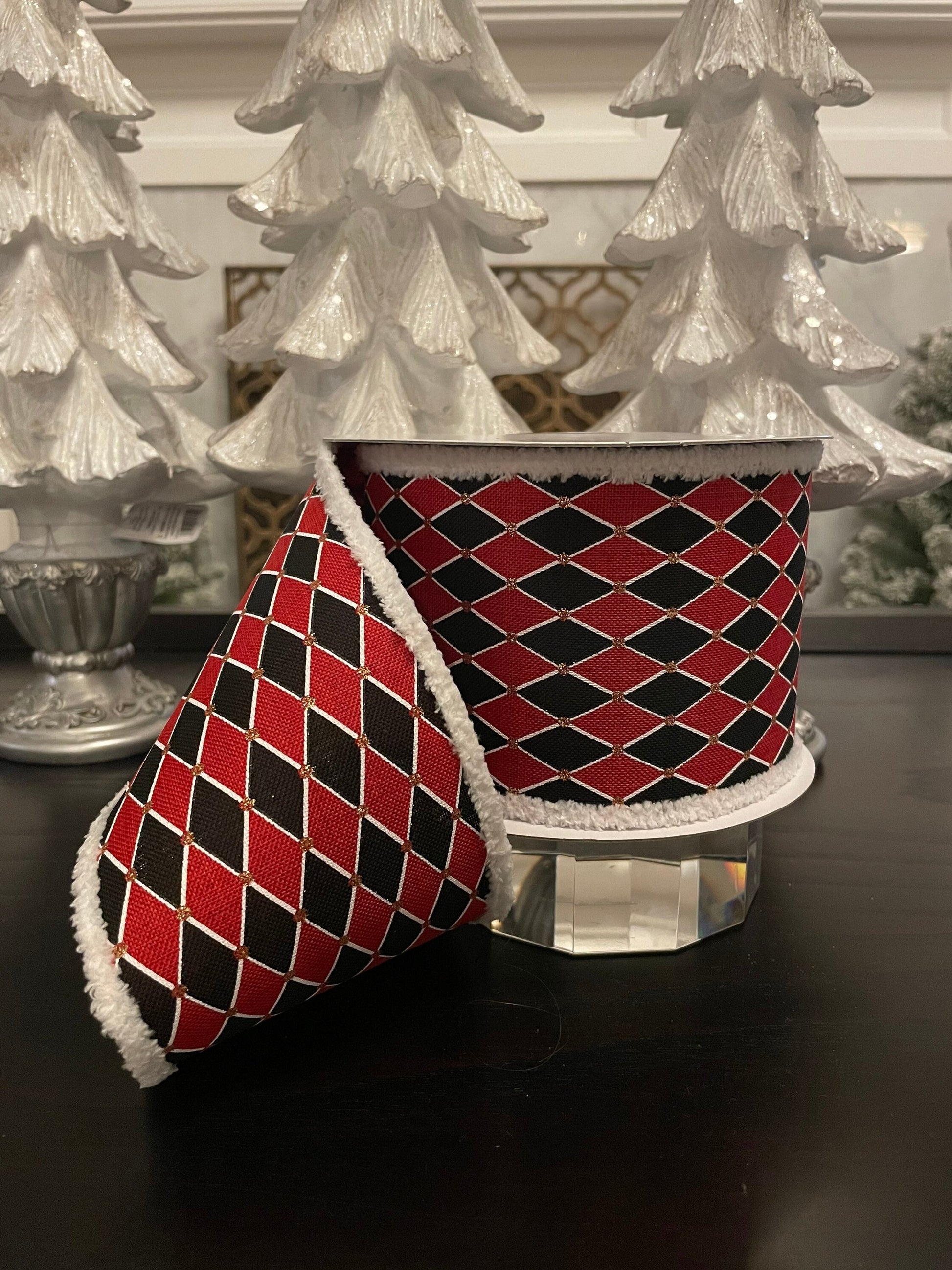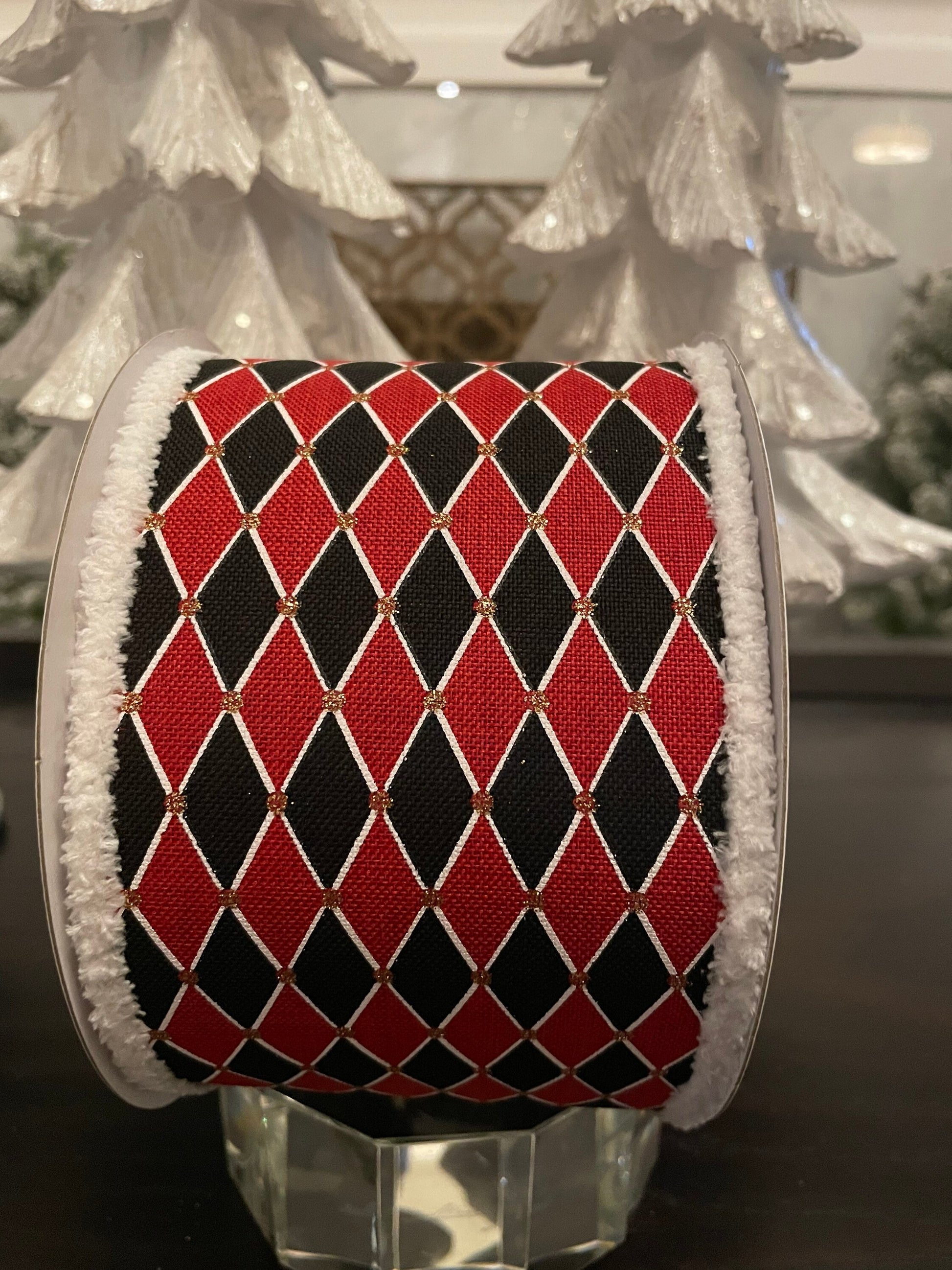 Harlequin outlined black and red ribbon. 4”x 10 yards. Wired.*
