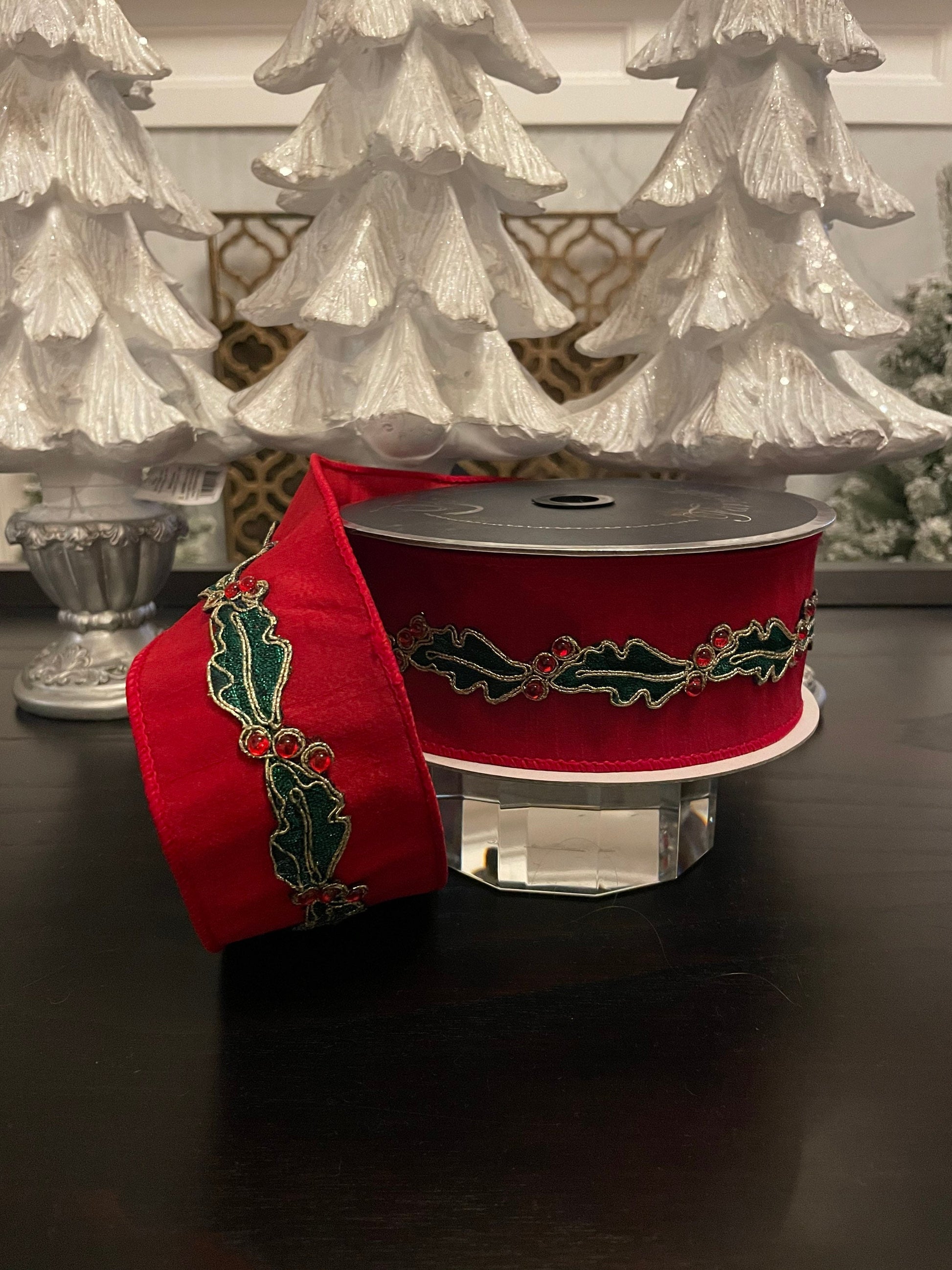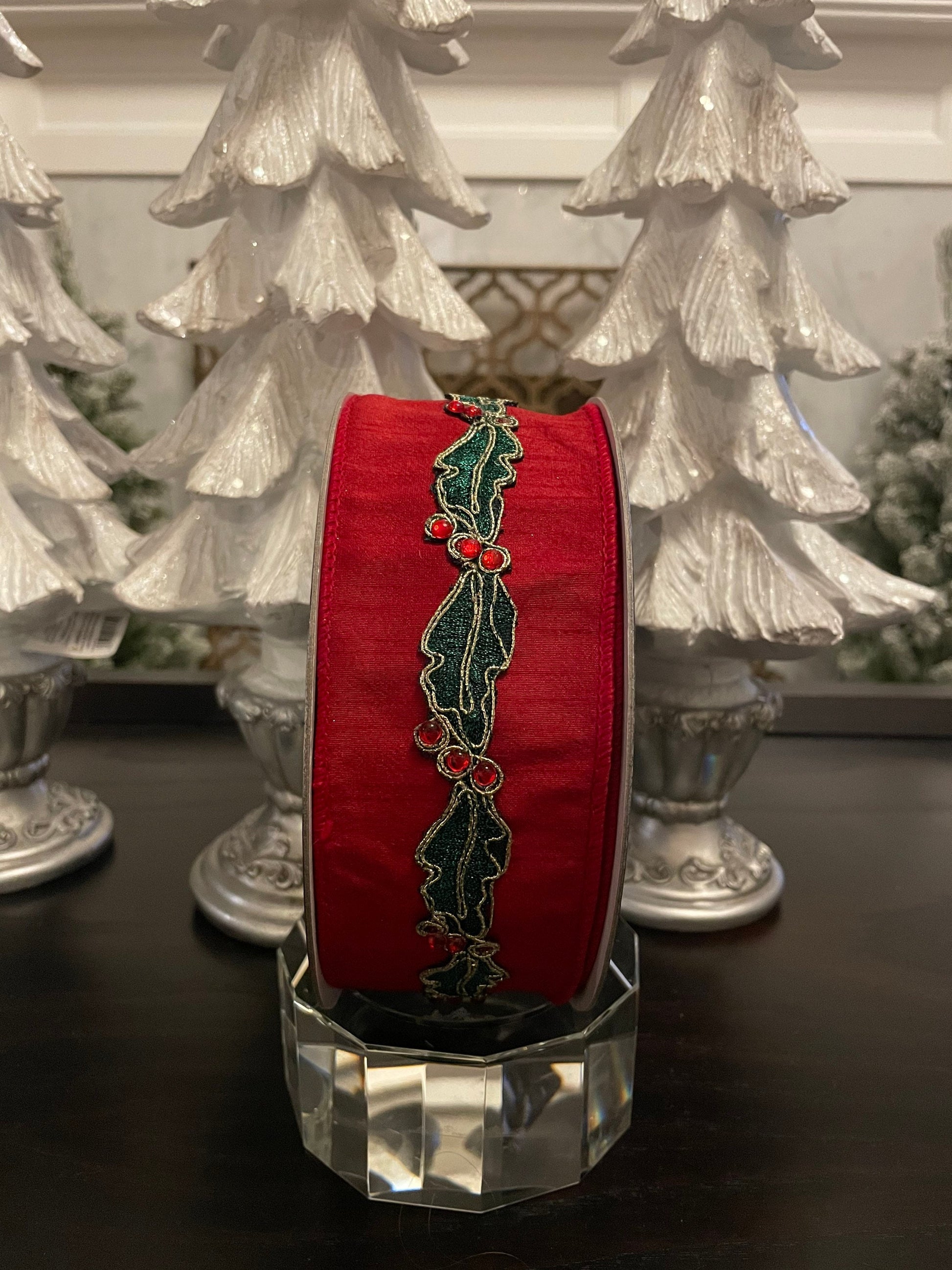 Designer Holly border red ribbon. 2.5”x 10 yards. Wired
