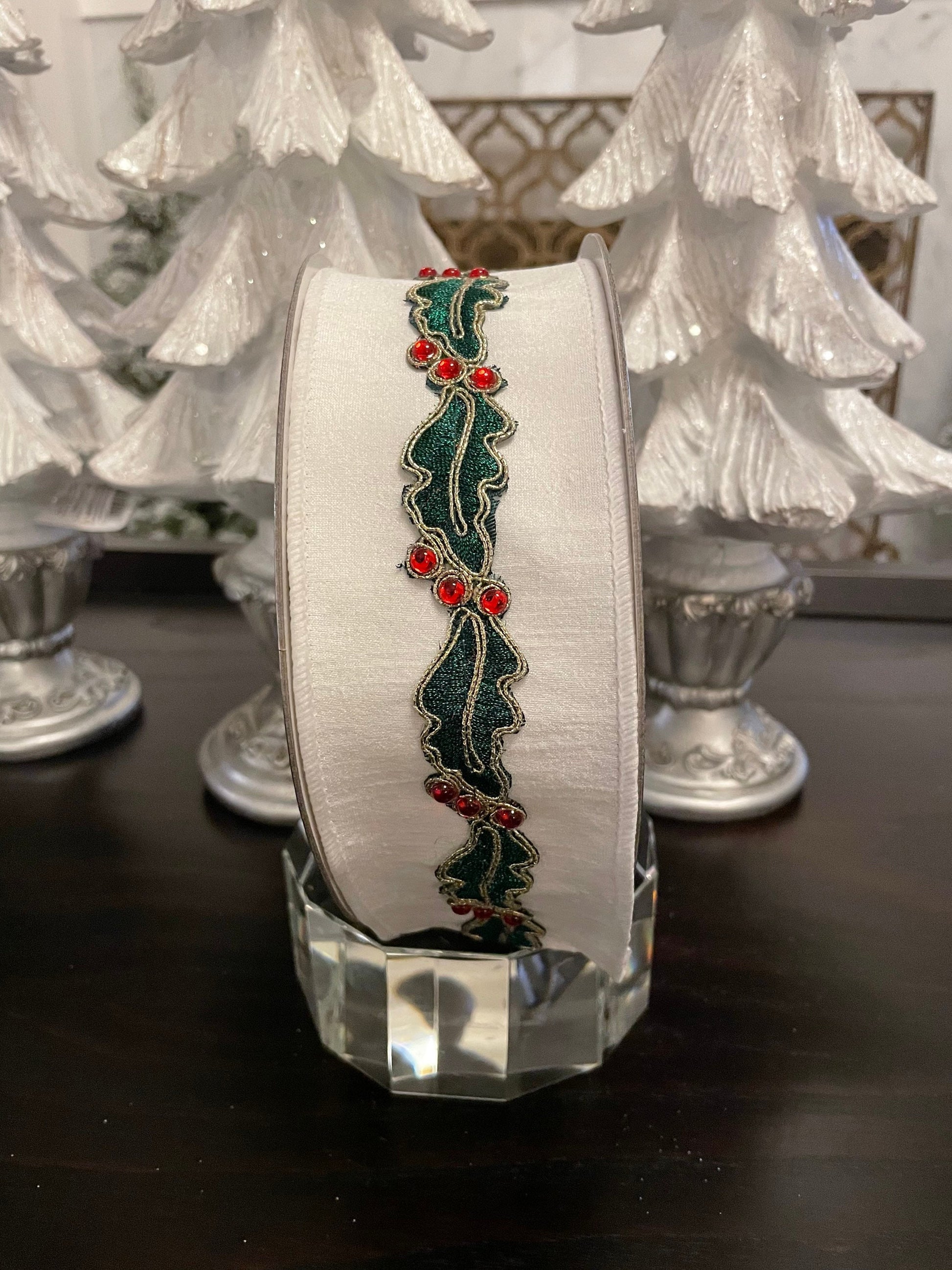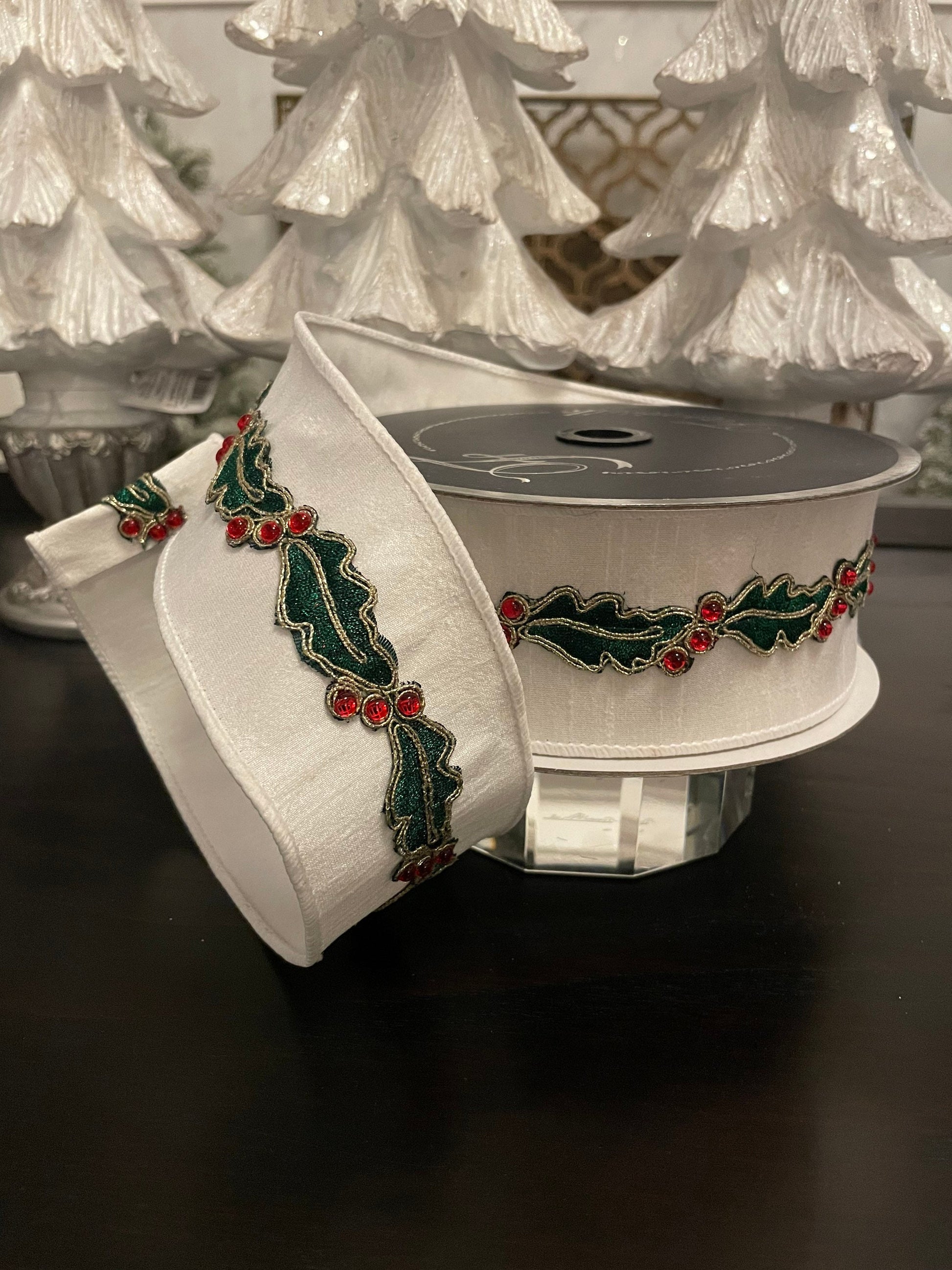 Designer Holly border white ribbon. 2.5”x 10 yards. Wired