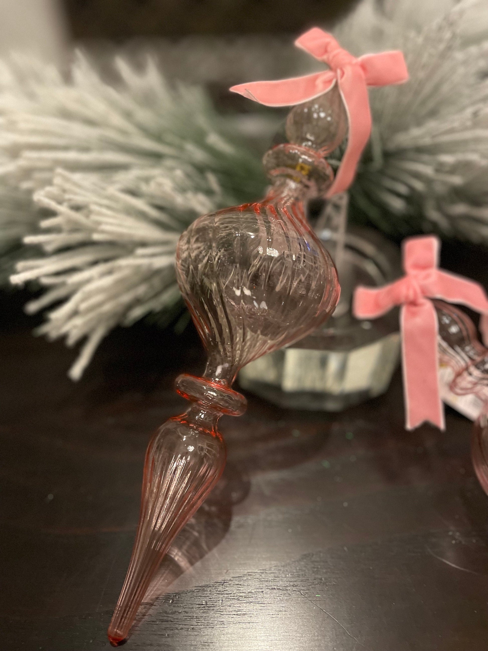 Set of 2. 11” Clear pink blown glass finial ornament.